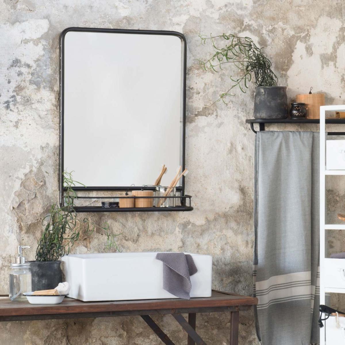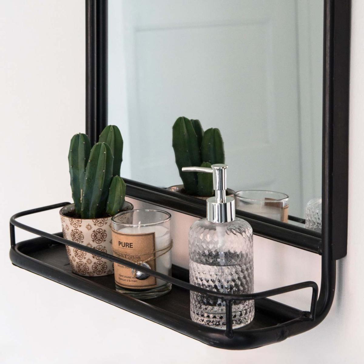 A sleek rectangular mirror crafted from black metal with curved edges and a handy shelf, perfect for storing your bits and bobs.
