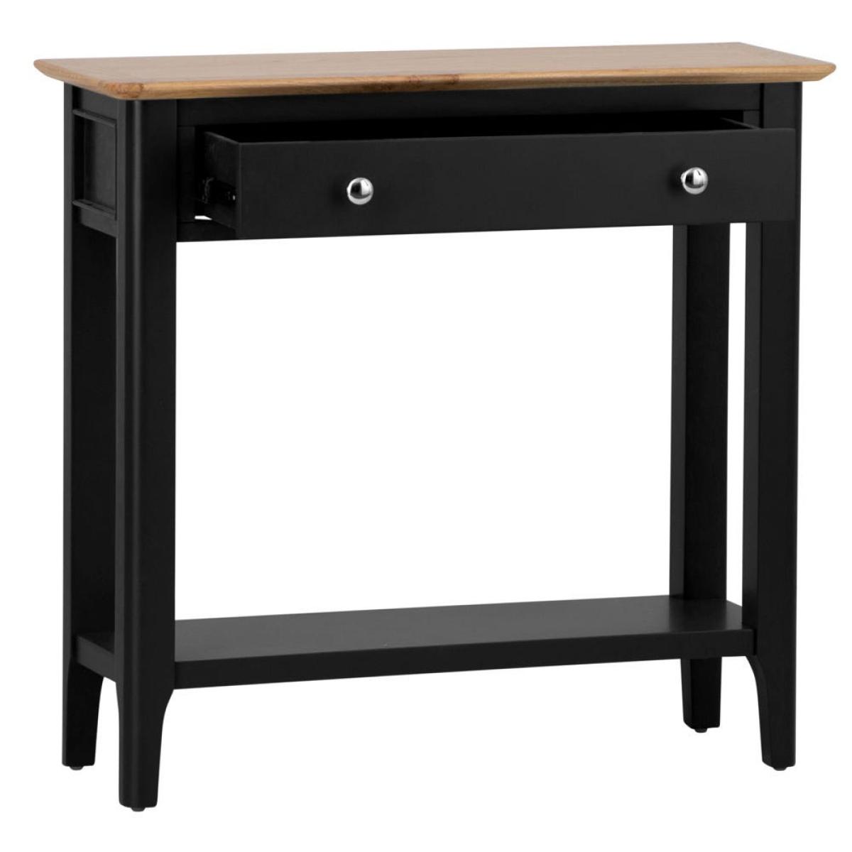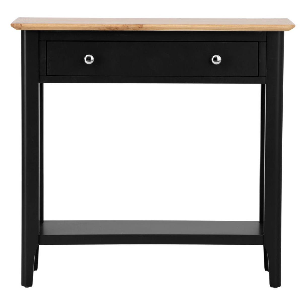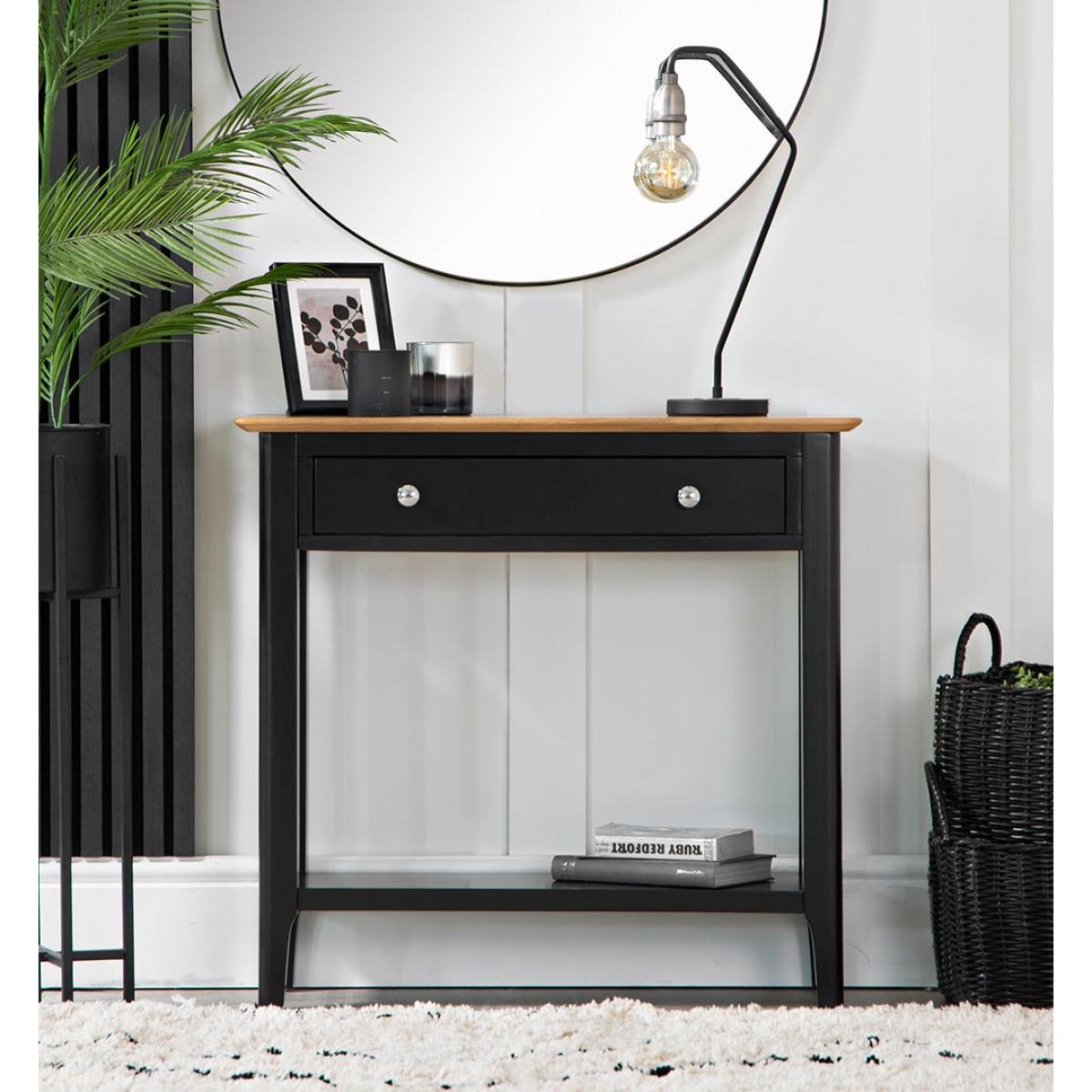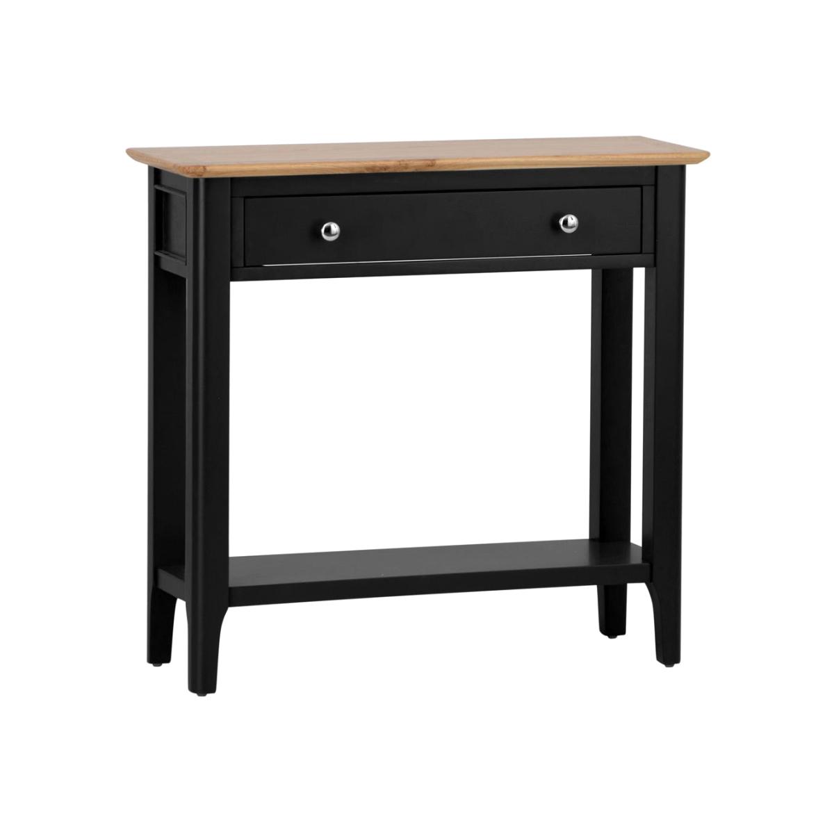 I love this piece for its versatile colour and clean lines, which make it adaptable to a range of interior styles. The black painted finish instantly adds a touch of sophistication, while the natural wooden top keeps it grounding and warm. It works particularly well in contemporary, industrial, or Scandinavian interiors where its sleek appearance can be showcased alongside statement decor or greenery. Practical styling tips include using it as an entryway console, topped with a mirror and a small lamp, or as a side table in a living room, layered with books and decorative objects to create a curated look. Its single drawer provides handy storage for keys or smaller essentials, making it both functional and stylish.