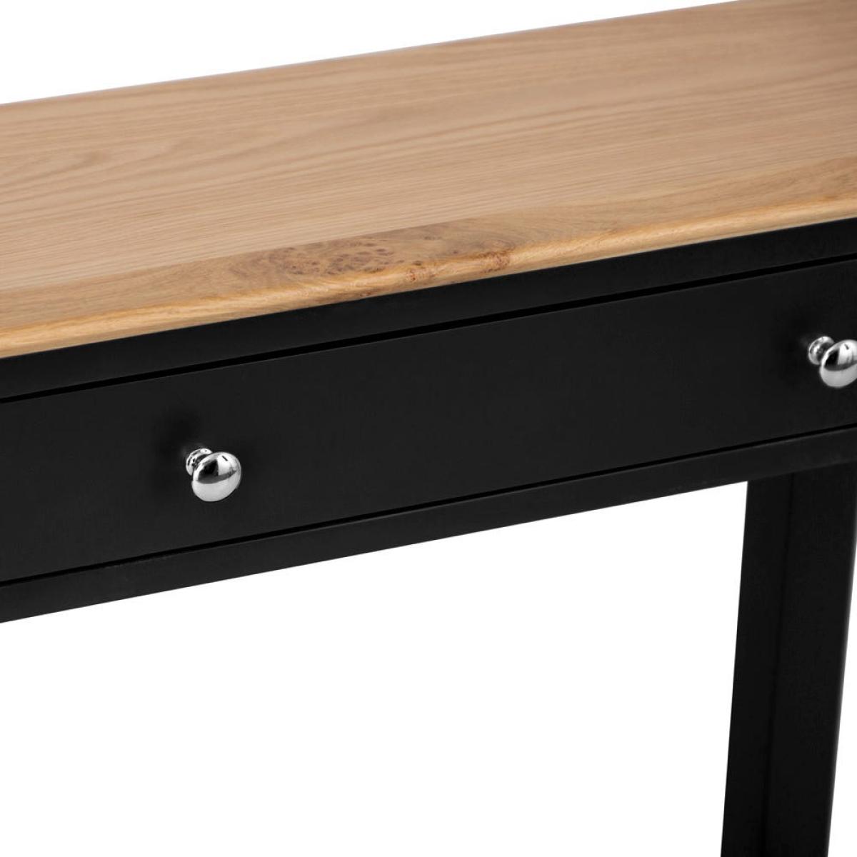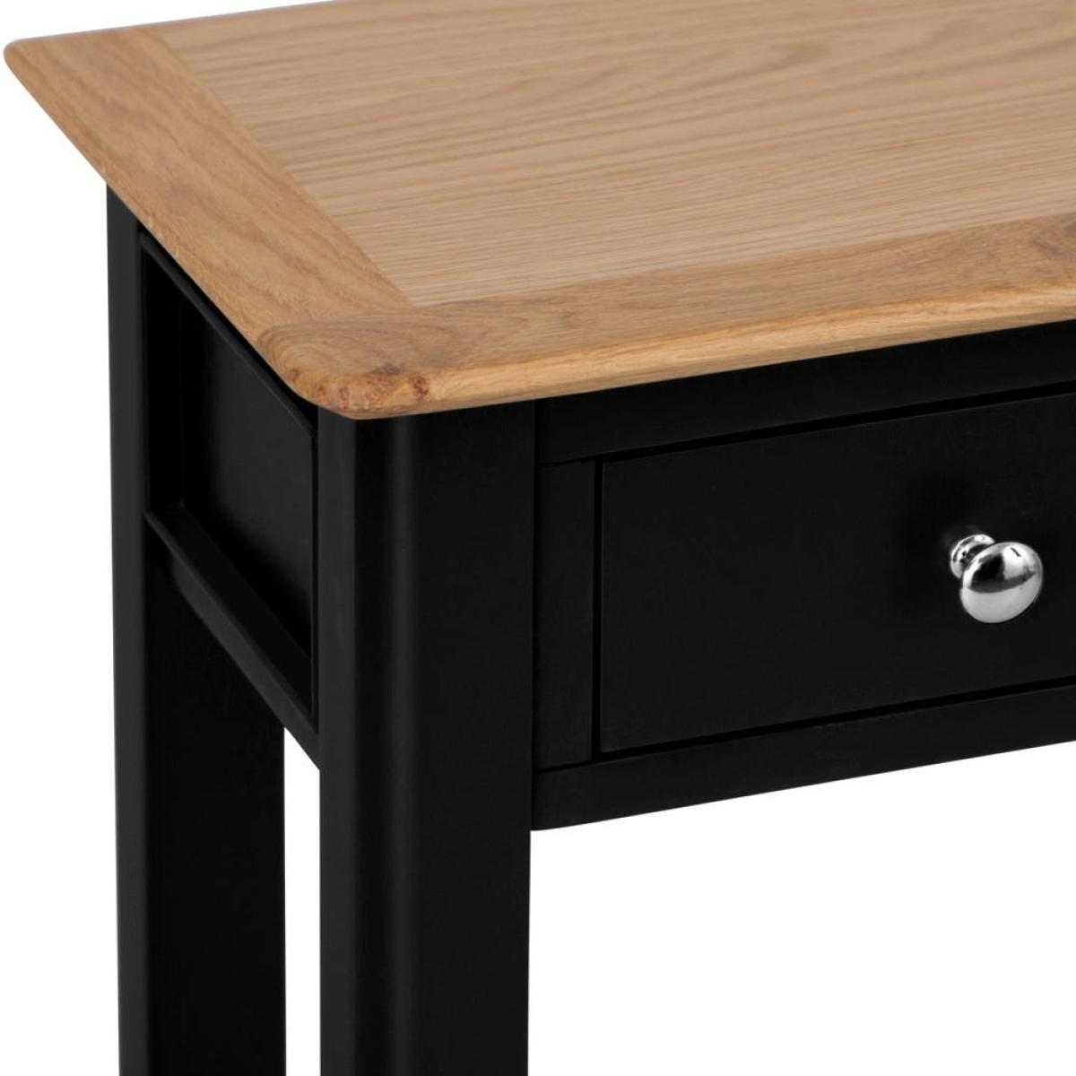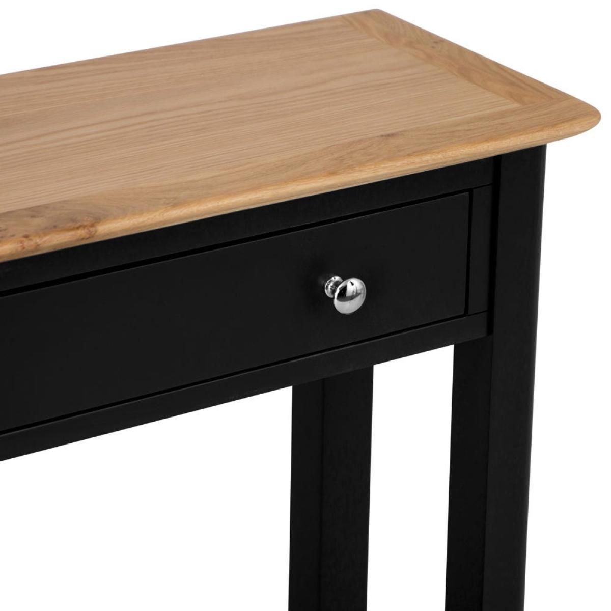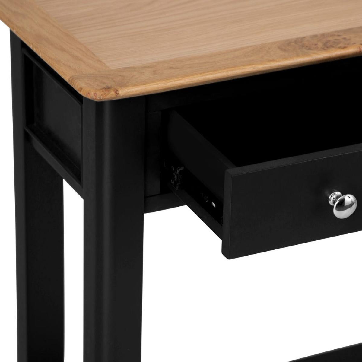 I love this piece for its versatile colour and clean lines, which make it adaptable to a range of interior styles. The black painted finish instantly adds a touch of sophistication, while the natural wooden top keeps it grounding and warm. It works particularly well in contemporary, industrial, or Scandinavian interiors where its sleek appearance can be showcased alongside statement decor or greenery. Practical styling tips include using it as an entryway console, topped with a mirror and a small lamp, or as a side table in a living room, layered with books and decorative objects to create a curated look. Its single drawer provides handy storage for keys or smaller essentials, making it both functional and stylish.