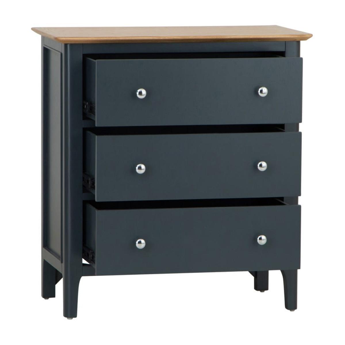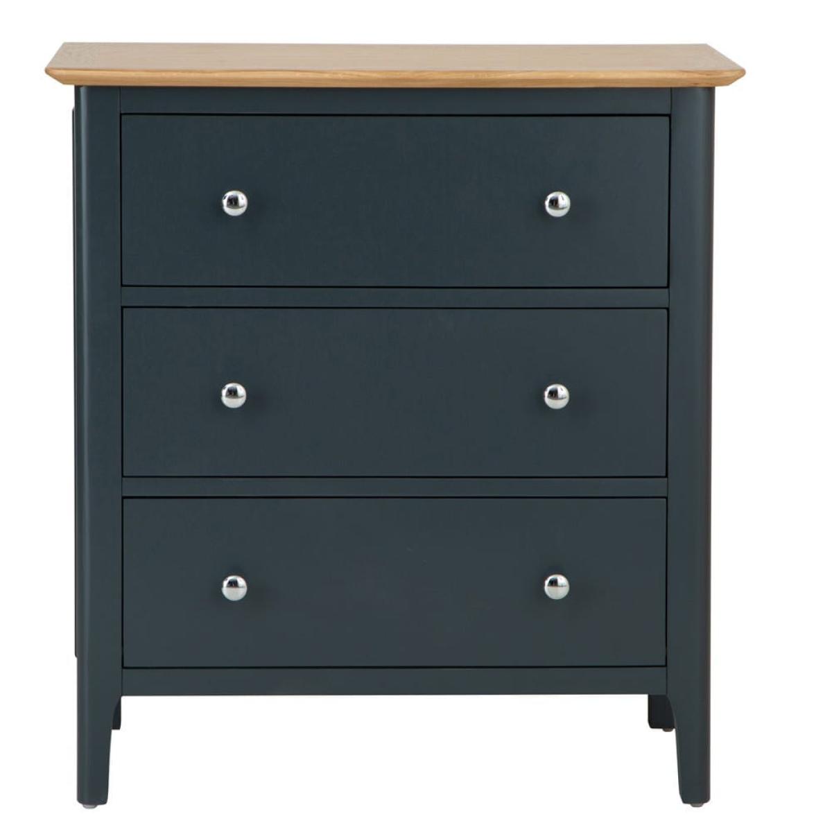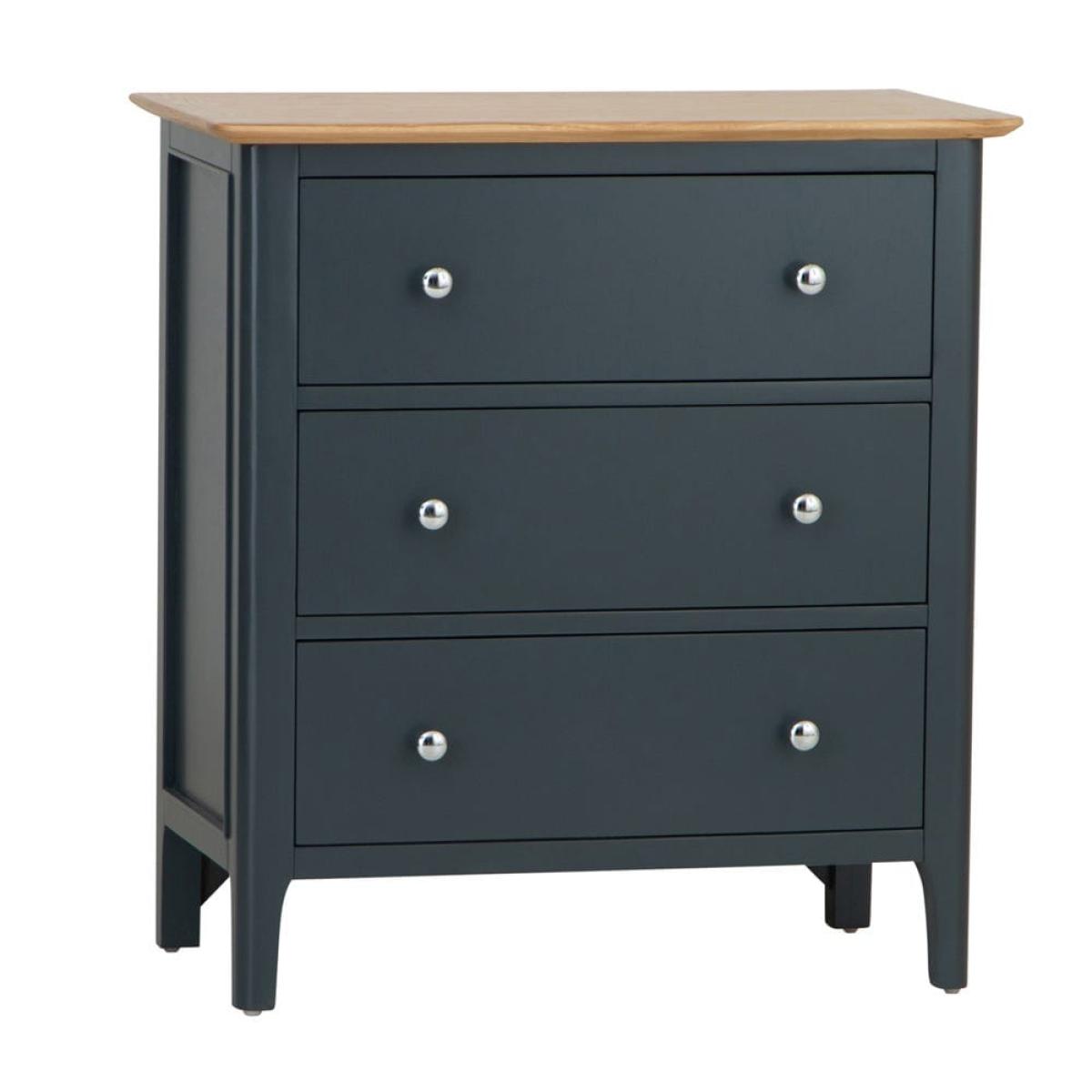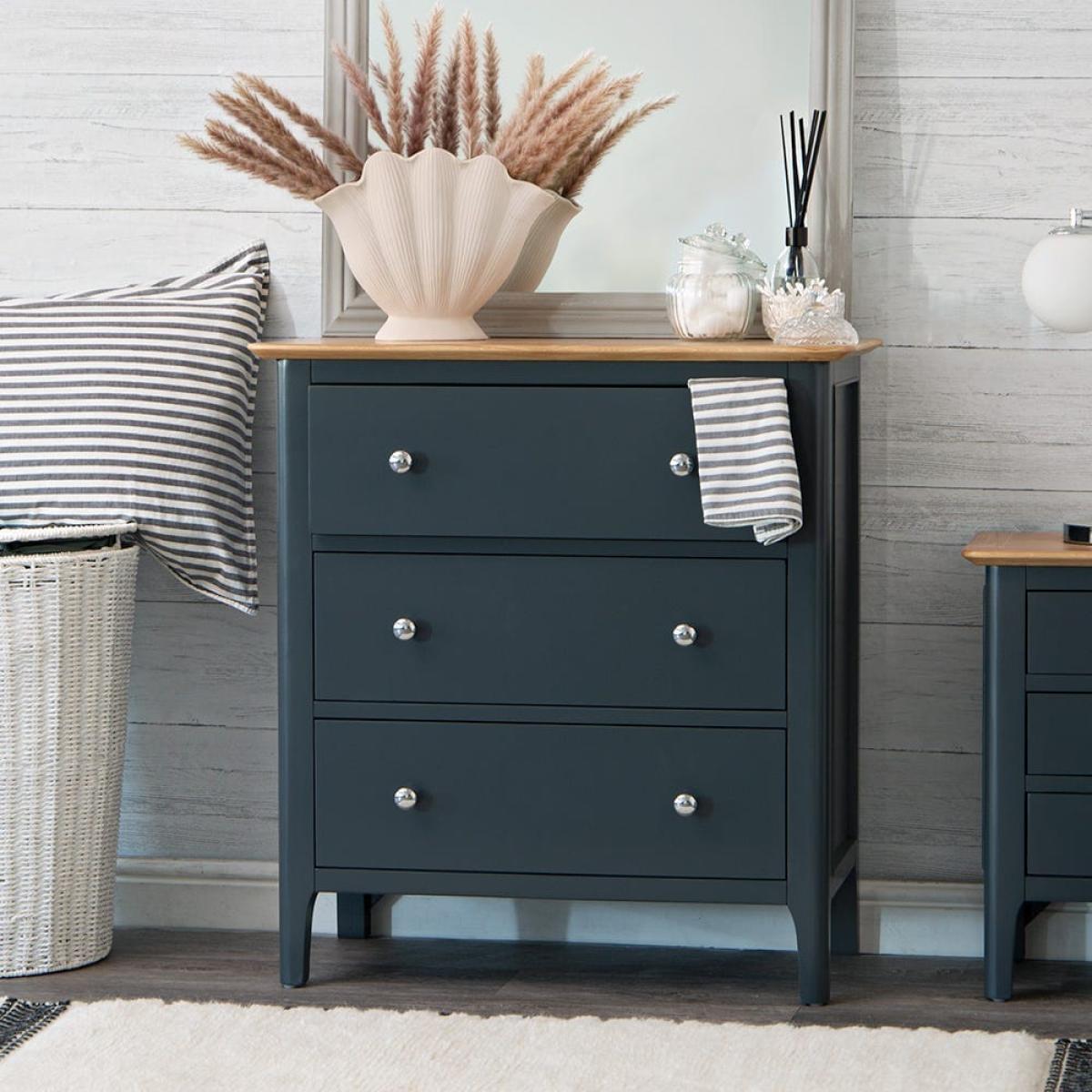 For a storage solution which both looks good and makes your life that much more clutter-free, look no further than the Bergen blue painted oak chest of 3 drawers. Fold and tuck away your favourite clothes in its trio of roomy drawers. You’ll be able to fit in everything from your warmest socks to your thickest winter jumper. Making a statement with its navy-blue paint finish, this stylish chest of drawers is a picture of northern-inspired design. Supported by neat, straight legs and finished with a top surface of oak wood, it’s the best blend of soft and striking.