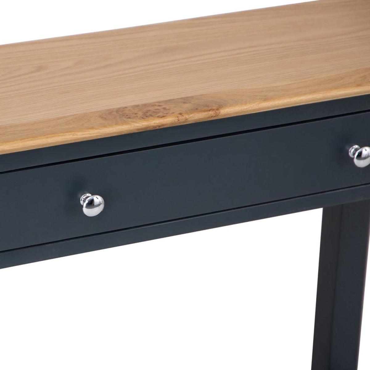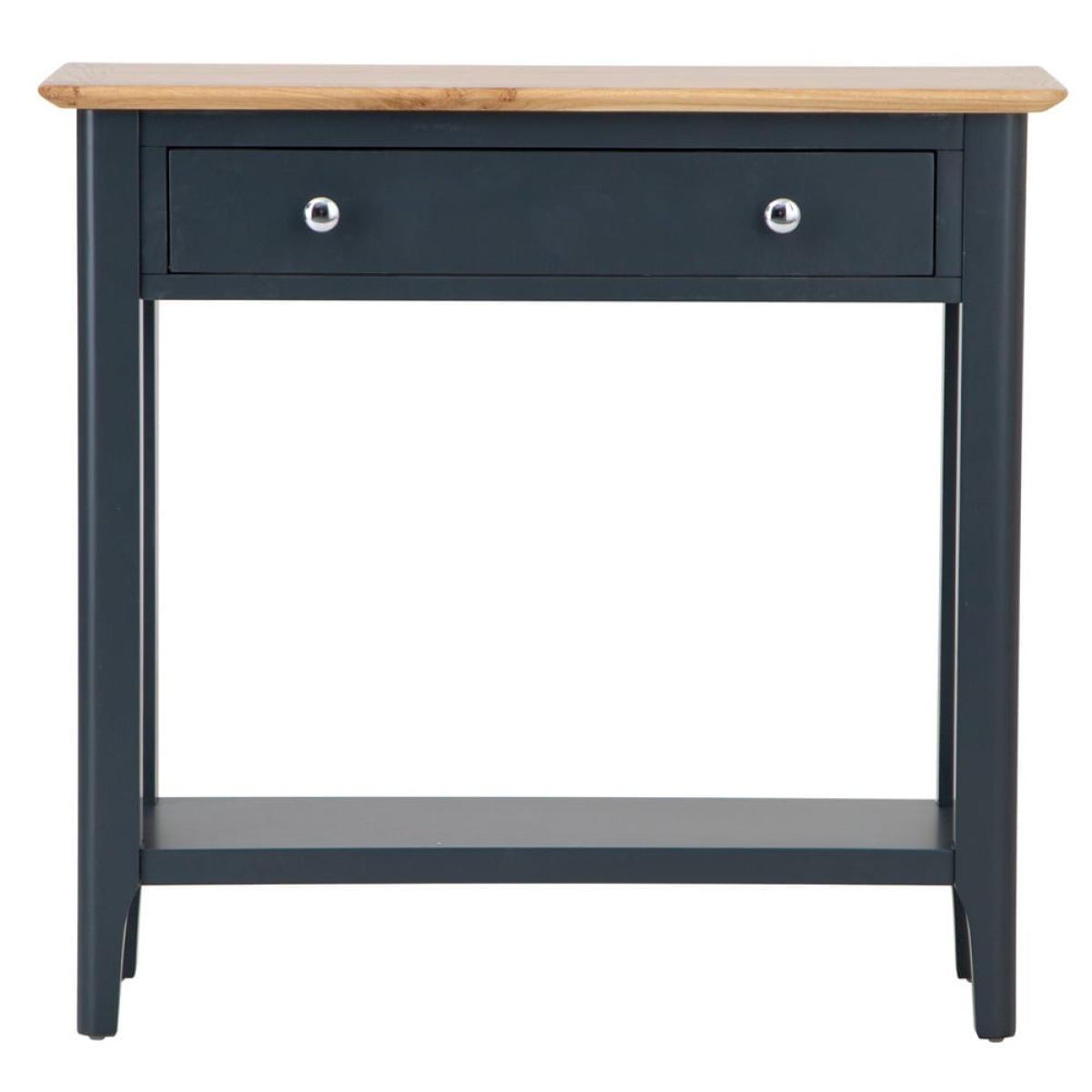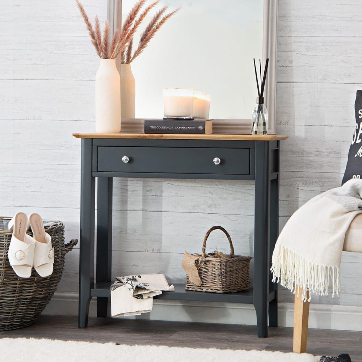 Never wander through the front door and wonder where to put your keys again when you’ve got the Bergen blue painted oak console table stood in your hall. Featuring a handy drawer and a shiny wooden top, it’s the perfect place to arrange a lovely floral display that’ll catch visitors’ eyes the second they walk in through the door. The lower shelf is also ideal for tucking away bits or a spare pair of shoes, or keeping a tote bag nearby. This console table is finished in a beautiful shade of navy blue and looks brilliant placed beneath a wall-mounted mirror.
