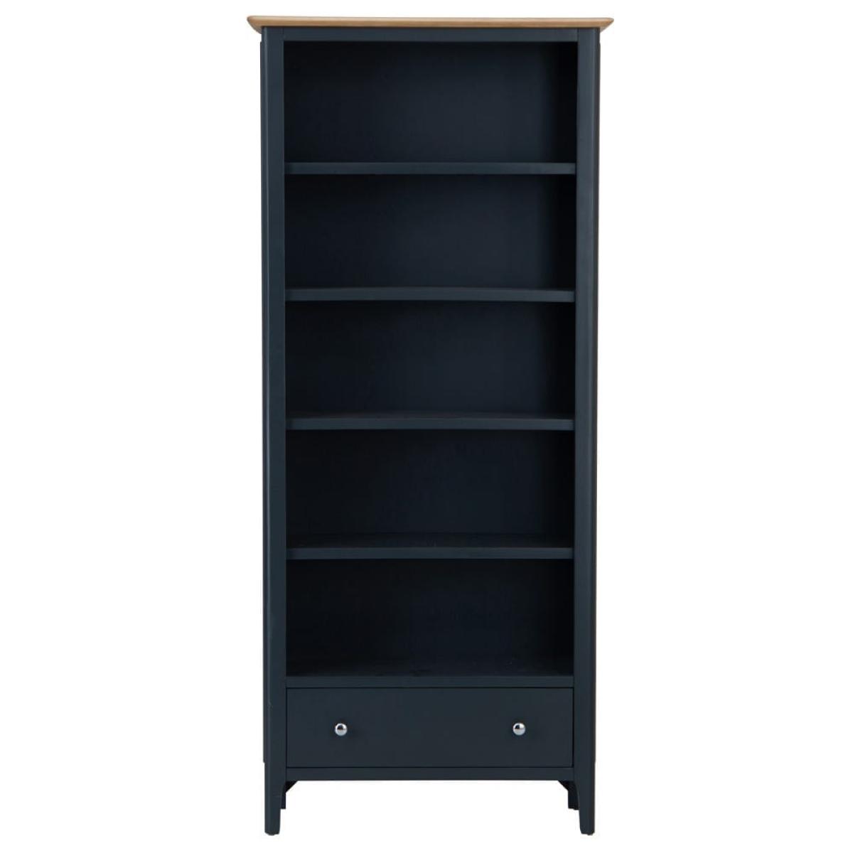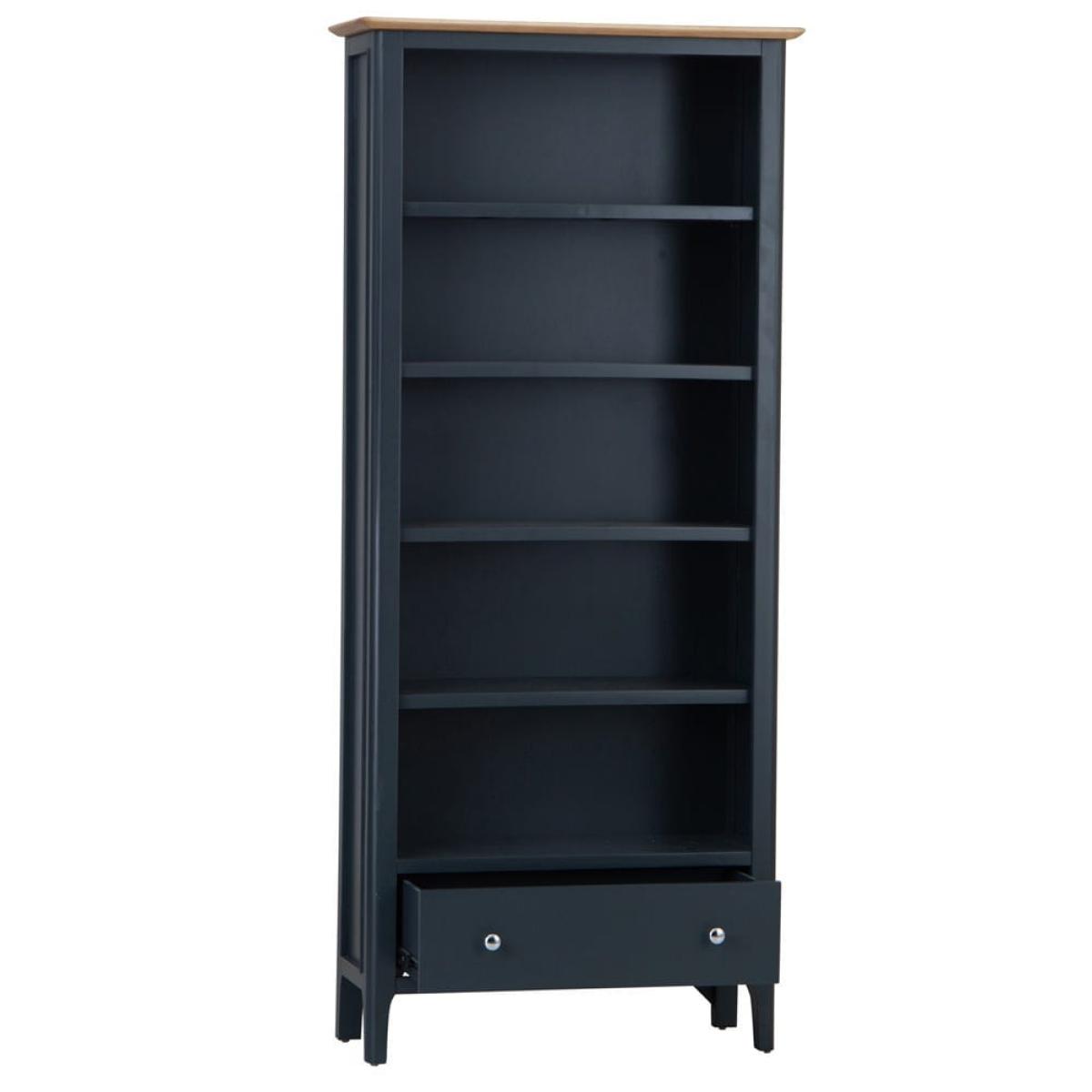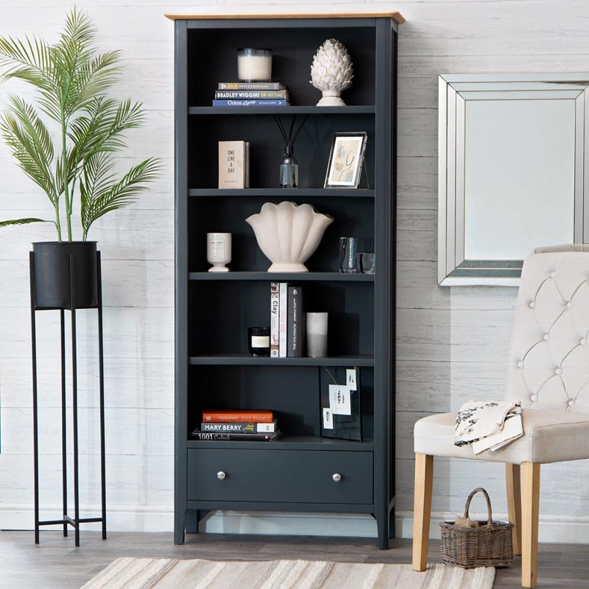 Look the business at your next work meeting by setting the Bergen blue painted oak large bookcase in the background. Carefully arranged with all your smartest hardbacks and a shiny award or two, you’ll look super-sophisticated and oh-so smart – just like your new bookcase. Featuring two fixed and two adjustable shelves, play around with this bookcase and get it set up in the best way to suit you. The convenient bottom drawer is perfect for tucking away other bits and bobs. What about the half-finished knitting project you occasionally return to, along with the ‘How to Knit’ book stored on your bookshelf?.