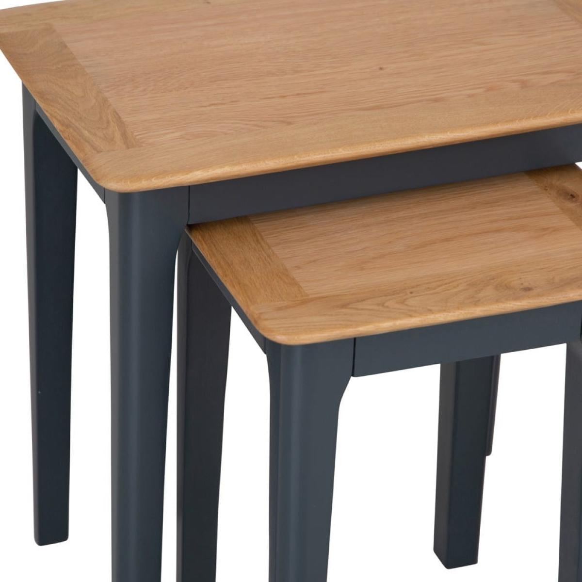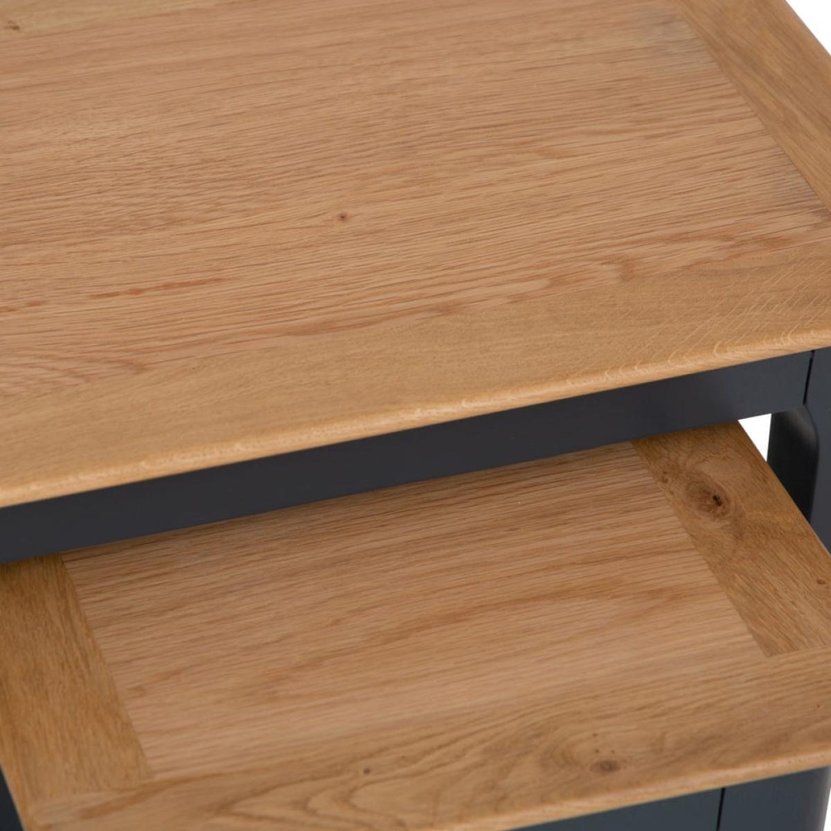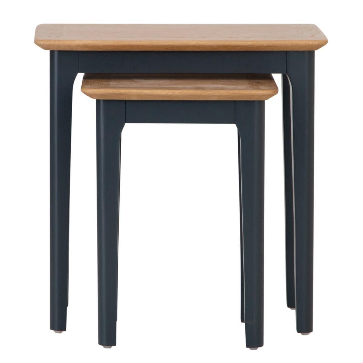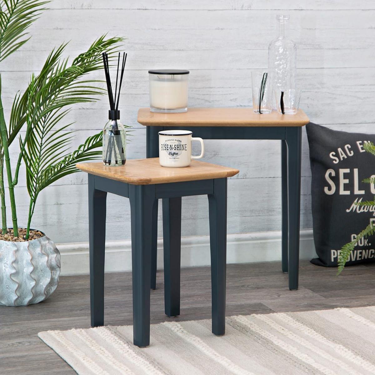 When one table just isn’t quite enough, look no further than the Bergen blue painted oak nest of 2 tables. Enhance the space available in your living room with these small, subtle and elegant tables. Dress the smart wooden top surfaces with everything from candles to scent diffusers. Tuck the smaller table away when it’s not needed, and easily slide it out when there are guests round and someone needs an extra spot to rest their cuppa. With slim legs finished in the striking navy blue signature to this collection, these little tables make a quiet statement of sophistication.