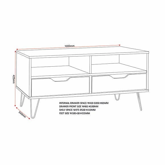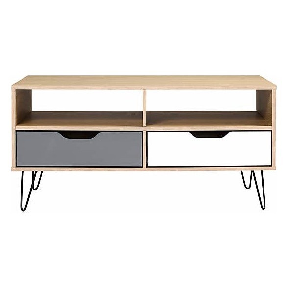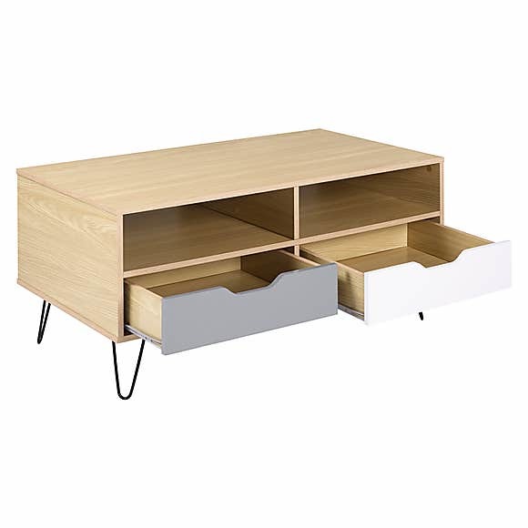 With its oak effect finish, grey and white fronted drawers with cutout handles and black hairpin legs, the Bergen Coffee table would add a contemporary touch to any living space. This self-assembly coffee table offers plenty of storage space with its two open shelves and two spacious drawers.