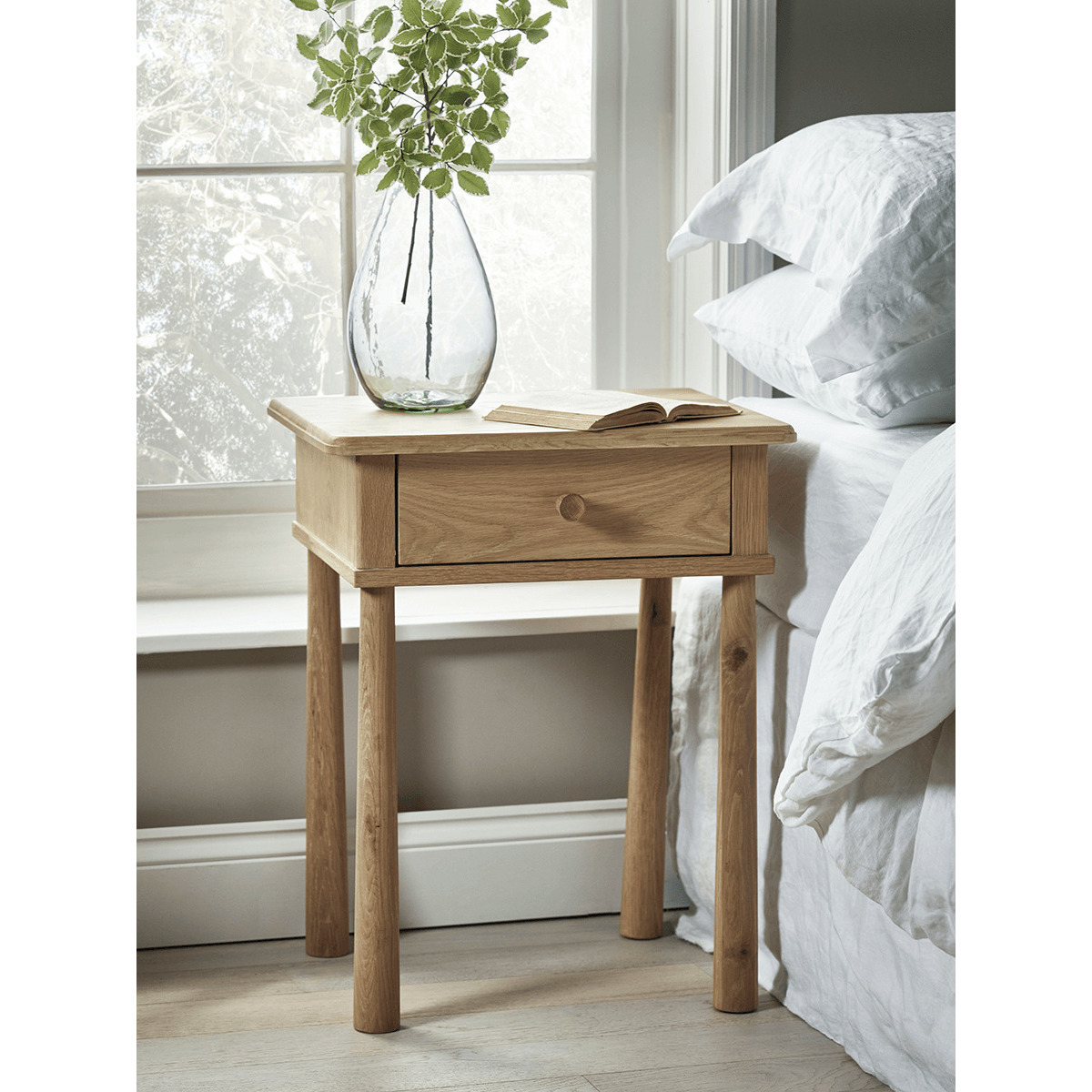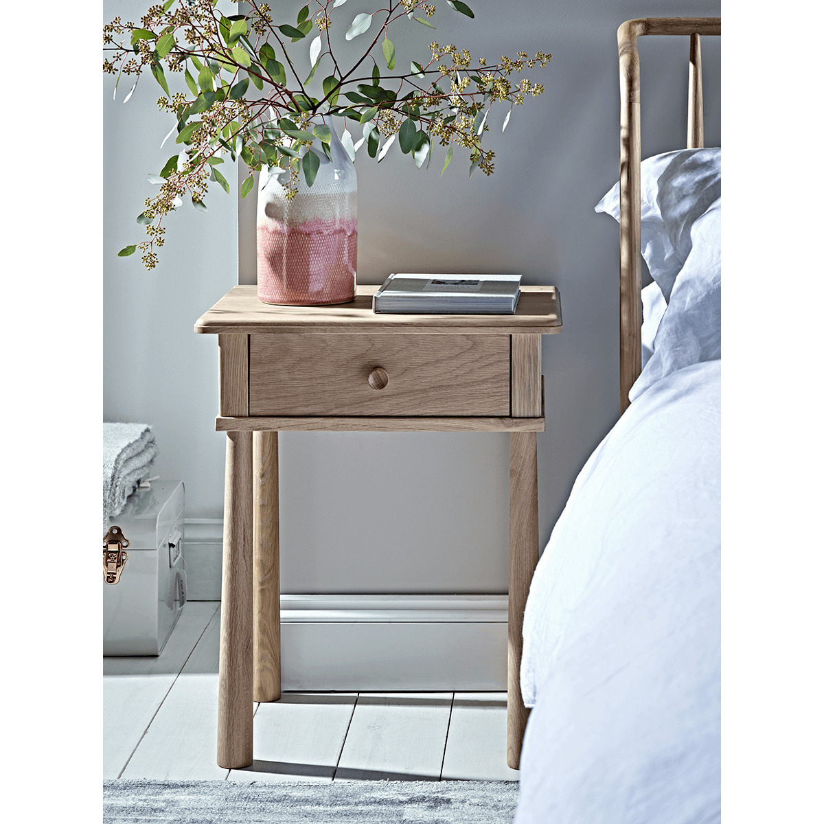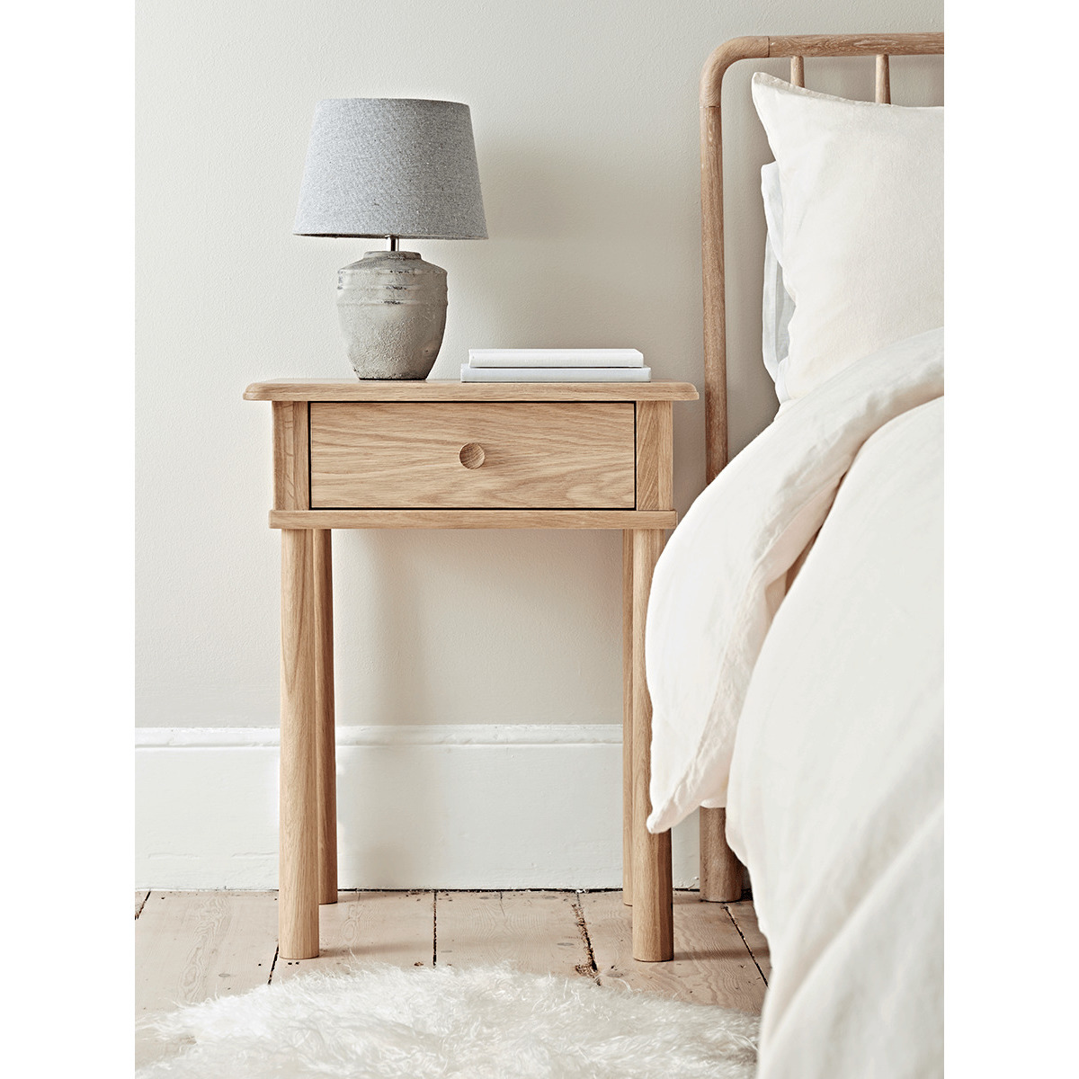 With its elegantly tapered legs and single smooth-slide drawer, our Scandinavian inspired bedside table makes the perfect home for your favourite book and bedside light. Each table is crafted from solid oak and veneer in the perfect Nordic natural, and shows subtle wood grain and circular join details for added character. Discover more styles in our Bergen Oak Furniture Collection.