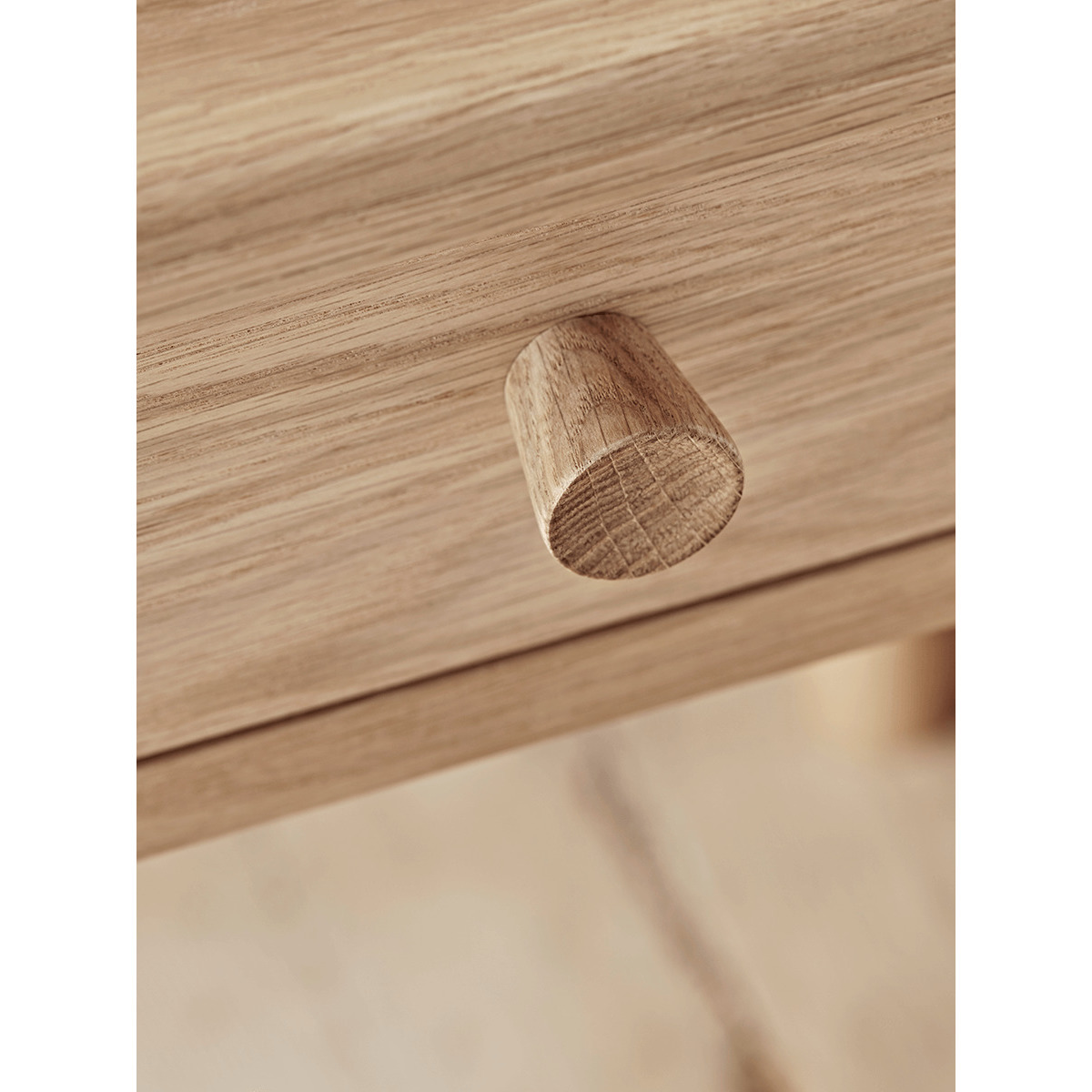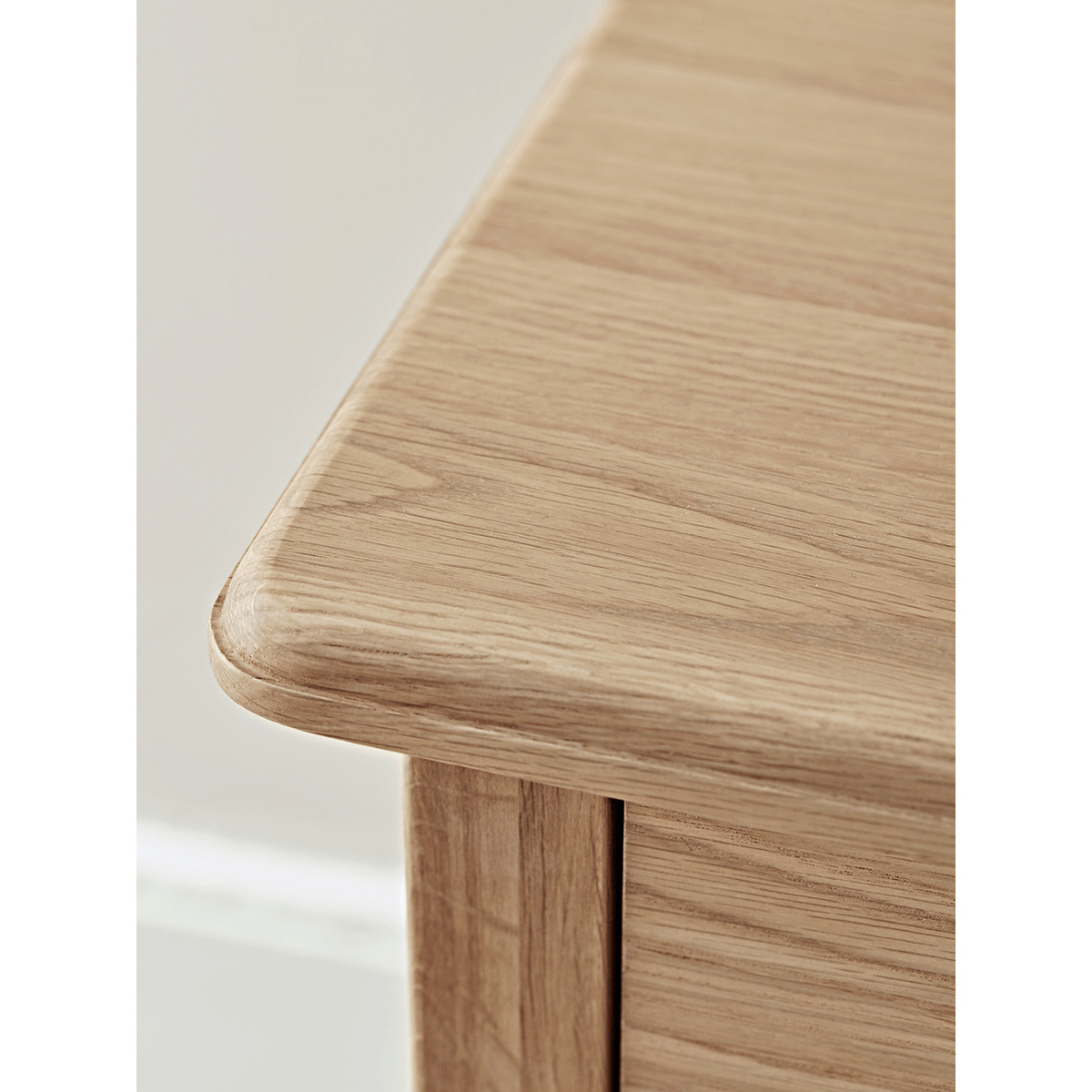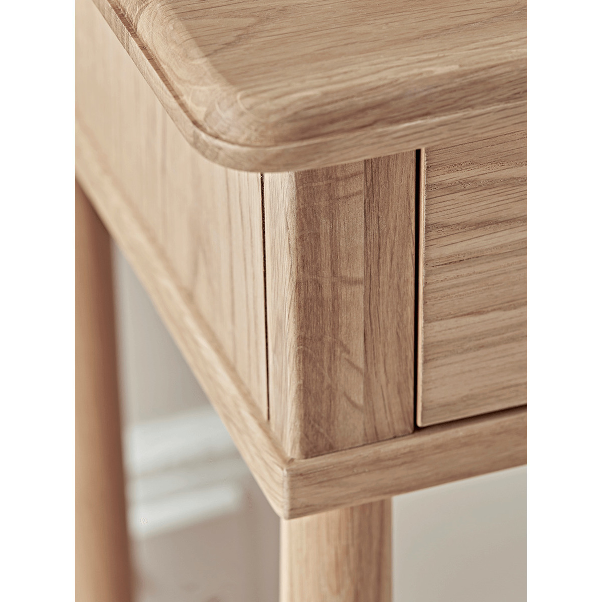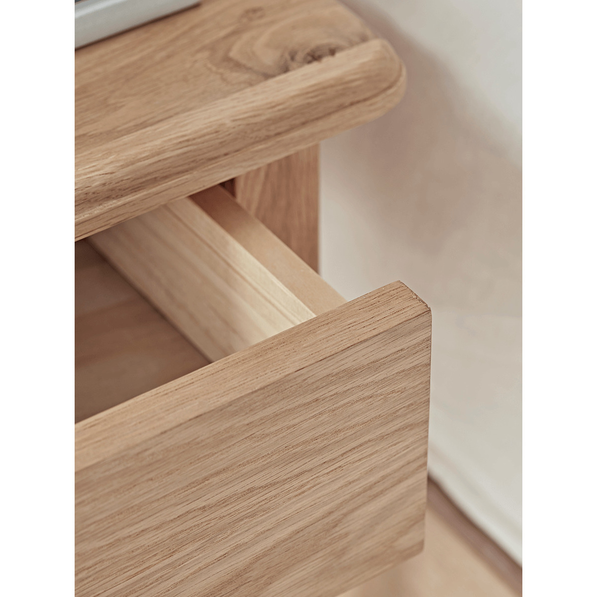 With its elegantly tapered legs and single smooth-slide drawer, our Scandinavian inspired bedside table makes the perfect home for your favourite book and bedside light. Each table is crafted from solid oak and veneer in the perfect Nordic natural, and shows subtle wood grain and circular join details for added character. Discover more styles in our Bergen Oak Furniture Collection.