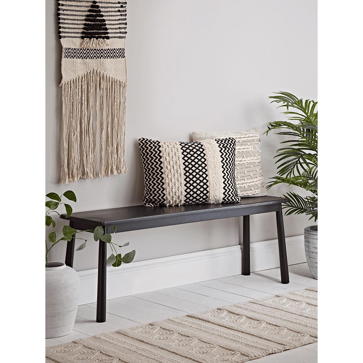 I’m a fan of this black oak bench for its clean, understated look and solid construction. Its slim profile works brilliantly in hallways, behind the sofa or at the foot of the bed, especially in Scandi-inspired, industrial or modern farmhouse interiors. For styling, try a textured cushion or folded throw to soften the edges, and place a low basket underneath for shoes or magazines. Above, a simple wall hook or gallery shelf will balance the height, while a small plant or tray for keys turns it into a functional yet stylish focal point.