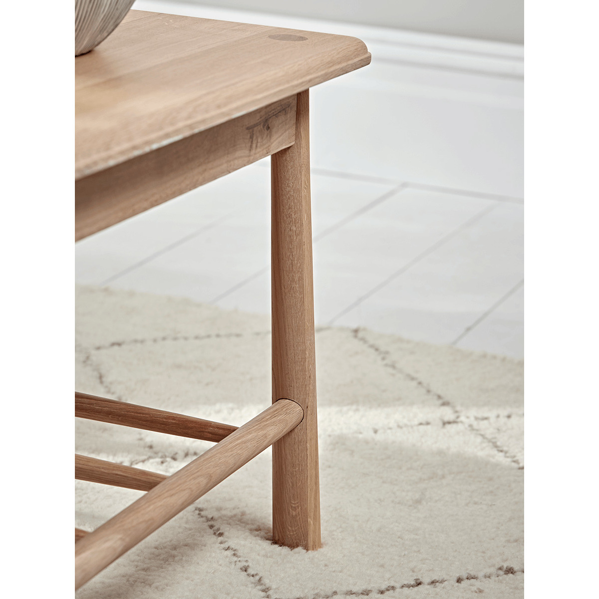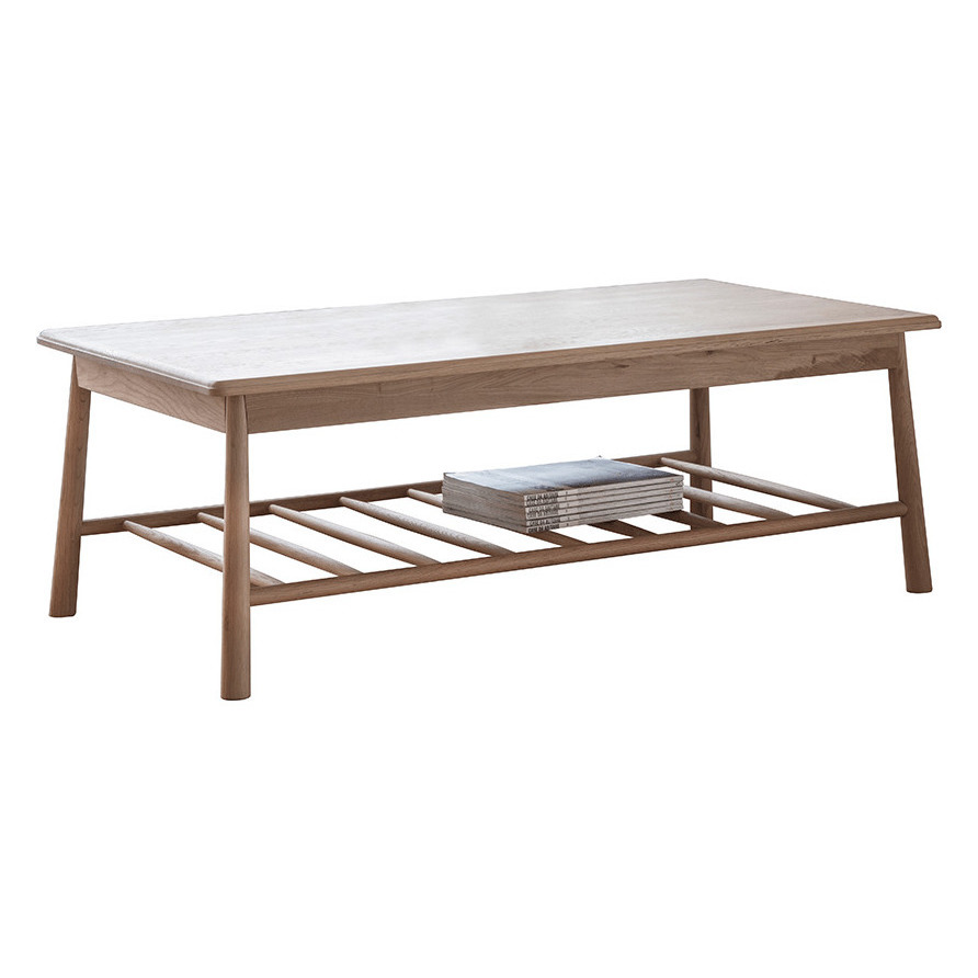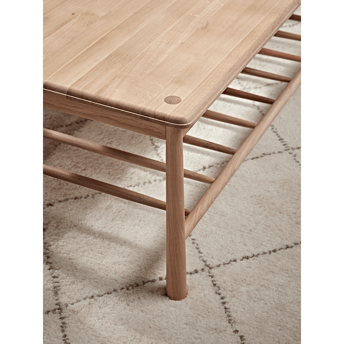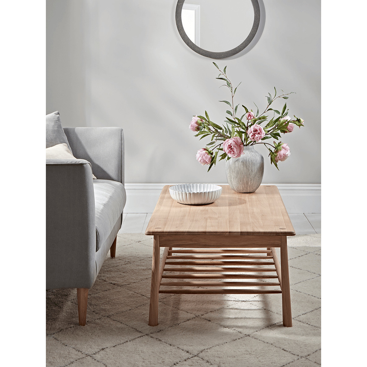 Crafted from solid mellow oak with a soft wood grain and beautiful circular join details, our large rectangular coffee table will make a fabulous finishing touch to your living space. Each piece features a slatted shelf for storage, rounded edges and four elegant, tapered legs. Discover more styles in our Bergen Oak Furniture Collection.