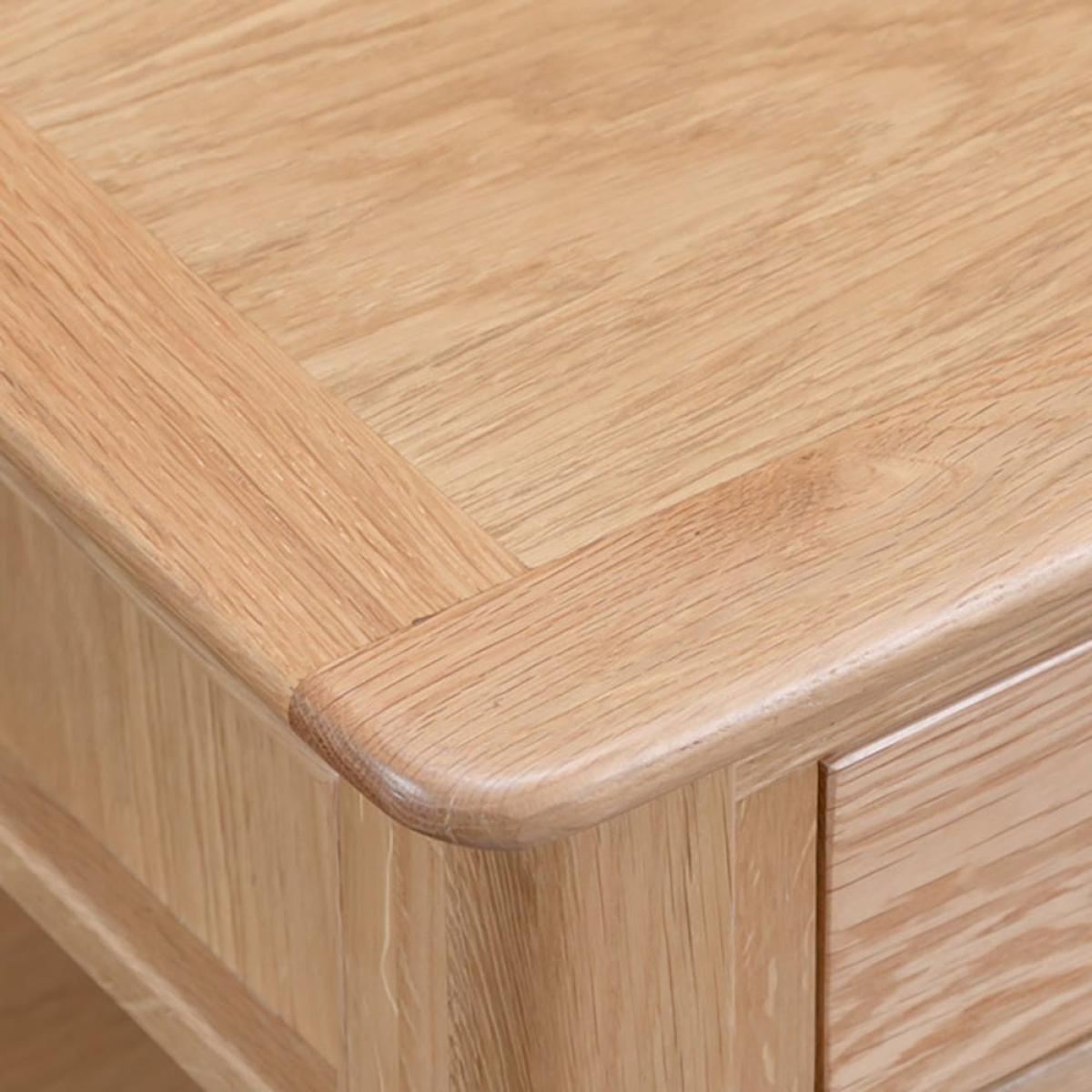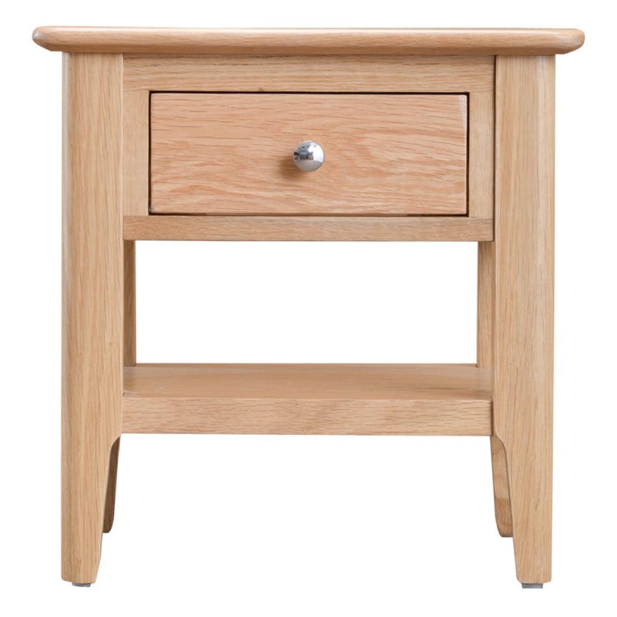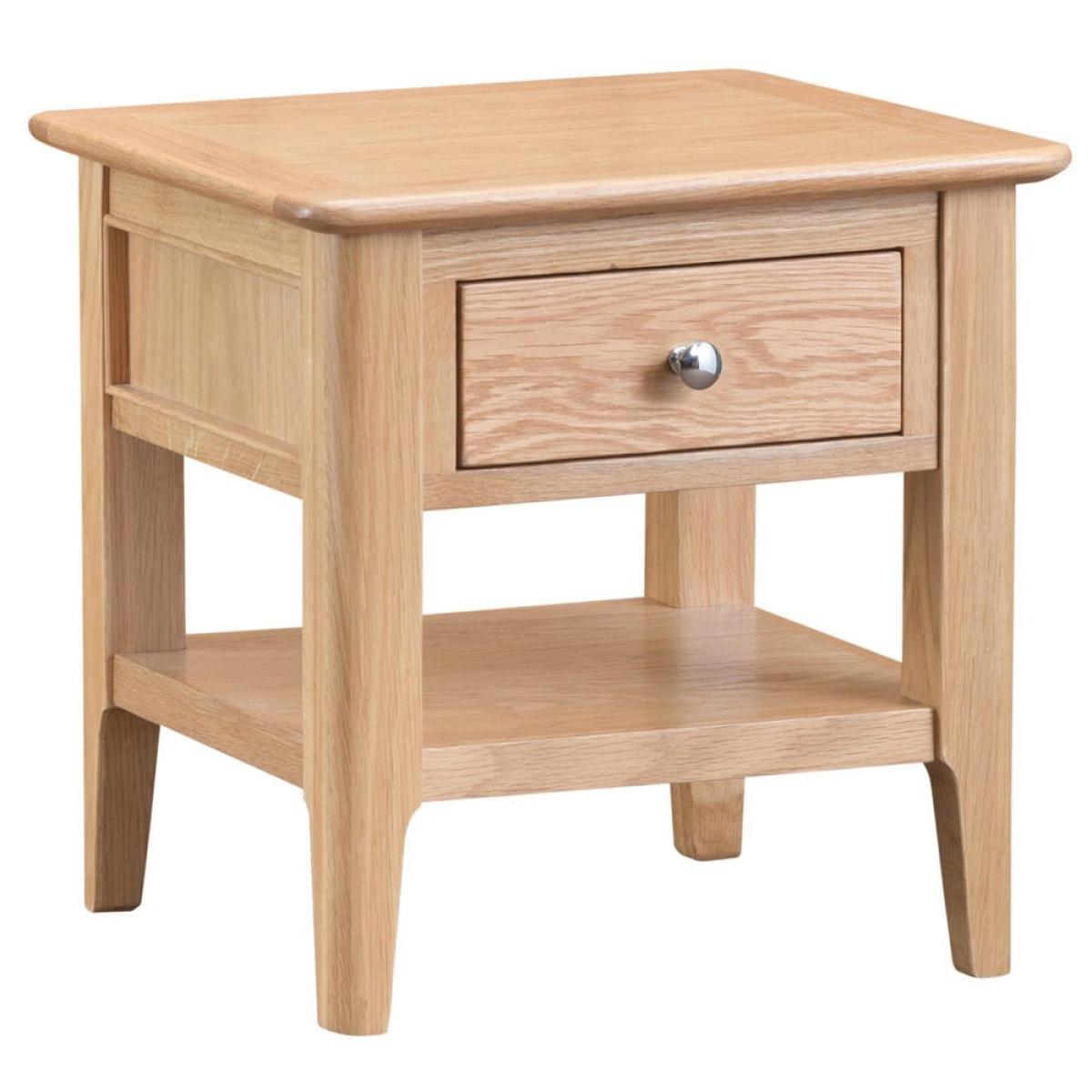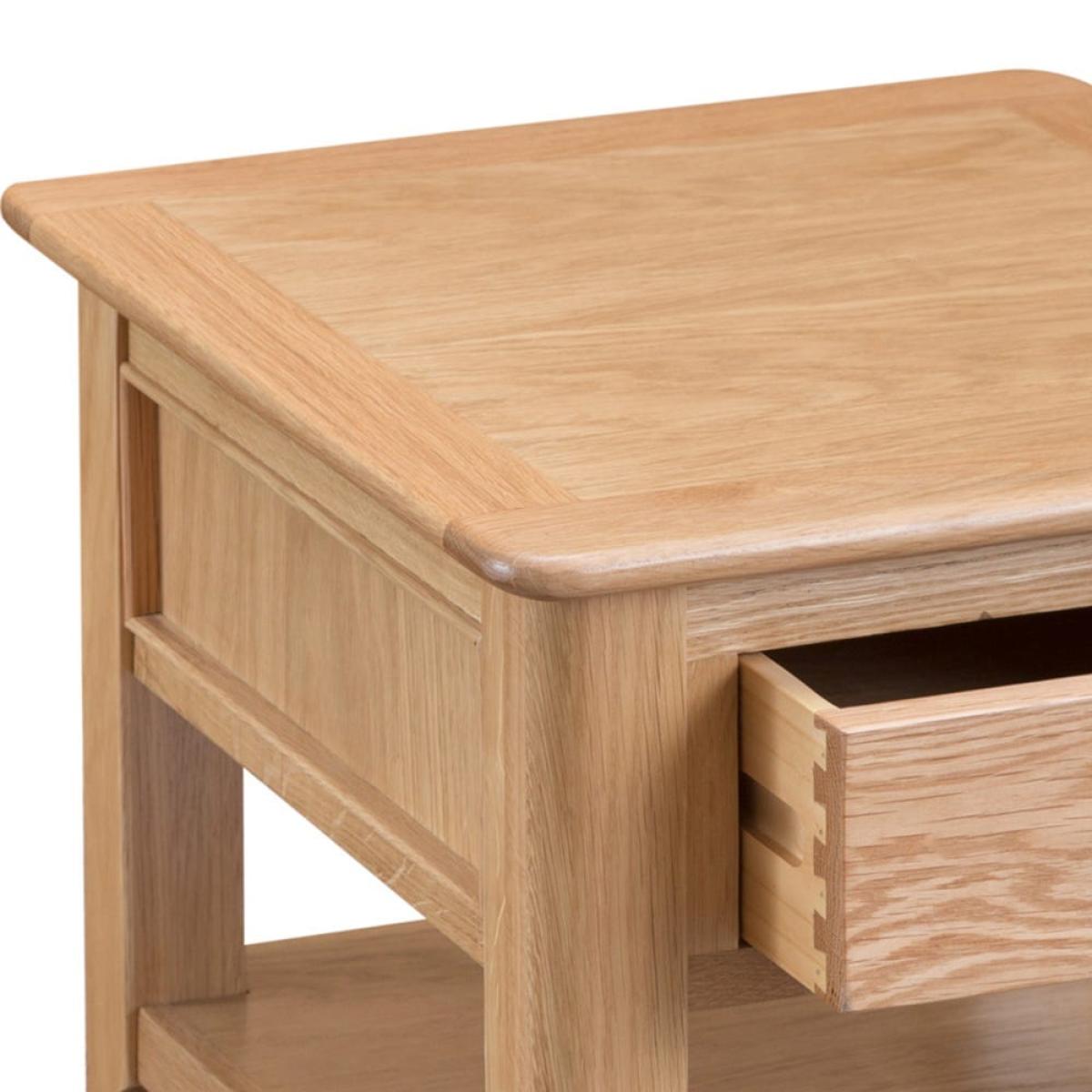 Make your living space truly shine with the Bergen oak large lamp table. And once you've found the perfect lamp to perch upon this little table, your space will feel truly welcoming. Light up the corner of any room or place this lamp table next to your comfiest armchair to create a cosy little reading nook. The handy drawer is perfect for storing spare coasters and any other bits and bobs. Poised and elegant, the serene curves and slim legs of this lamp table add softness and style to any living space.