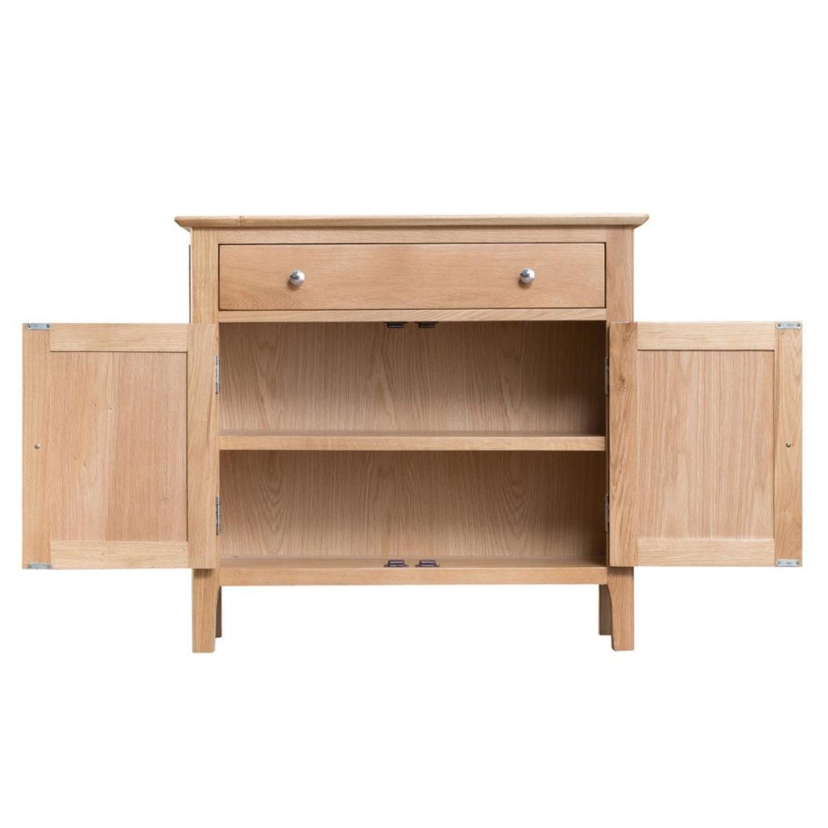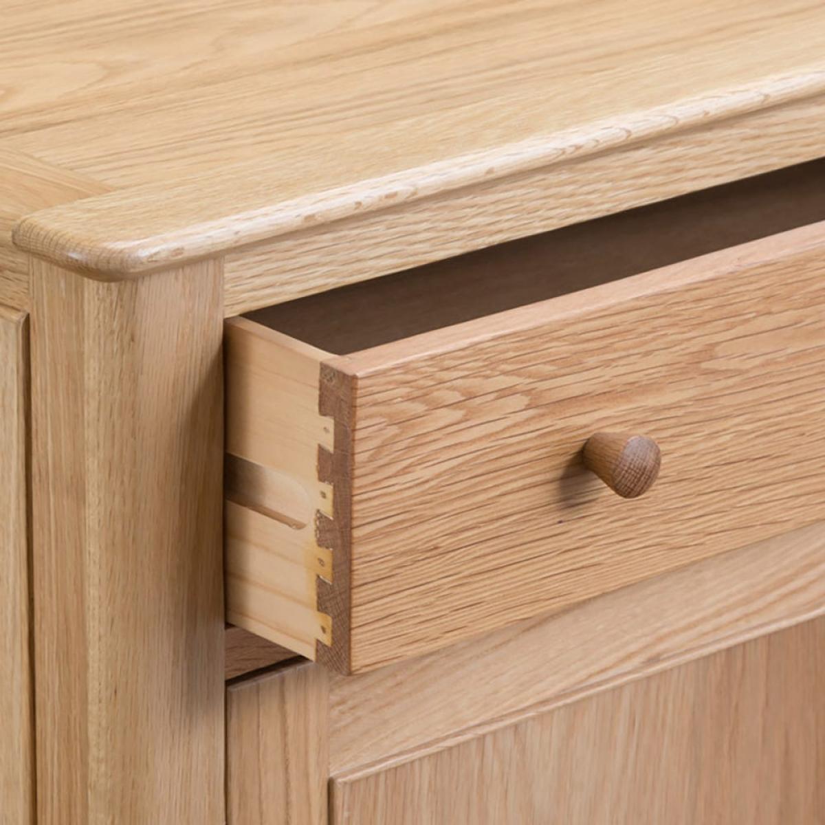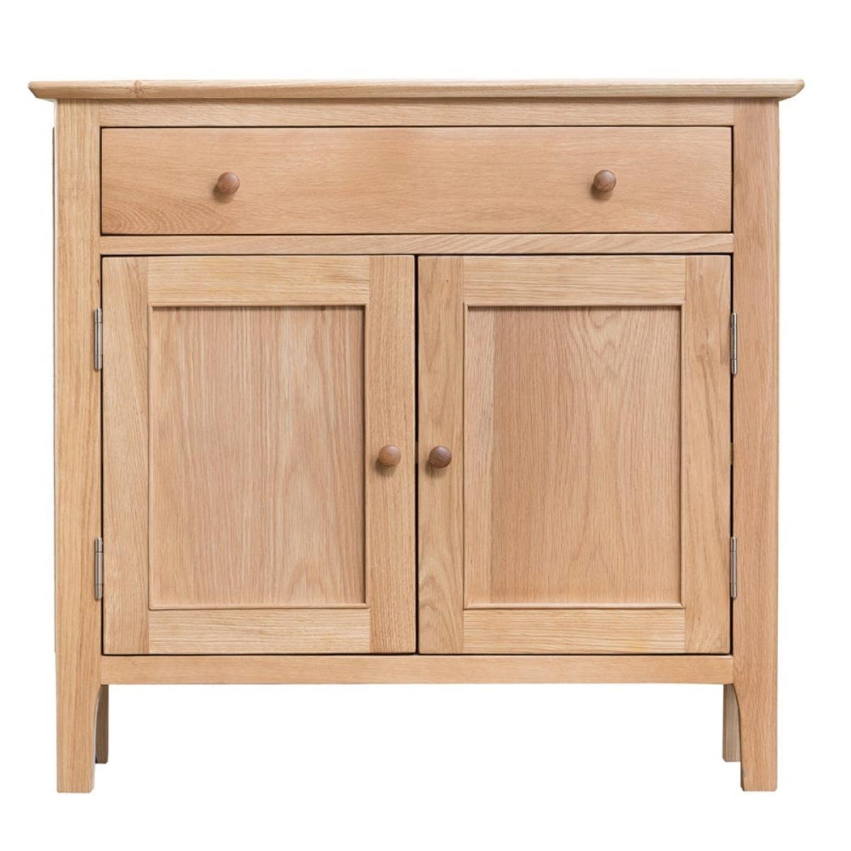 Who said storage solutions had to take up all your floorspace? Not us. That’s why we created the Bergen oak mini two-door sideboard. Don’t let the name fool you. This sleek 85cm-wide sideboard has spacious cupboards perfect for storing your best glasses. That way, they’ll be within easy reach when someone comes to visit for wine o’clock. The natural oak finish of this elegant sideboard has timeless charm. Arrange the smooth wooden top surface with a floral display or sweet-smelling scent diffuser to further add to the ambience of the room.