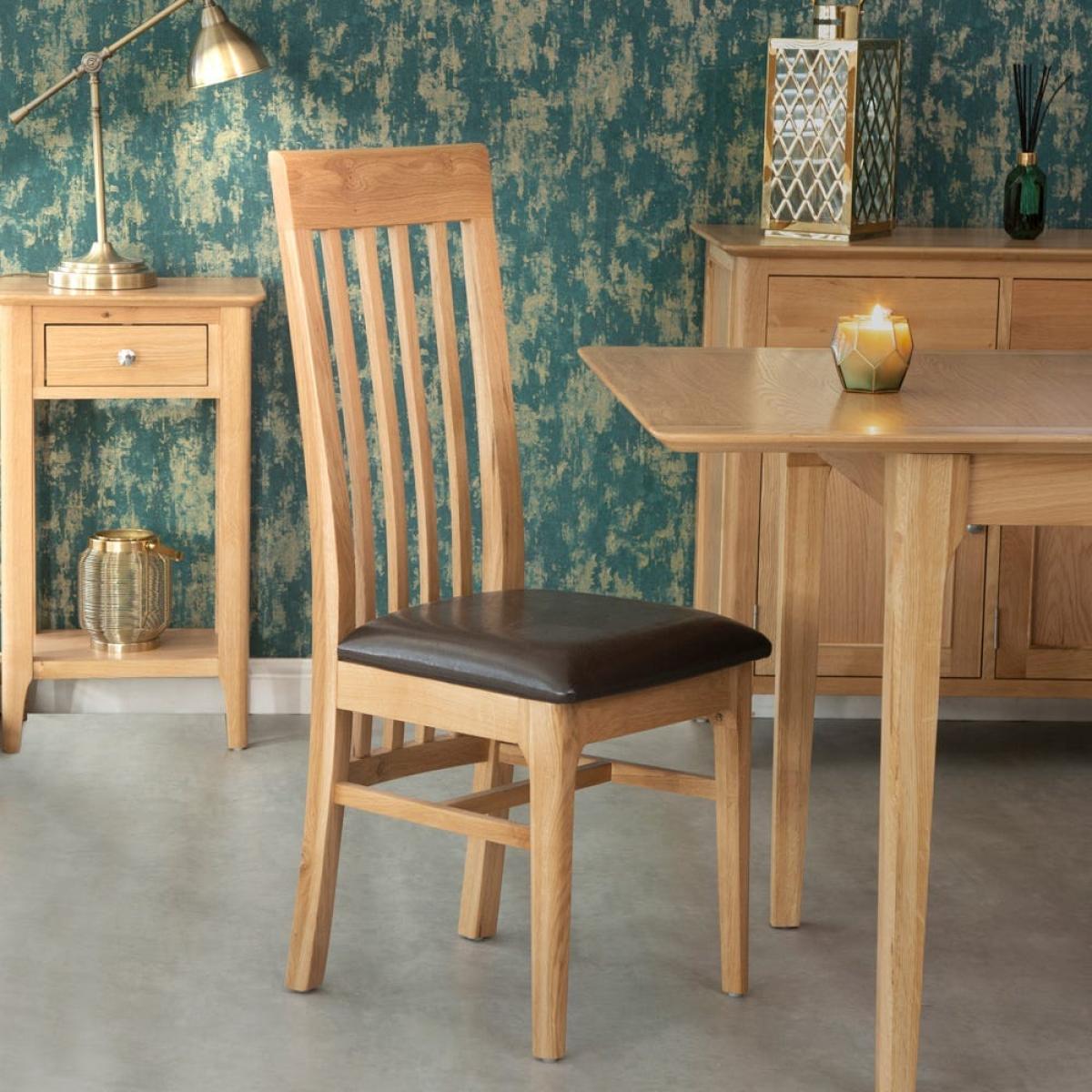 The Bergen oak rail back chair faux leather seat is comfy, classy and contemporary – the three Cs every great chair should be. Picture how stunning these chairs will look round the dining table at your next dinner party. The neat lines of the chair’s subtly curved slatted back add a dash of refinement to your dining space. The light and airy natural oak wood finish of this chair contrasts appealingly with the deep, rich colour of its faux leather seat. It’s a statement piece and comfortable place to sit, all rolled into one.