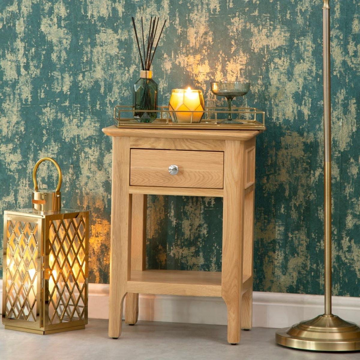 We designed the Bergen oak side table to be an elegant and stylish addition to any room, topped in the natural oak finish signature to this Scandinavian-inspired collection. The dovetailed drawer attests to the careful craftsmanship that goes into creating this gorgeous side table. Fill it with spare coasters or a half-completed crossword book, great for cosying up with on a Sunday afternoon. Put any ornaments you want to display proudly on the neat 40cm-wide top surface. The small shelf is an ideal home for a stack of magazines or books.