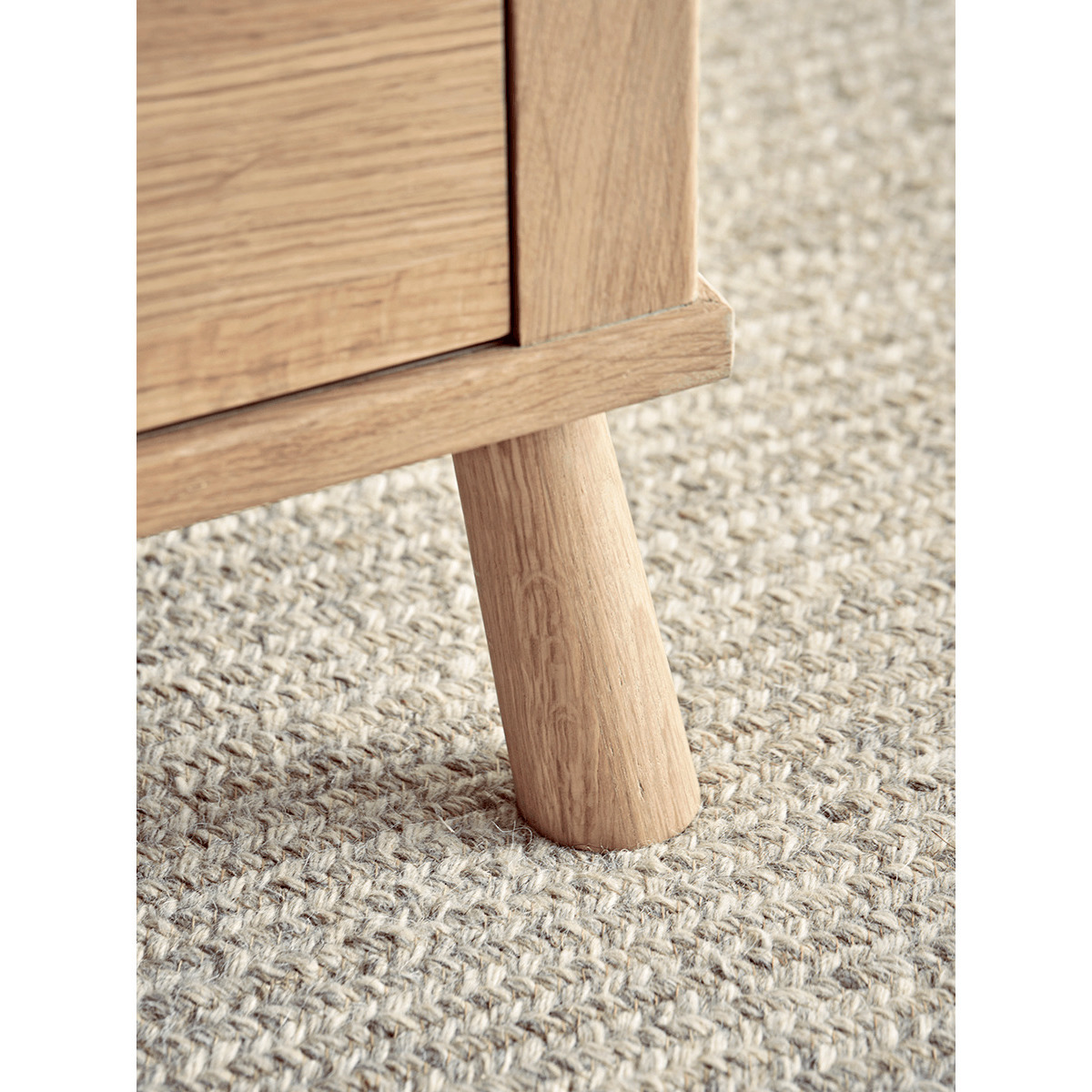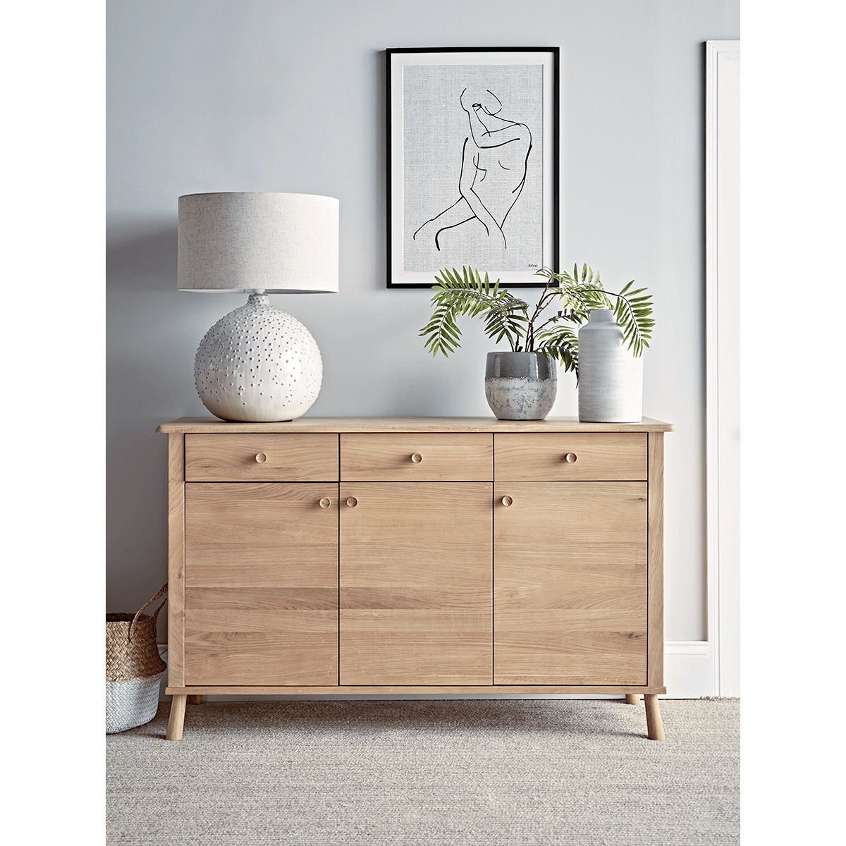 Crafted from solid oak and veneer, this new addition to our Bergen Oak Furniture Collection is the perfect Scandi storage solution for your living space. Each sideboard has one double cupboard and one single, plus three handy drawers for ample storage. Set on four elegant tapered legs, with a beautiful, natural oak grain finish, each sideboard is truly unique. Discover more styles in our Bergen Oak Furniture Collection. Recreate our look with our Glazed Dots Table Lamp.