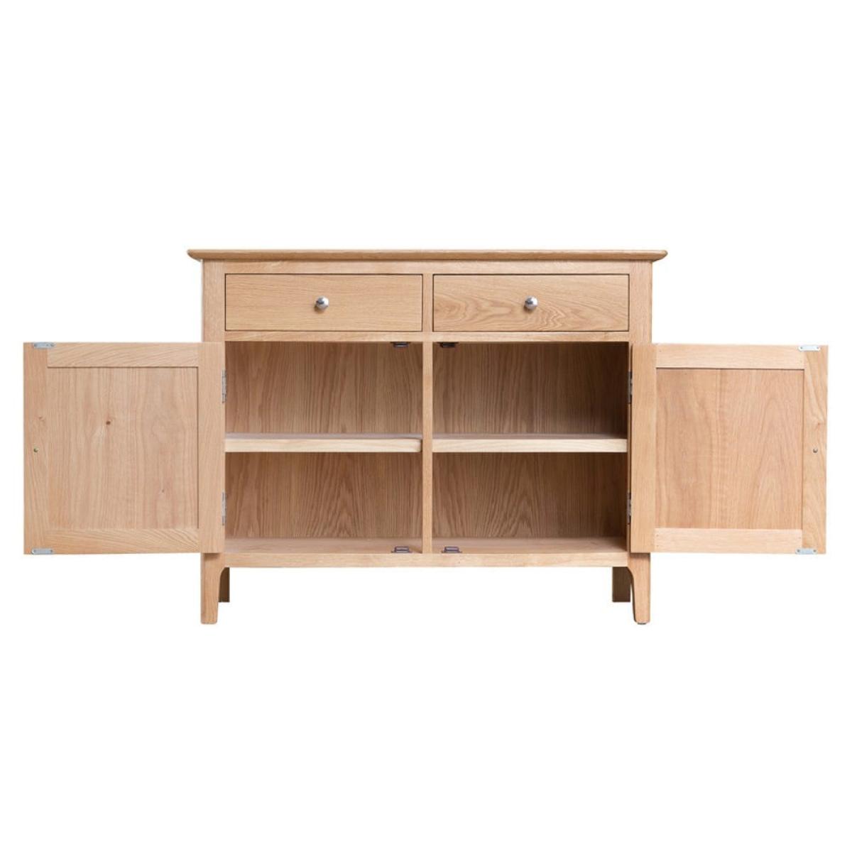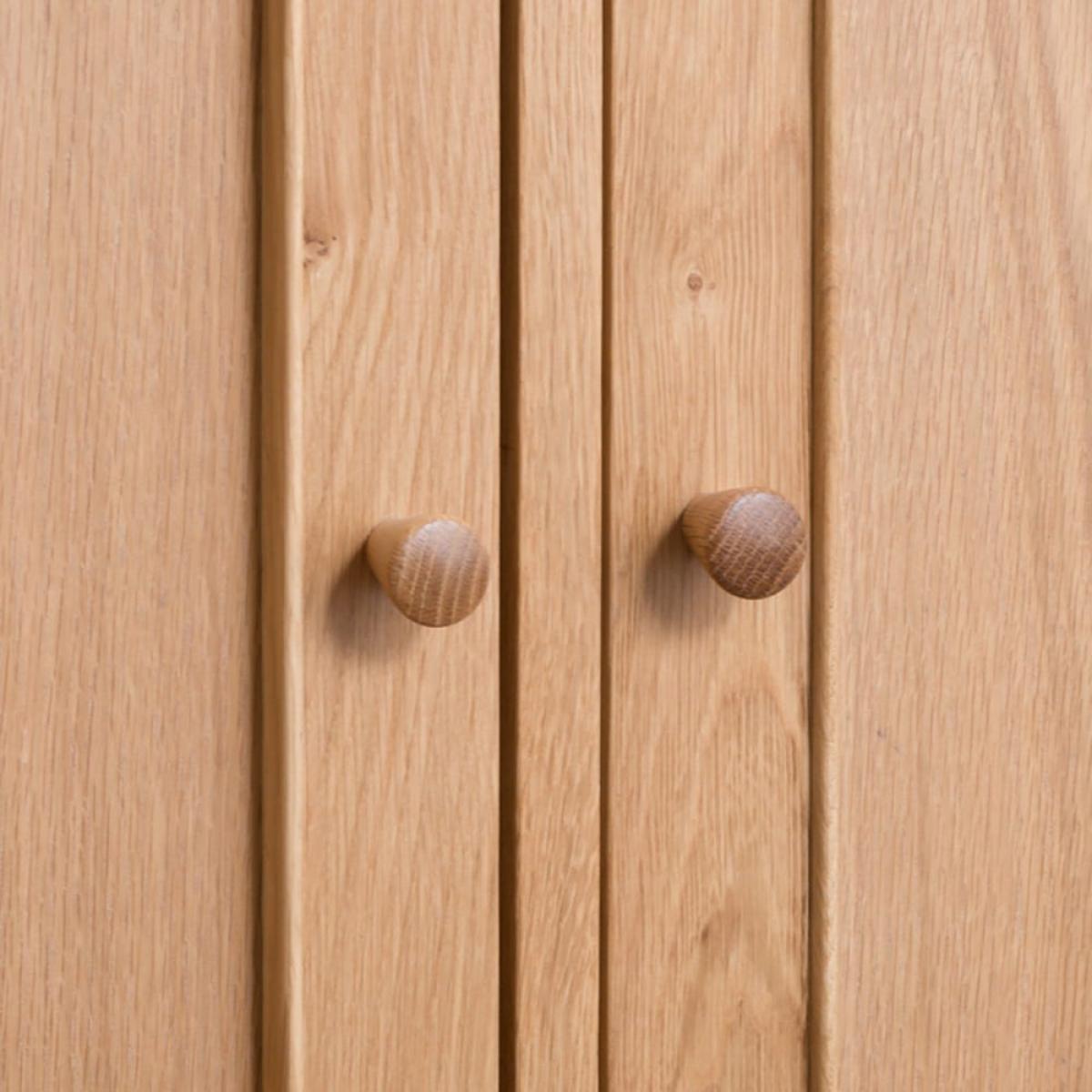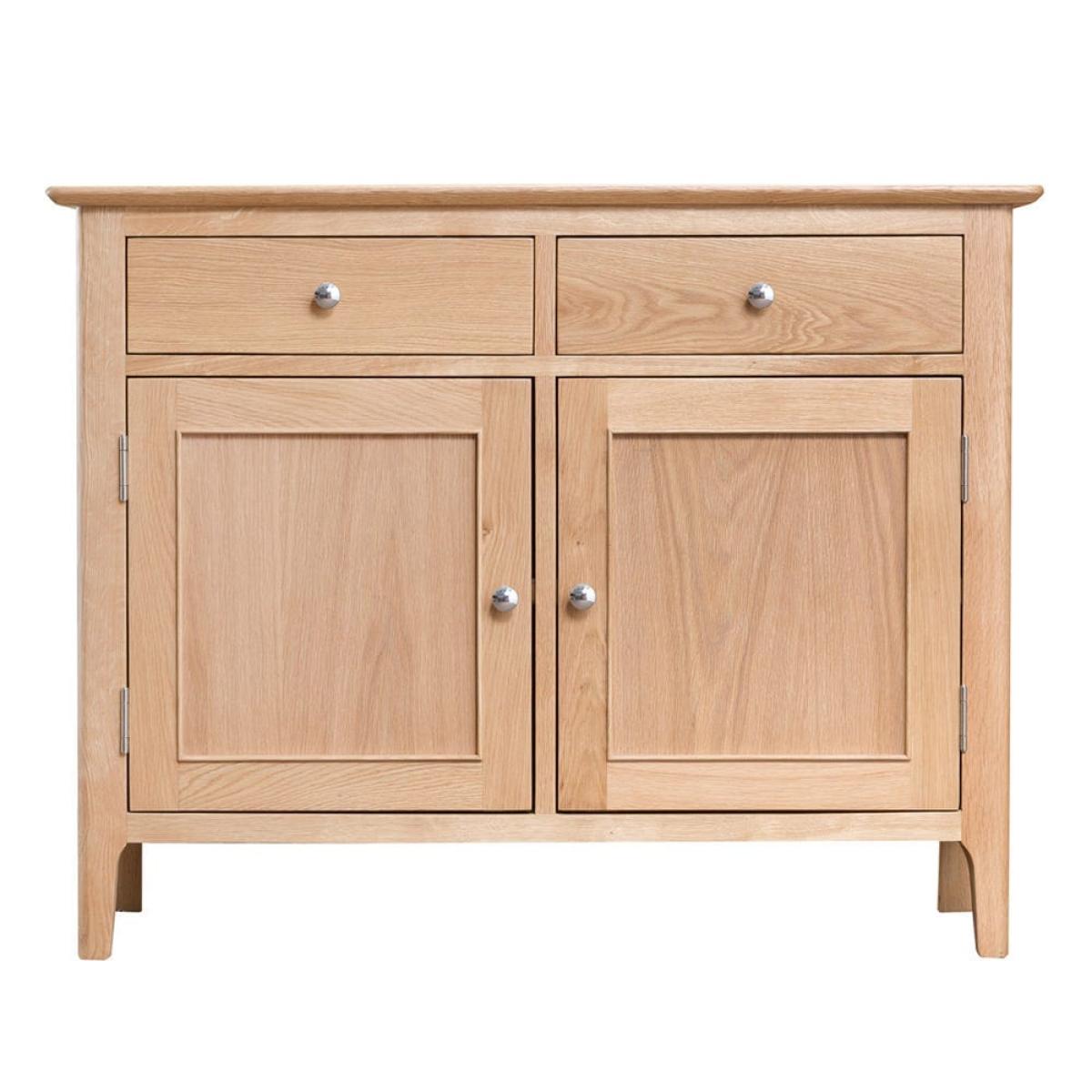 Add convenient storage space, and a touch of sophistication to your next dinner party with the Bergen oak small two-door sideboard. Handily positioned at the edge of your dining space, it’s the ideal place for keeping your best crockery and shiniest set of knives and forks. Supplied with two sets of handles in both metal and wood, this natural oak finished masterpiece is eye-catching and adaptable. Personalise this sideboard further with homely touches displayed across the wooden top surface. Framed photographs from your favourite holiday, a spray of sweet-smelling flowers arranged in an ornate vase – the choice is yours.
