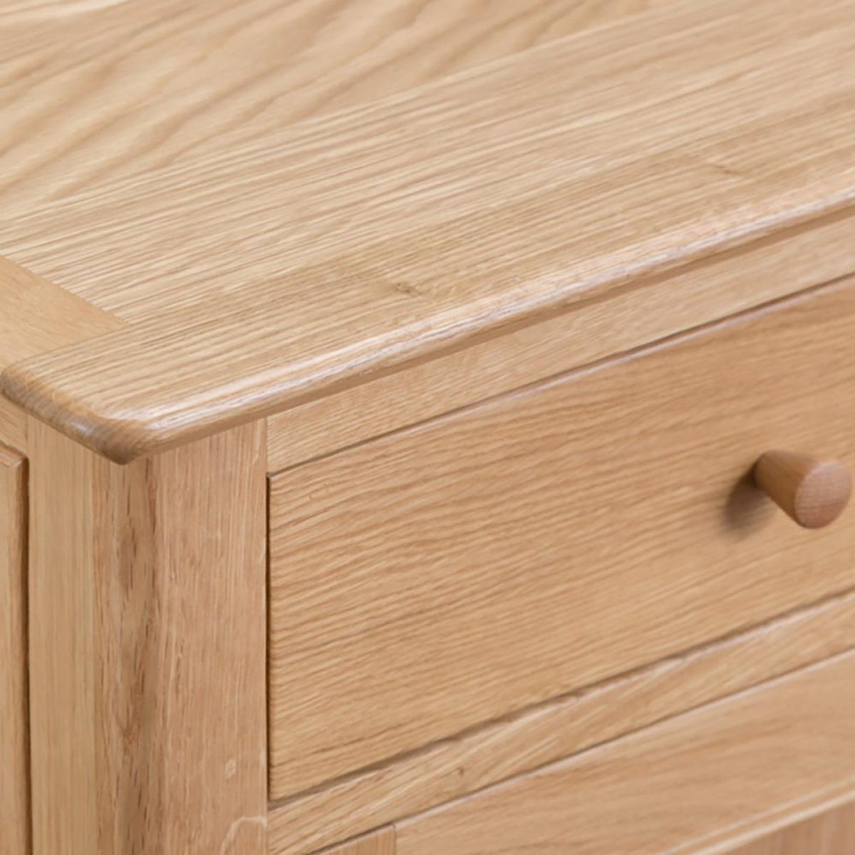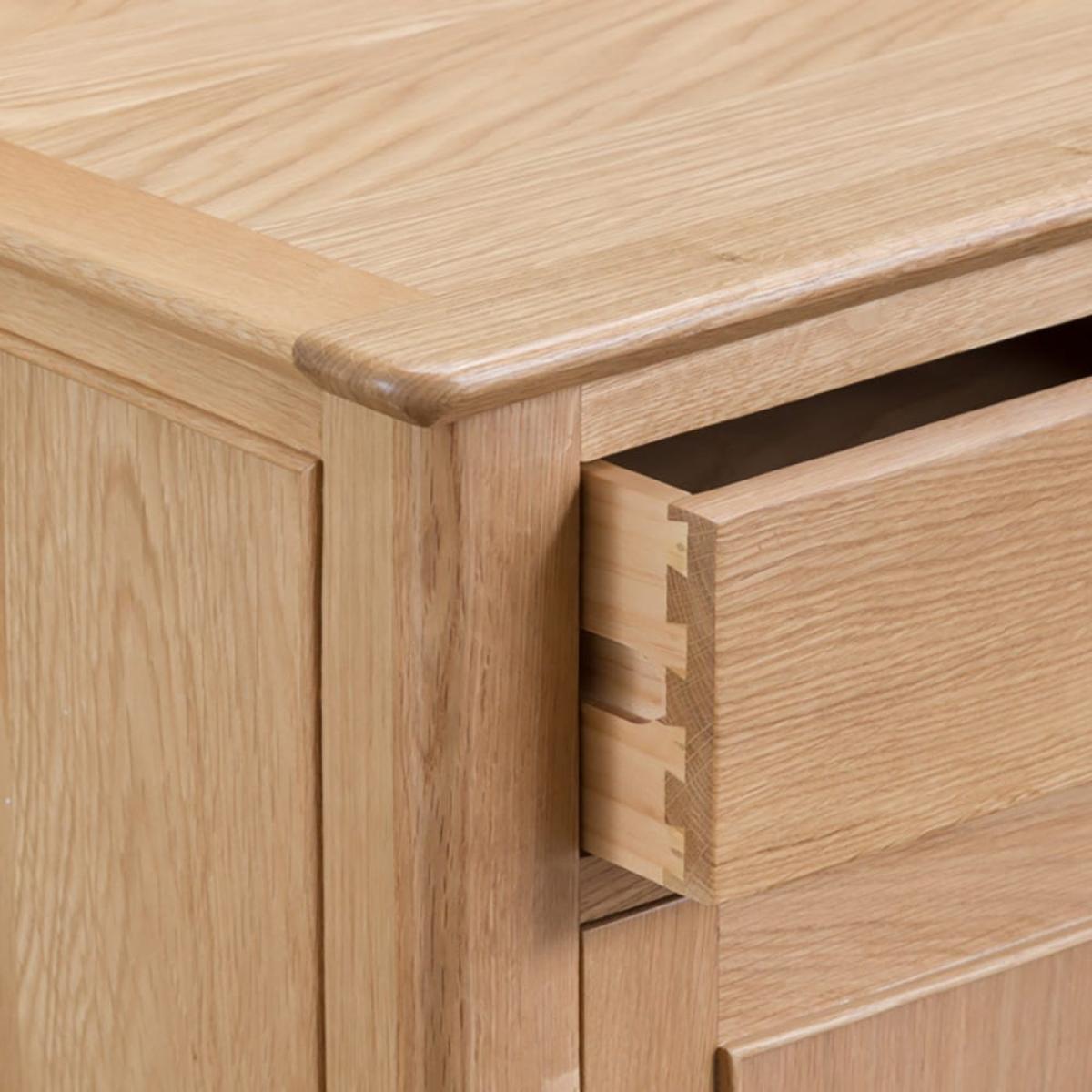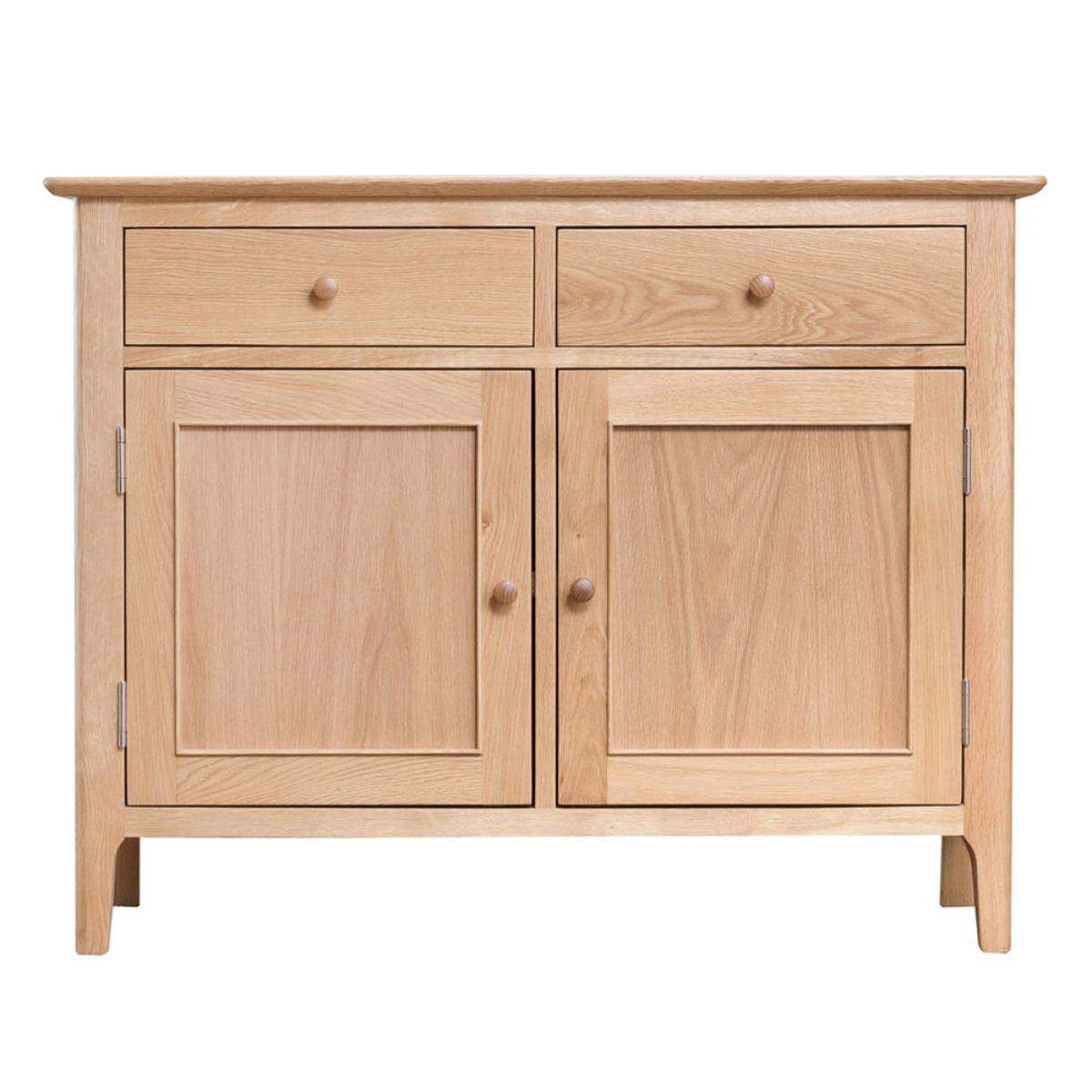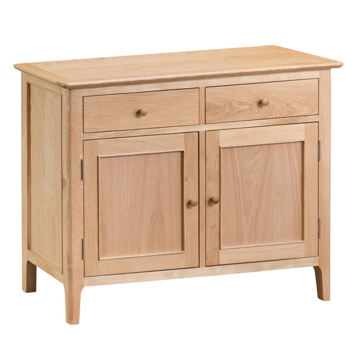 Add convenient storage space, and a touch of sophistication to your next dinner party with the Bergen oak small two-door sideboard. Handily positioned at the edge of your dining space, it’s the ideal place for keeping your best crockery and shiniest set of knives and forks. Supplied with two sets of handles in both metal and wood, this natural oak finished masterpiece is eye-catching and adaptable. Personalise this sideboard further with homely touches displayed across the wooden top surface. Framed photographs from your favourite holiday, a spray of sweet-smelling flowers arranged in an ornate vase – the choice is yours.
