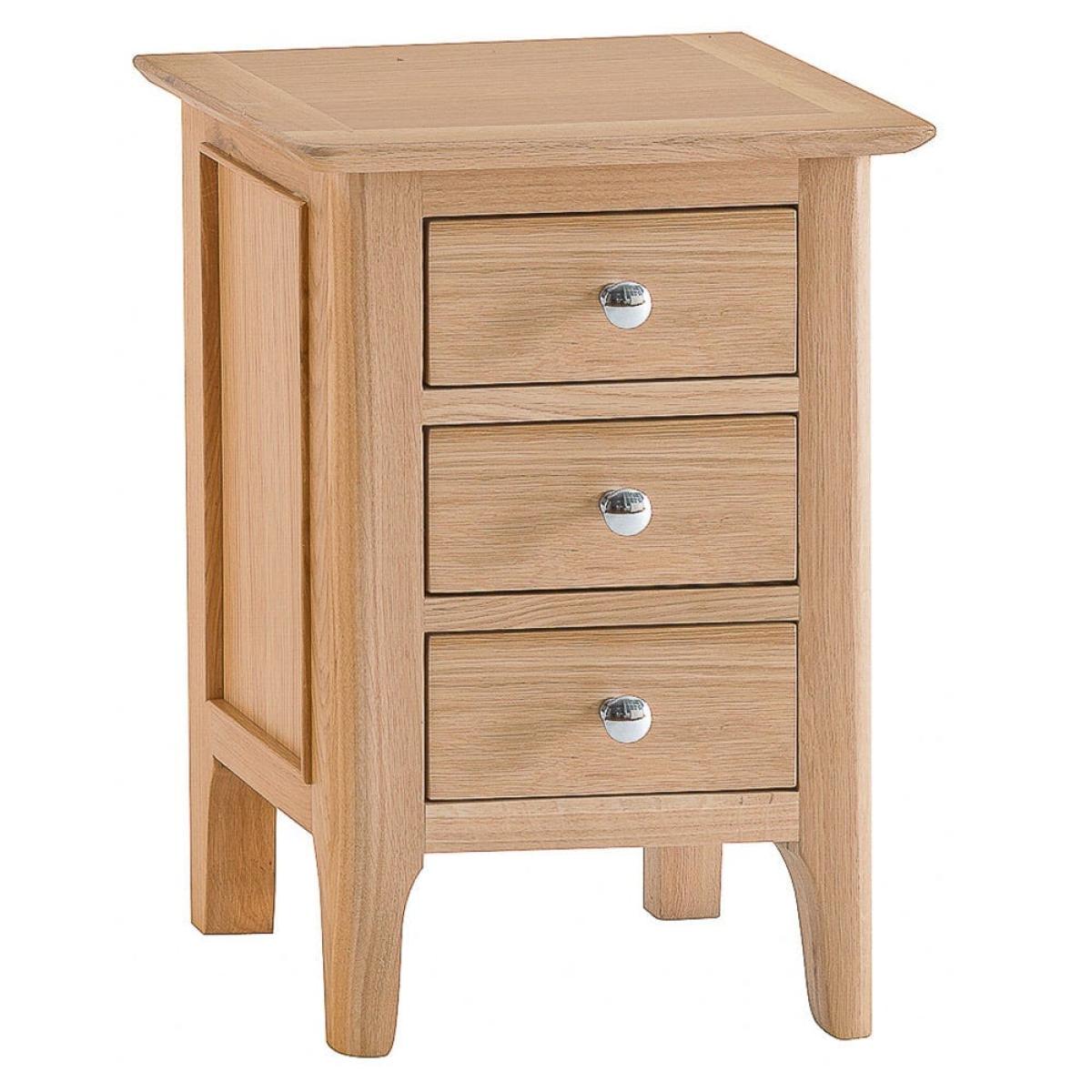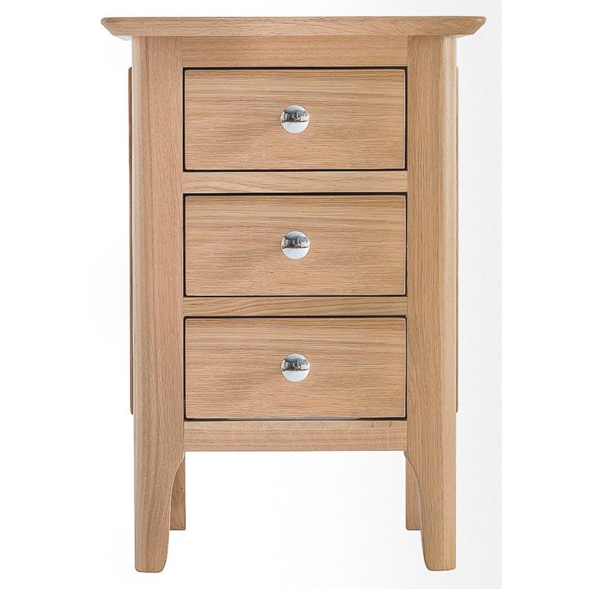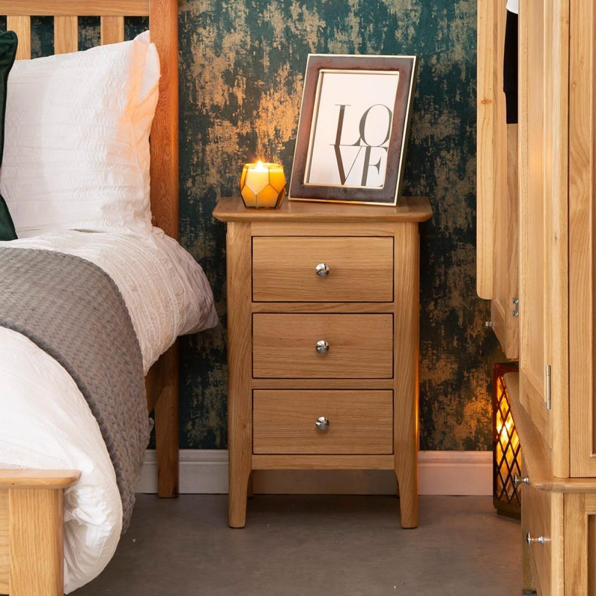 The neat and tidy Bergen oak small bedside table tucks into a cosy corner of your bedroom and helps it feel like home. Snuggle up under your warmest duvet and settle in for a bit of bedtime reading, lit by the glow of a reading lamp perfectly positioned on this bedside table. This is a bedside table built with artisan craft and quality in mind. The trio of handy drawers have each been finely dovetailed. Beautifully tie your bedroom interior together with the addition of this versatile and timeless bedside table.