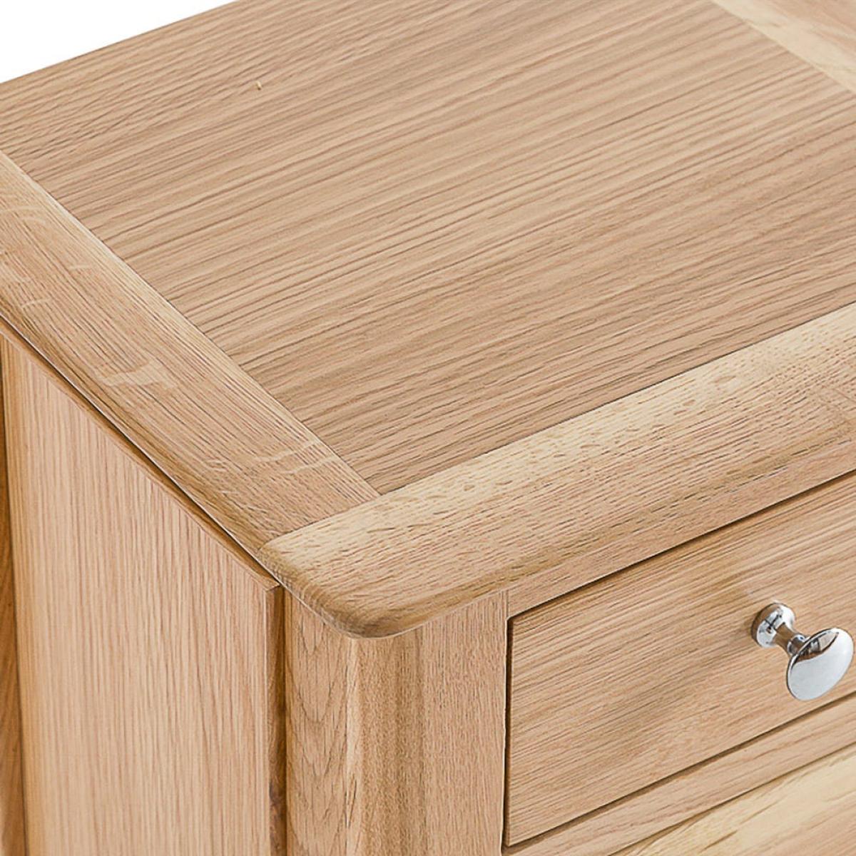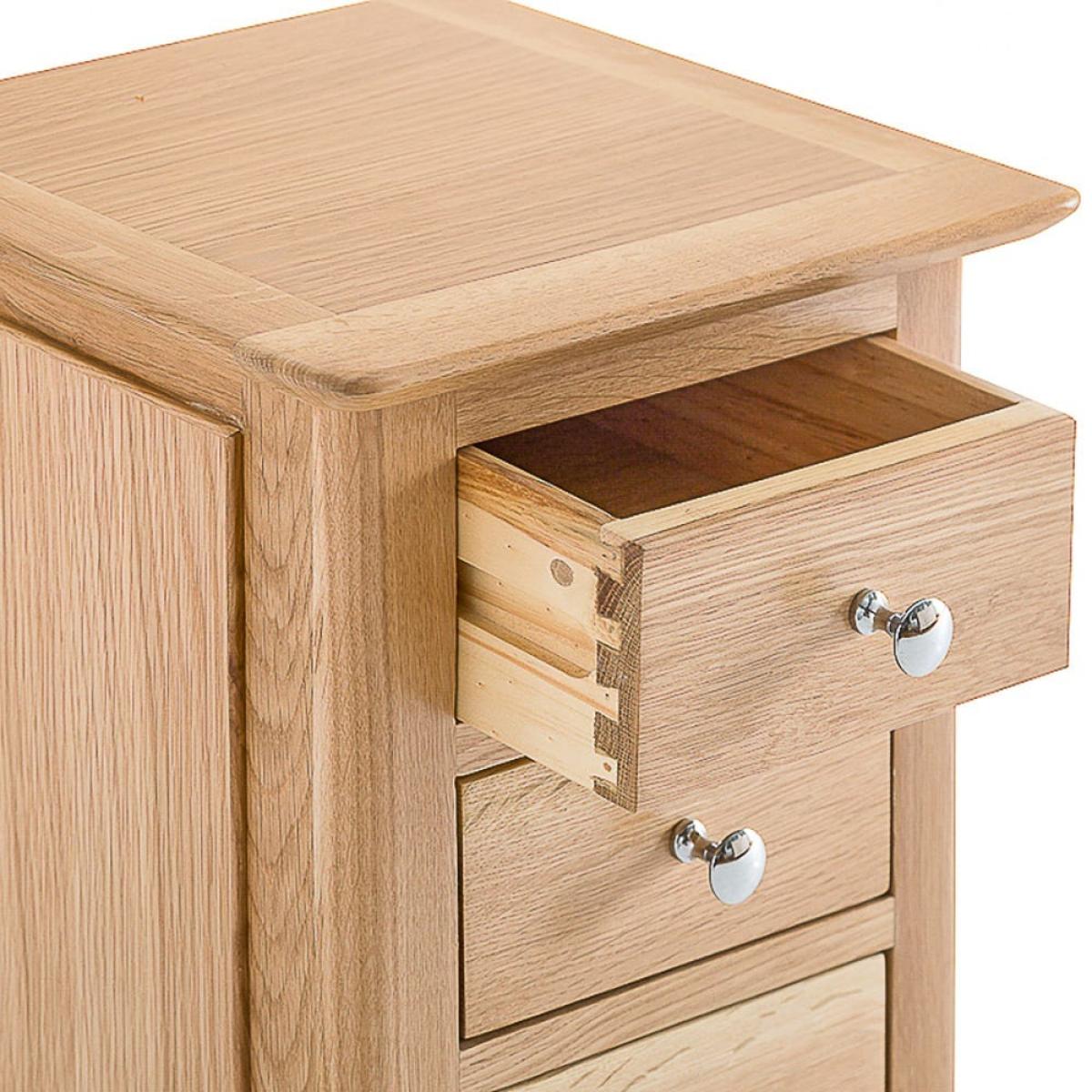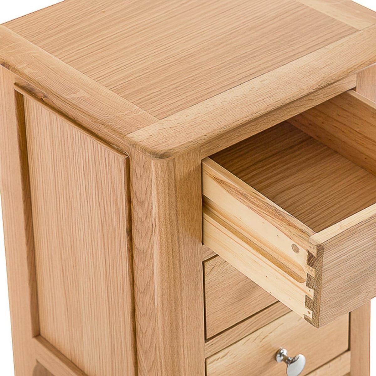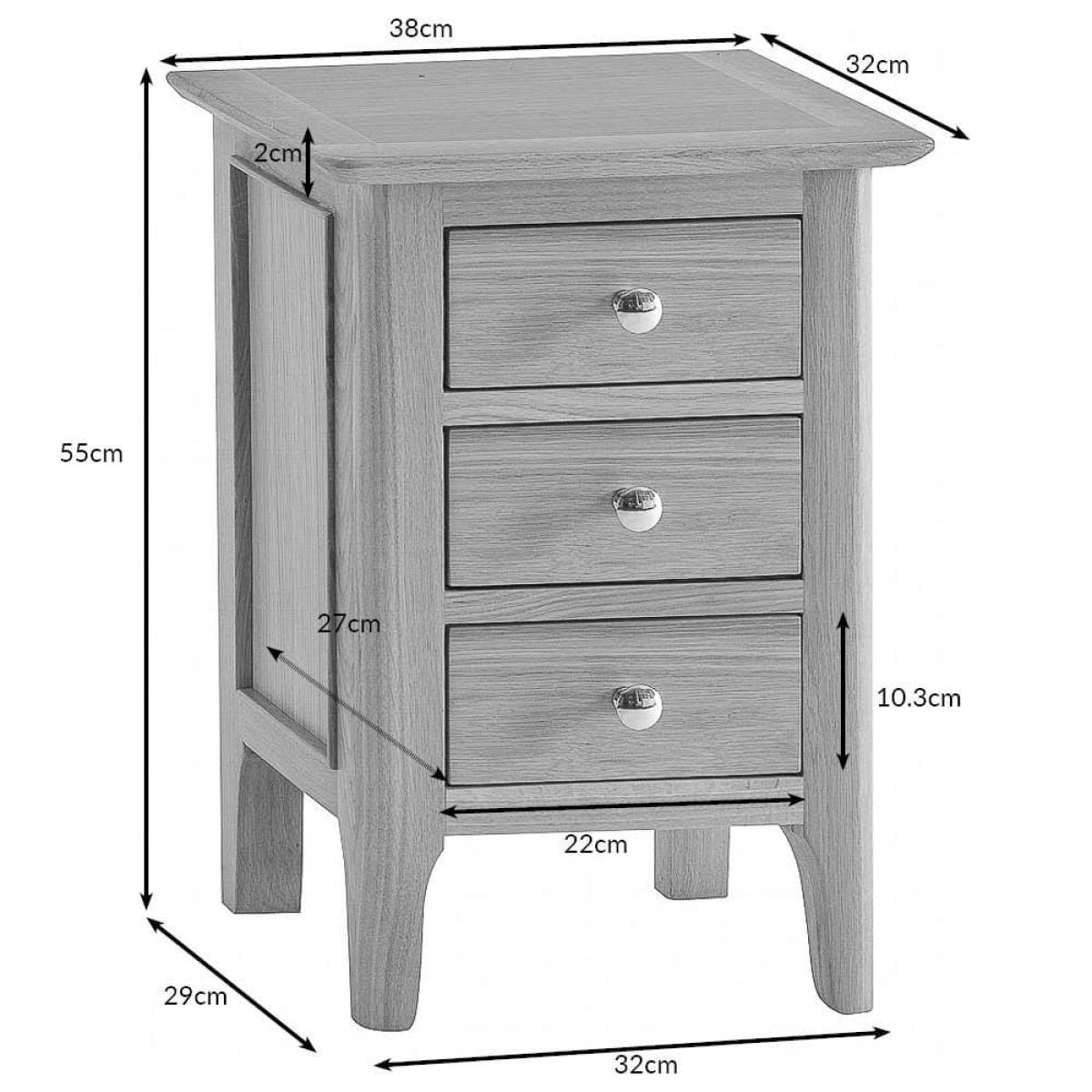 The neat and tidy Bergen oak small bedside table tucks into a cosy corner of your bedroom and helps it feel like home. Snuggle up under your warmest duvet and settle in for a bit of bedtime reading, lit by the glow of a reading lamp perfectly positioned on this bedside table. This is a bedside table built with artisan craft and quality in mind. The trio of handy drawers have each been finely dovetailed. Beautifully tie your bedroom interior together with the addition of this versatile and timeless bedside table.