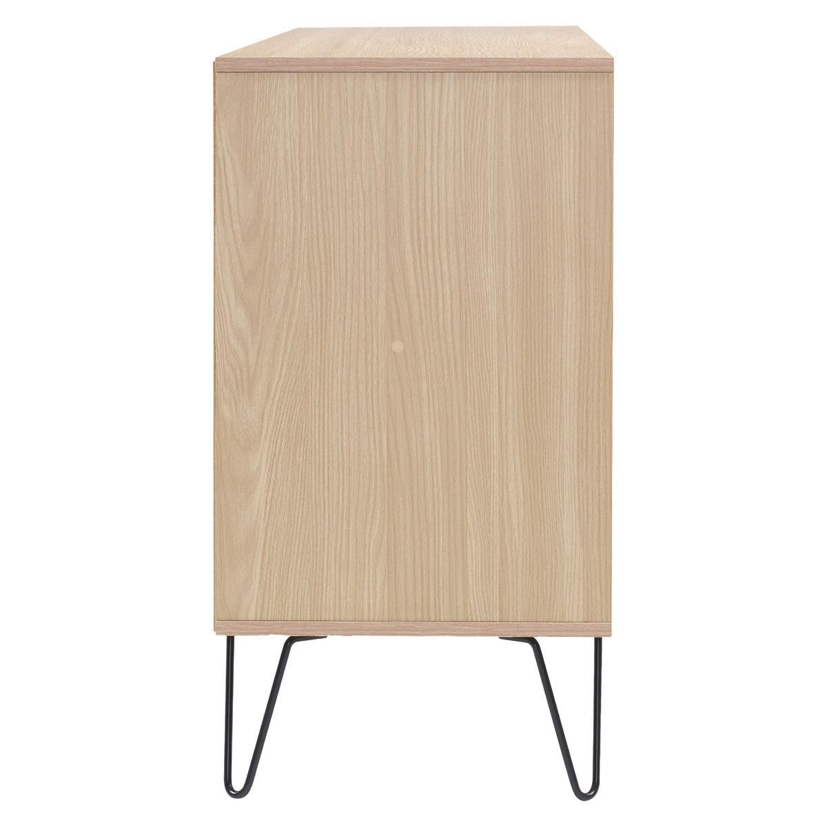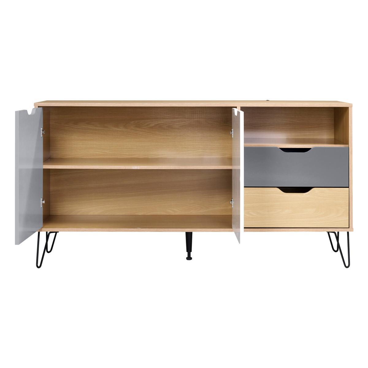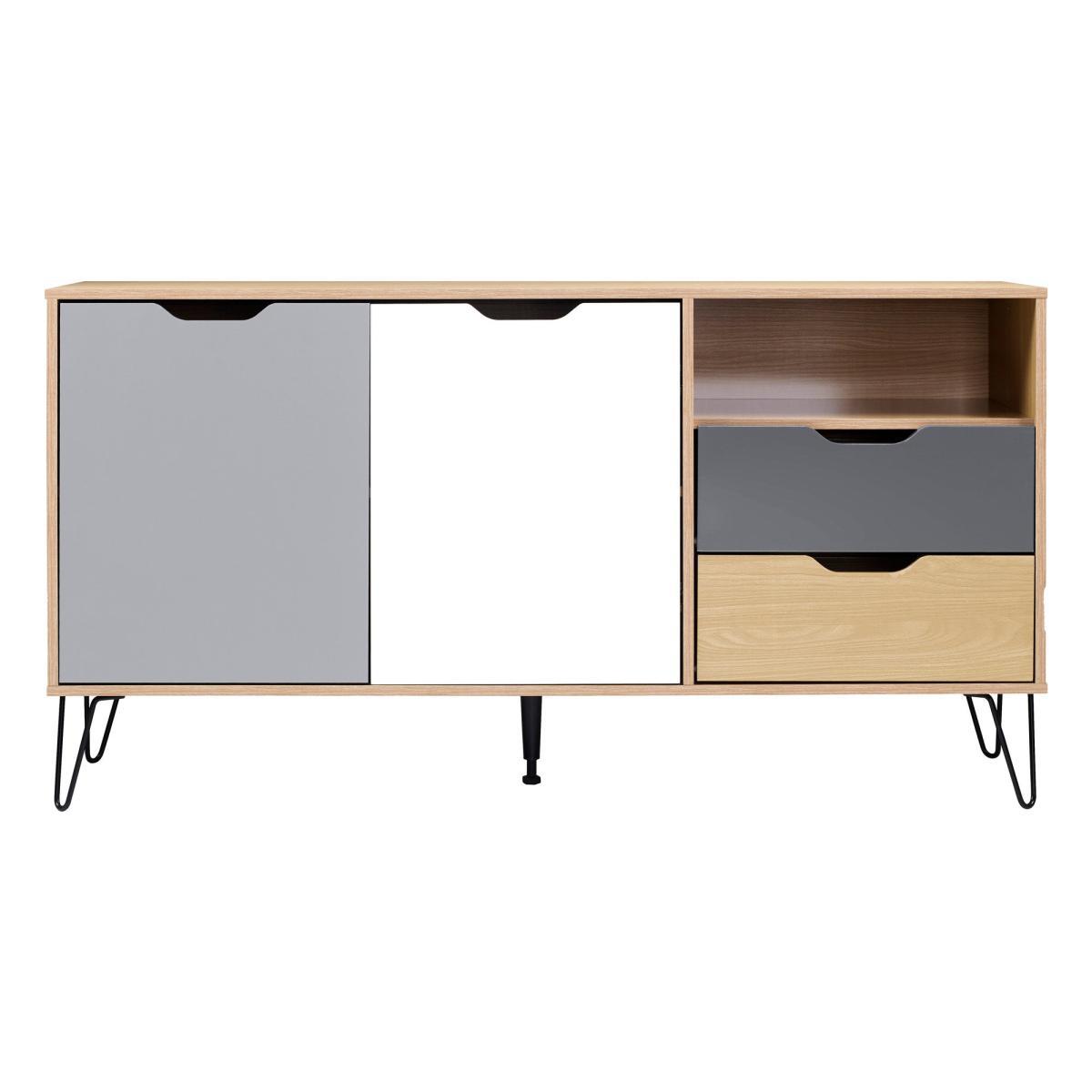 With its oak effect finished carcass, grey and white fronted doors and drawers with cutout handles and black hairpin legs, the Bergen Sideboard would add a contemporary touch to any space. This self-assembly sideboard offers plenty of useful storage space with its double door cupboard, open shelf and two spacious drawers.