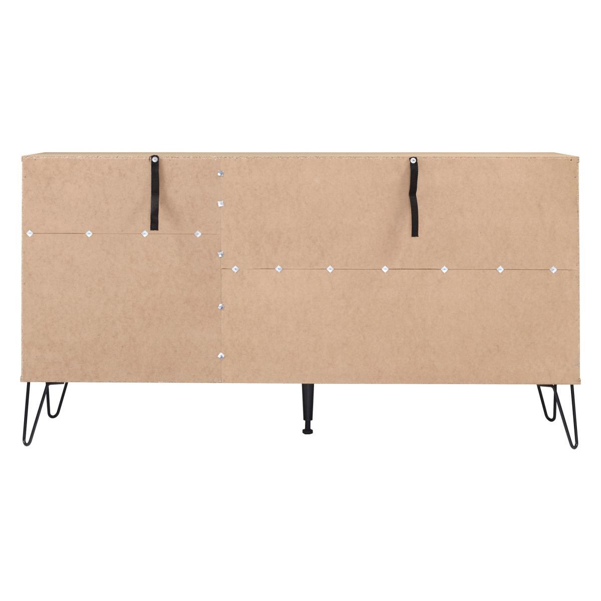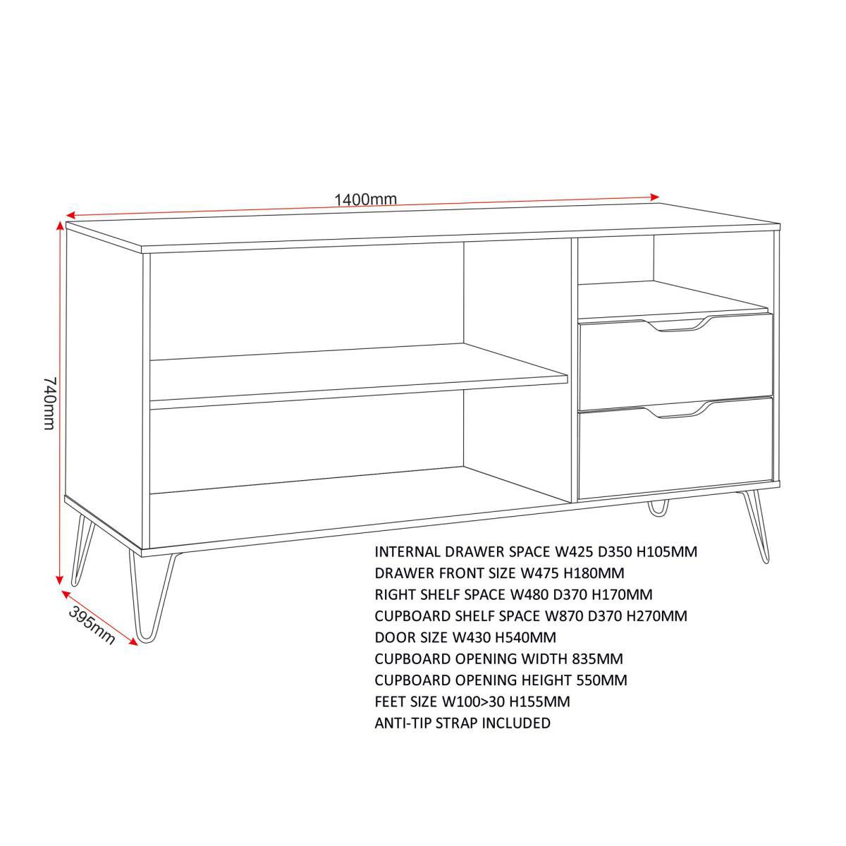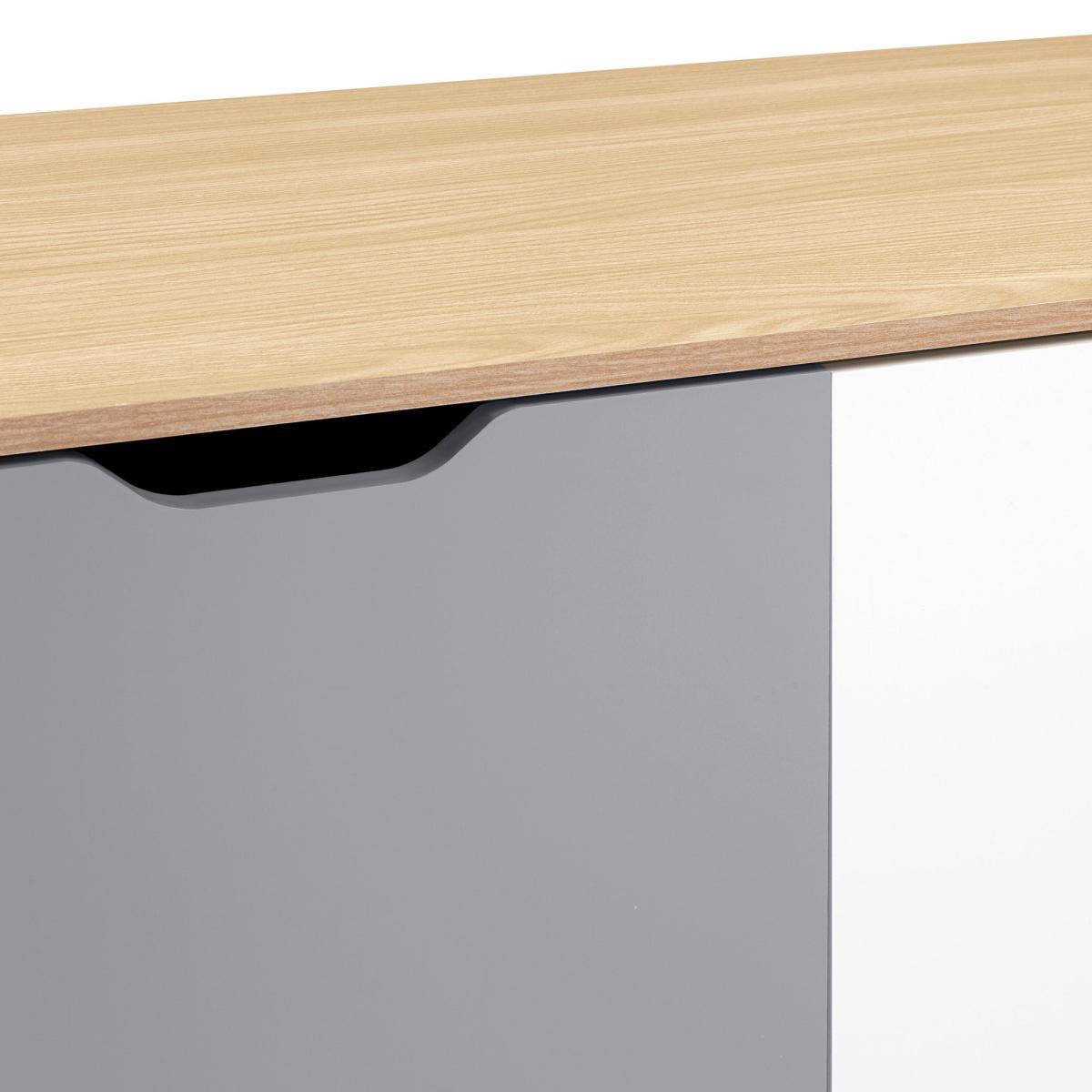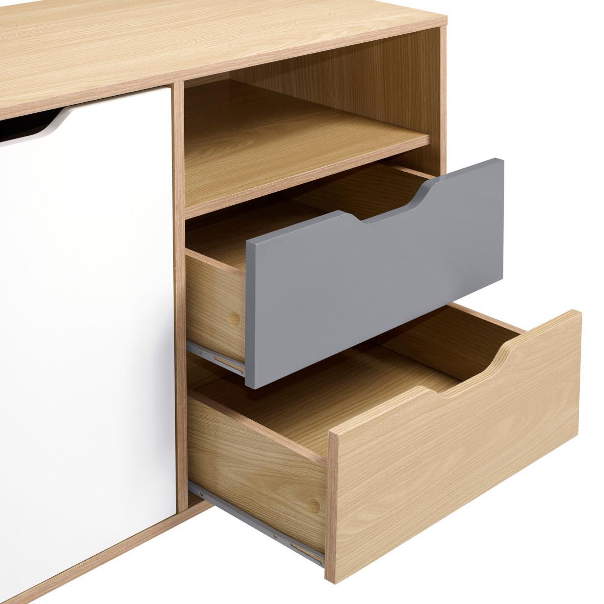 With its oak effect finished carcass, grey and white fronted doors and drawers with cutout handles and black hairpin legs, the Bergen Sideboard would add a contemporary touch to any space. This self-assembly sideboard offers plenty of useful storage space with its double door cupboard, open shelf and two spacious drawers.