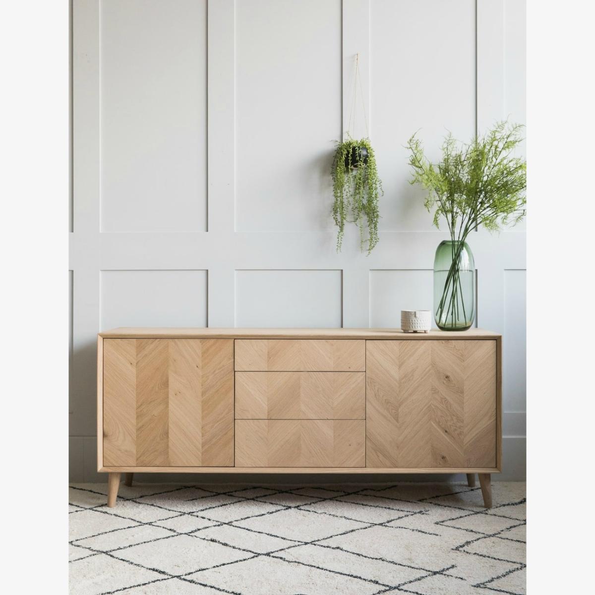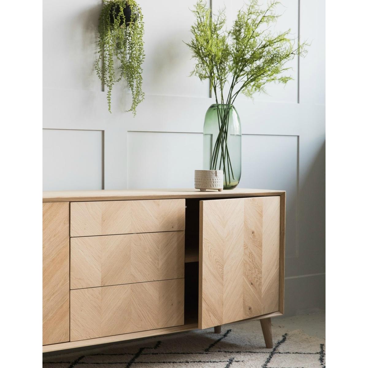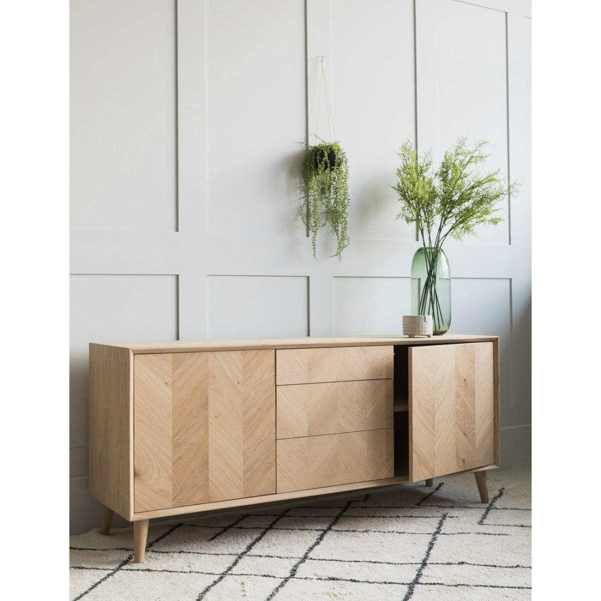 This beautifully crafted oak sideboard would make a stylish addition to any home. The sideboard features three drawers and two doors each revealing two shelves, with push-to-open mechanisms. The rest of our Bergen oak furniture collection can be styled with this sideboard. Some self assembly required.
