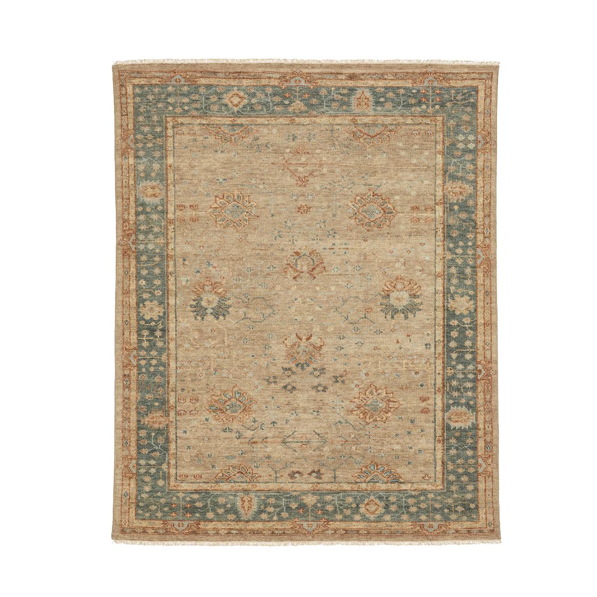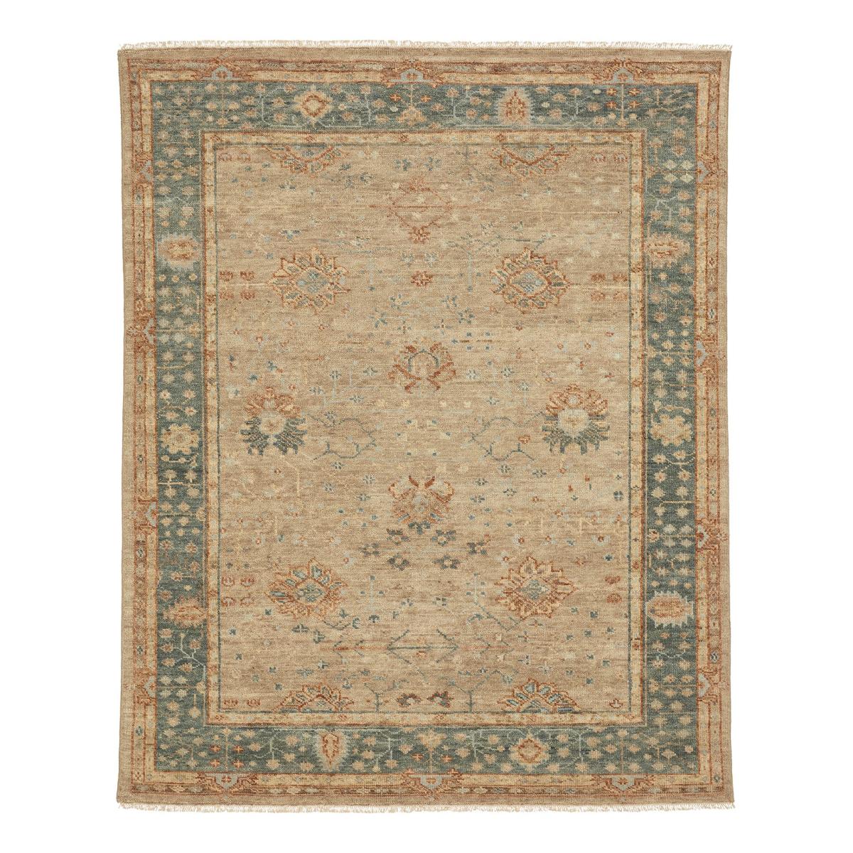 Our Berina is inspired by traditional Persian rugs, as seen in its abstract floral patterns and blue framed edge. The 100% cotton base is hand knotted on a loom with hand-spun wool. It takes skilled artisans 20-45 days to complete each piece, and the manual craft results in each rug having individual characteristics that add to its charm. This is the smaller rug of several available sizes.