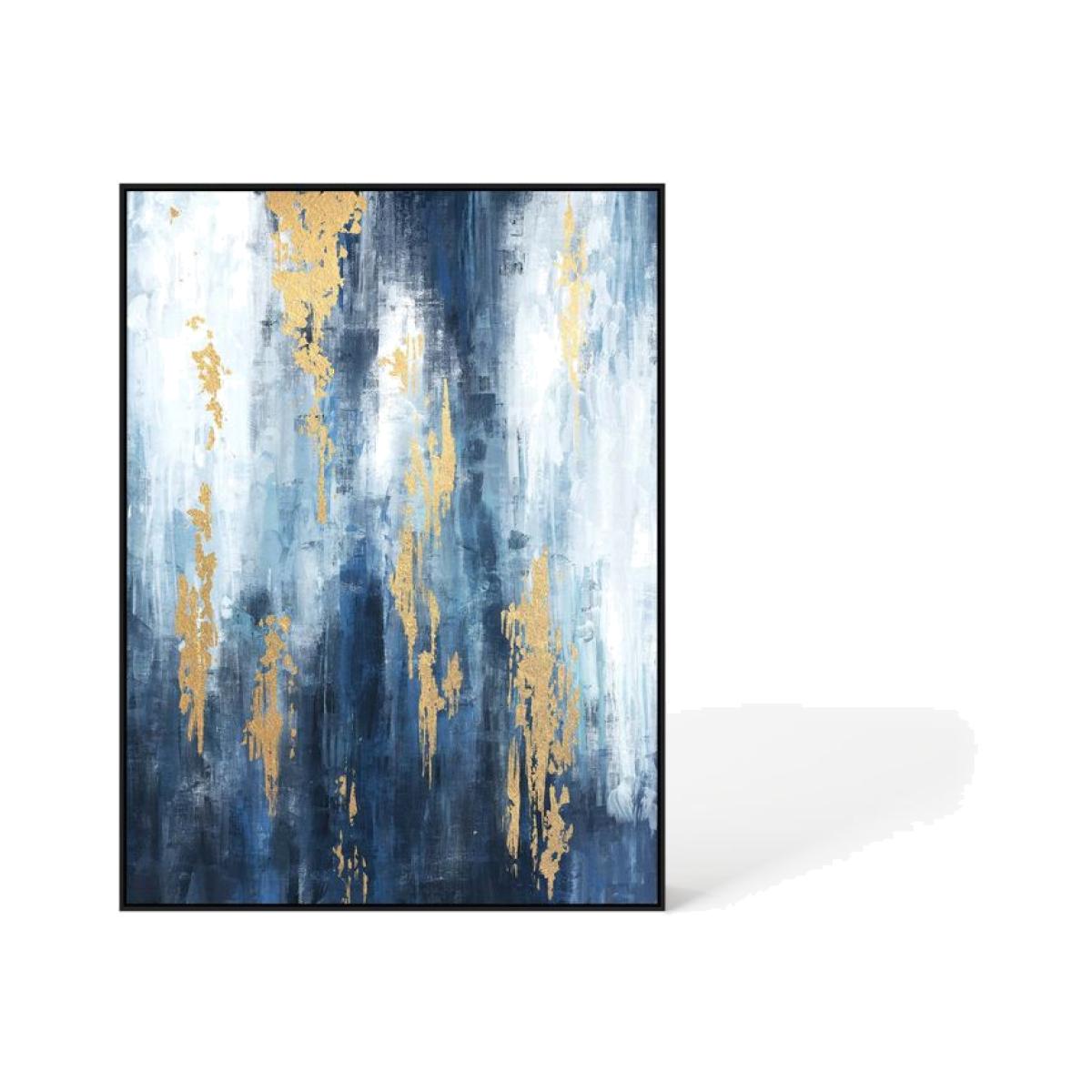 I really like this abstract print because of its versatile colour palette, combining navy, white, and gold accents, which can easily complement both modern and traditional interiors. It works particularly well in contemporary living rooms or bedrooms where a bold, yet sophisticated focal point is desired. For styling, consider pairing it with textured furnishings or metallic accessories to enhance the gold details, and keep surrounding décor minimal to let the artwork stand out. Its horizontal orientation makes it suitable for above sofas or beds, creating a balanced and polished look. Overall, this piece adds a touch of elegance and visual interest without overwhelming the space.