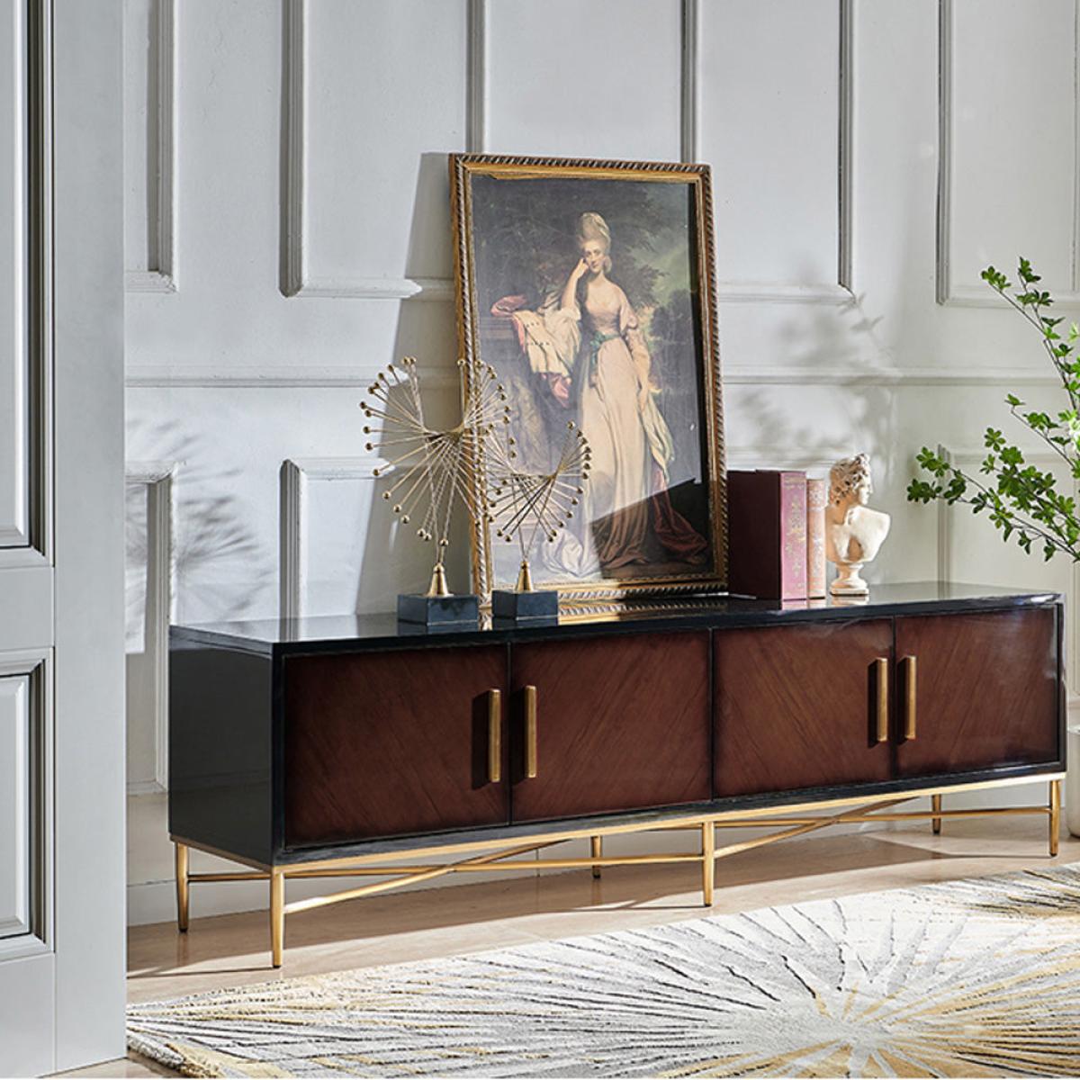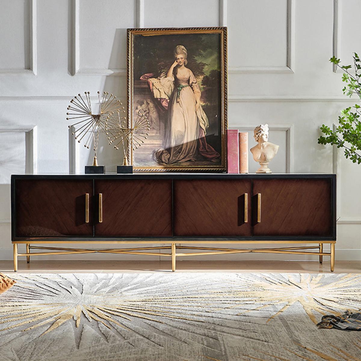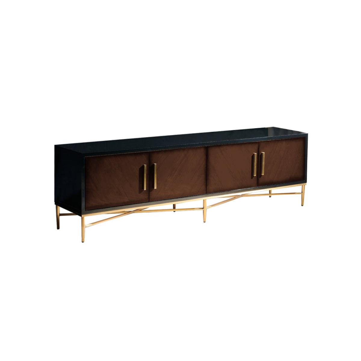 This elegant Berkeley Designs media unit in brown, Buckingham, showcases sleek lines at their finest. Comprised of a sumptuous dark wood veneer with contrasting grain on the four doors, this eye-c. View More. This elegant Berkeley Designs media unit in brown, Buckingham, showcases sleek lines at their finest. Comprised of a sumptuous dark wood veneer with contrasting grain on the four doors, this eye-catching unit has been crafted with brass handles and stands on a stunning slim brass base. A delightful piece that will transform your family's living space. I. T can be easily teamed with a contemporary sofa and sideboard to create a modern and sophisticated aesthetic. Perfect for reinventing a space and maximising the media potential, this piece promises to add volumes of style and class to your new or existing property.
