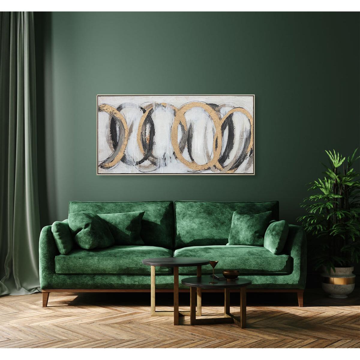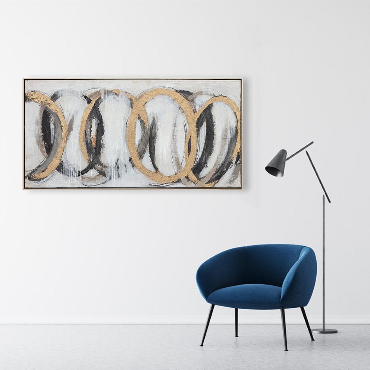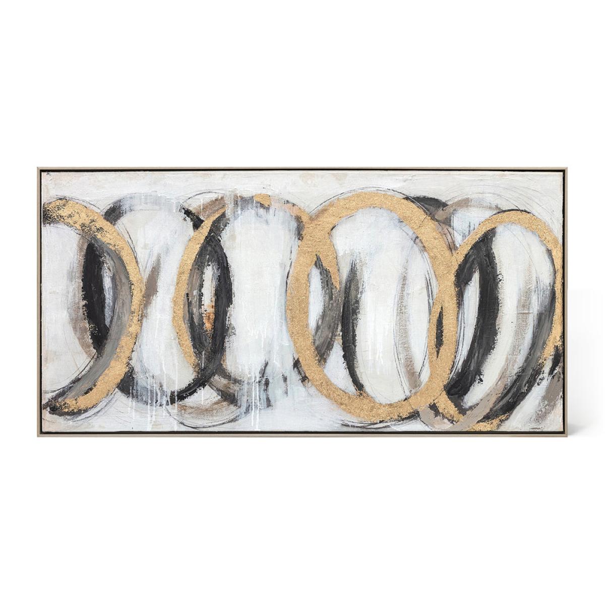 Add immediate impact with this large black and golden abstract painting. This framed oil painting on canvas is striking both in terms of its ring patterning and bold colours and the texture created. View More. Add immediate impact with this large black and golden abstract painting. This framed oil painting on canvas is striking both in terms of its ring patterning and bold colours and the texture created by its palette knife strokes. This is the perfect addition to luxe designs or modern interiors where added interest is required. This number 18 wall art from Berkeley Designs has the appeal of modern art whilst still having a discernible design that should appeal to fans of more traditional pieces. It is perfect for anywhere from luxurious lounges and decadent dining spaces to large bedrooms, hallways and office spaces.