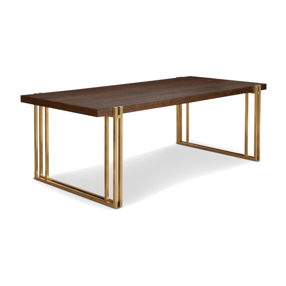 Give your dining room the edge with the Winchester dining table. The tabletop features an attractive walnut finish which will provide a great contrast for your tableware. Imagine the table adorned. View More. Give your dining room the edge with the Winchester dining table. The tabletop features an attractive walnut finish which will provide a great contrast for your tableware. Imagine the table adorned with a crisp white dinner set, fresh flowers and candles to set the ambience. The legs of the table are what turn this piece into a showstopper, brass legs in a simple yet eye-catching design that give an art deco feel to finish off the appearance. Whether you favour sleek modern interiors or a more classic and cosier feel in your home, the Winchester has the versatility to work its charm.