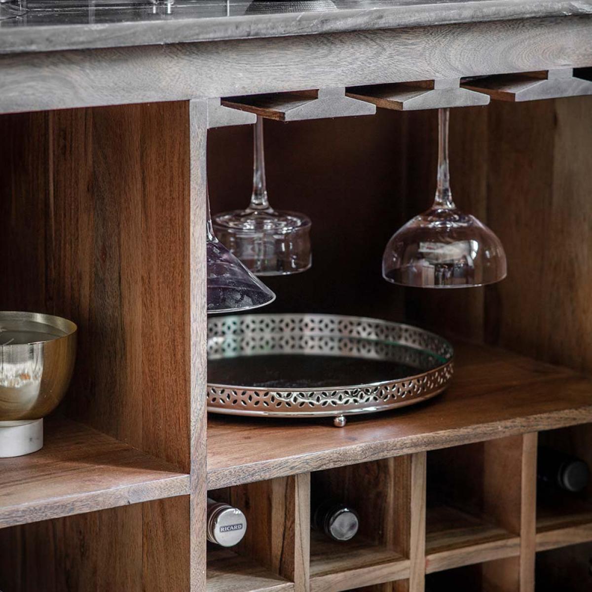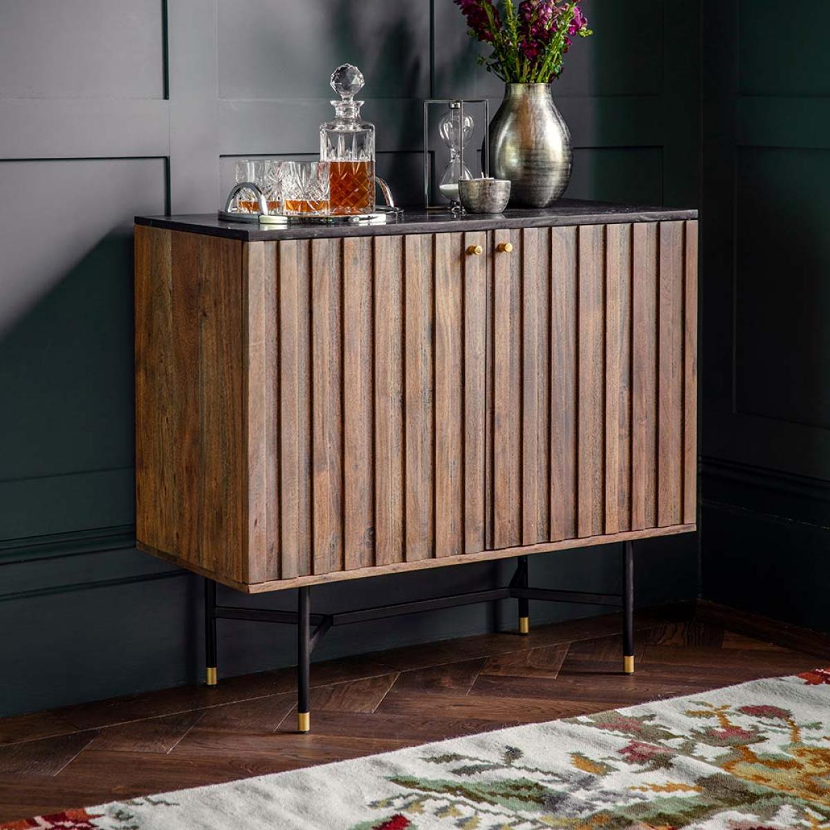 Solid Acacia wood and elegant black marble top, our new Berkeley Bar Cabinet is as eye-catching as it is functional. Three shelves, space for holding your glassware, and a space for up to eight wine bottles – simply open up its double doors to reveal what’s inside. Attractive robust iron legs, gold finish and a smart-black marble top - the ideal combination to create that Art Deco style. In line with the trend for bar cabinets that has taken the interiors world by storm, our Marble Bar Cabinet has everything you need for home entertaining.