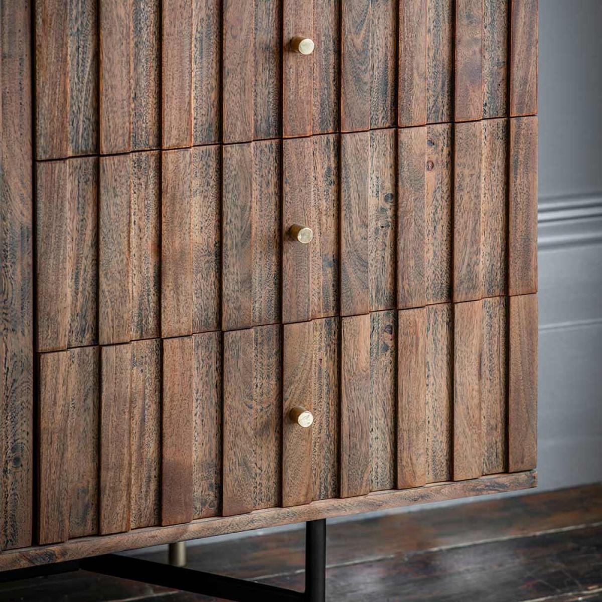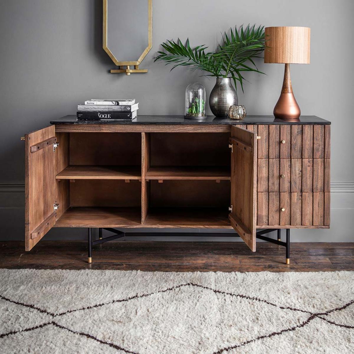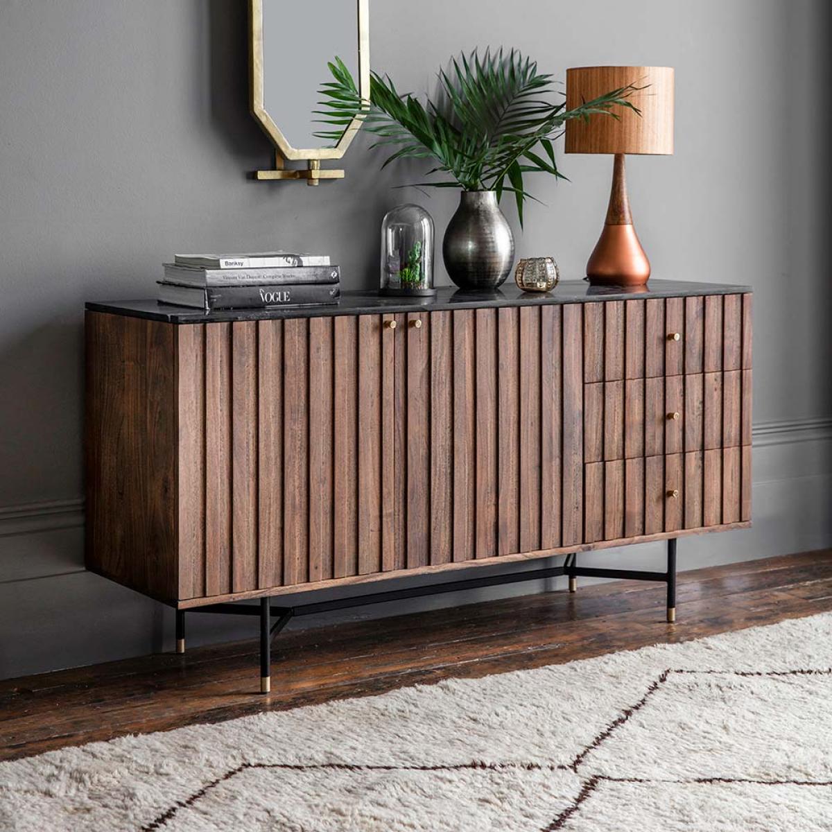 I’m a fan of the Berkeley sideboard for its neat blend of a honed marble top, warm fluted timber and slender metal legs - it works equally well in mid-century, Scandi or contemporary industrial settings. The subtle brass knobs add a little edge without fuss. Position it in a hallway or living space under a round mirror, then keep accessories simple: a statement lamp, a couple of ceramics in muted tones and a small indoor plant to pick up the timber grain. Inside, you’ll find ample room for dining linens or media bits, so surfaces stay clutter-free.