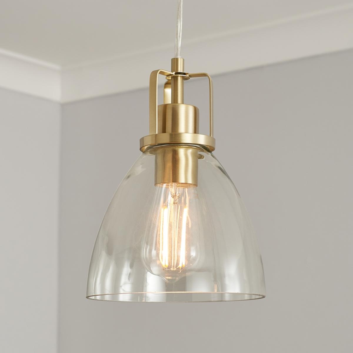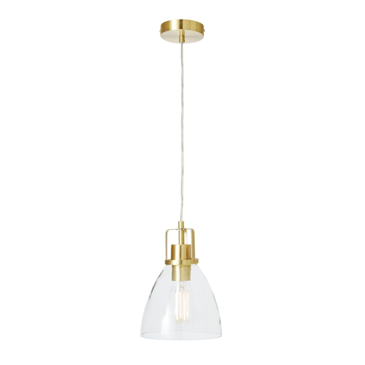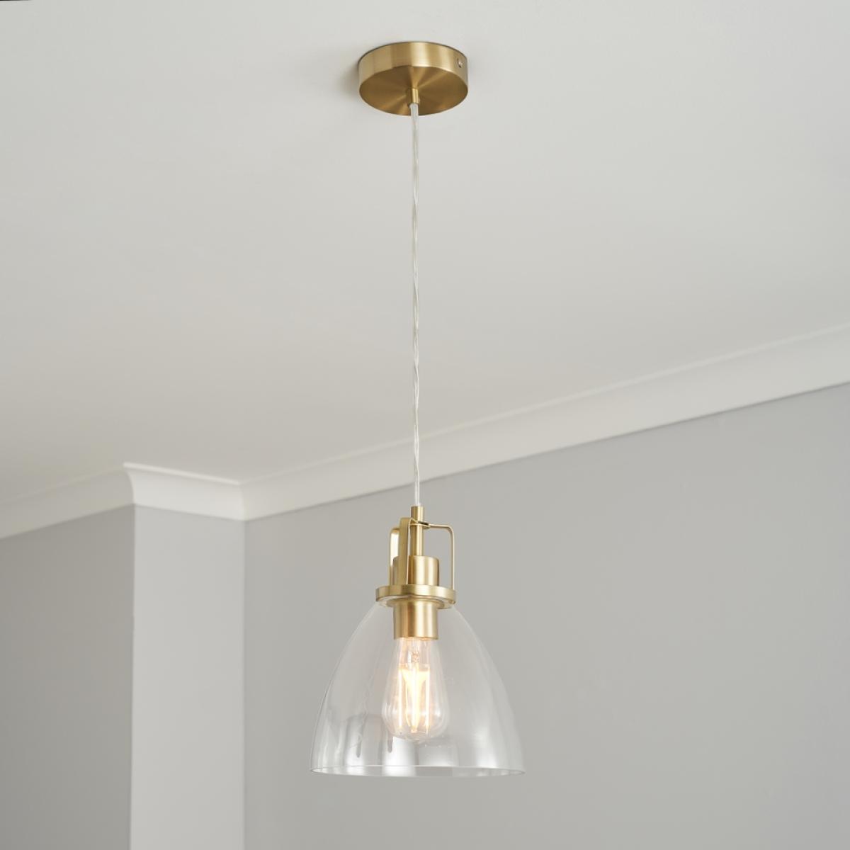 Berkeley is an industrial effect family featuring ceiling pendants, table & floor lamps and wall lamp. Finished in Satin brass detail with a clear glass dome shade will compliment any kitchen/diner space or hallway.