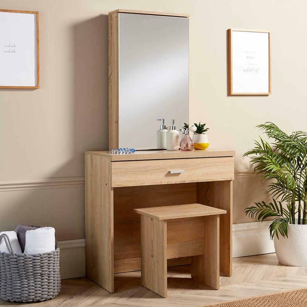 Part of the Berlin Collection our Berlin Dressing Table is a strong, sturdy high-quality design. Available in crisp brilliant White or soft Sonoma Oak finish that's easy to keep looking its best with a quick wipe down. With the handy drawer and ample room on the table, you can have all your hair make-up, and beauty products close to hand and in front of the tall mirror, so you can get ready both for everyday workdays and for dressing up and going out nights. The sliding mirror reveals even further storage, making this dressing table set great value for money.