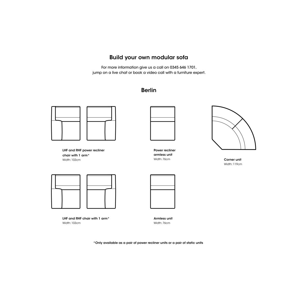 Built for the modern home, the Berlin range combines cool contemporary style with comfy design features to give you the ultimate chill-out spot. Every piece is designed with your complete comfort in mind, from the double padded arms to the pocket sprung seating. Find your perfect position on the power recliner with an adjustable power headrest or put your feet up on the handy storage footstool. Want to make it yours? The armless unit allows you to customise the corner sofa to your preference. Take your pick from a luxuriously soft suede-effect fabric or 100% real leather upholstery in a range of stunning colours. Handmade exclusively for Furniture Village. Stretch out in total comfort on this power recliner corner sofa. It’s fully modular and reversible, so you can build the perfect sofa for your home with ease. Why you'll love it This power recliner corner sofa can be built either right- or left-hand facing to suit your needs. Cool but comfy contemporary design gives you style and comfort. Find your perfect position with the power recliner and power headrest. Double padded armrests for even more cushioning. You’ll love the quality suede-effect fabric upholstery. Non-reclining option also available. Handmade exclusively for Furniture Village. This power recliner corner sofa is part of the Berlin range. What you need to know Medium comfort level. Seat suspension: pocket coil sprung. Seat interior: high-resilience foam. Back interior: fibre. To keep maximum comfort and form, re-dress back and seat cushions daily. Some fabrics can show wear on areas of more use or in direct sunlight. Please allow time for new recliners to ease. Please read our upholstery care guide for more advice. Complete the look with a Berlin chair and storage footstool.
