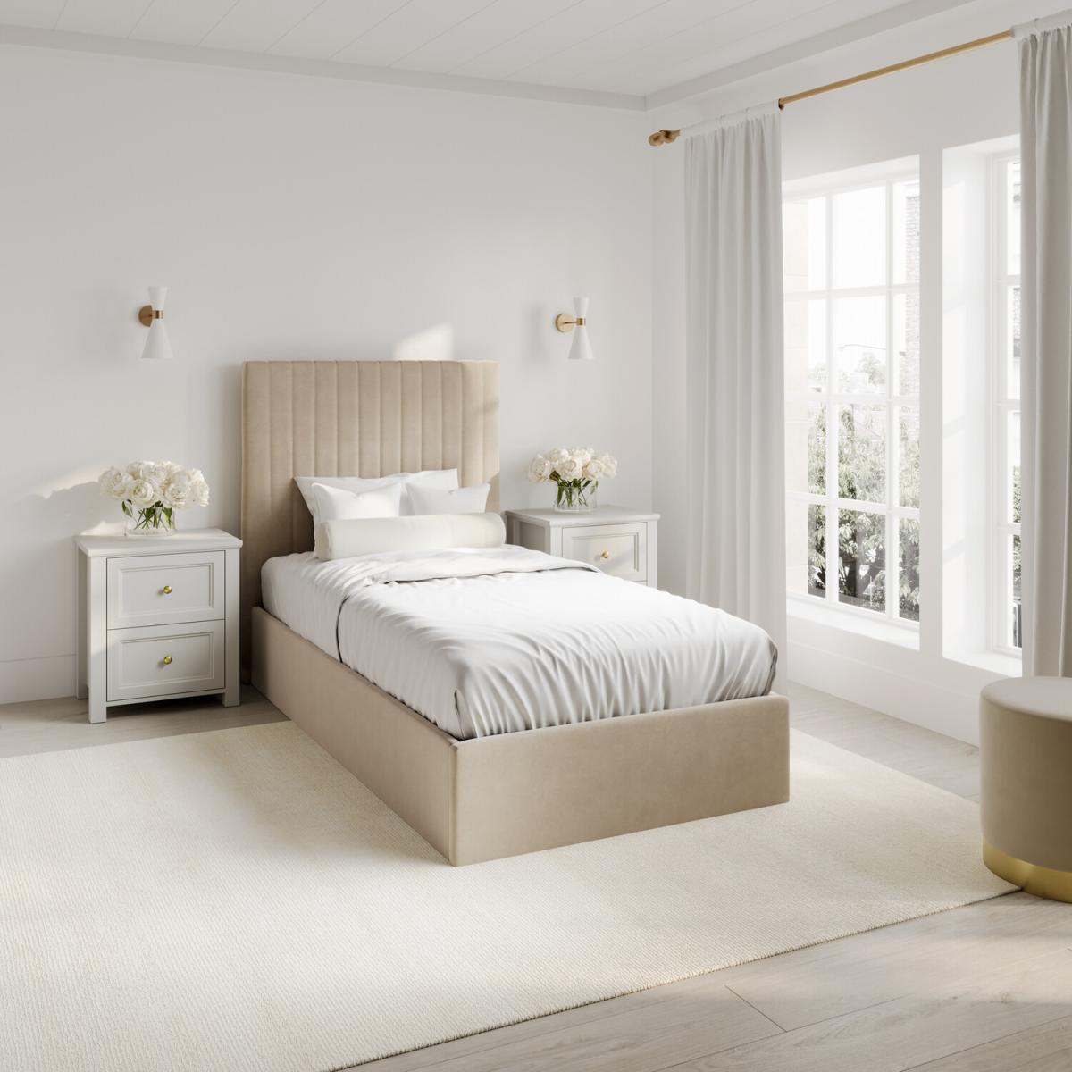 Add a touch of luxury to any bedroom with this Berlin Tall Ottoman Bed. This stylish bed is upholstered in soft velvet, with an elegant headboard that features fluted vertical lines for a sophisticated look. Its versatile colour beautifully complements any existing decor, enhancing your modern home's appeal. Designed with practicality in mind, it includes spacious under-bed storage to provide ample space for tucking away all your bedding.