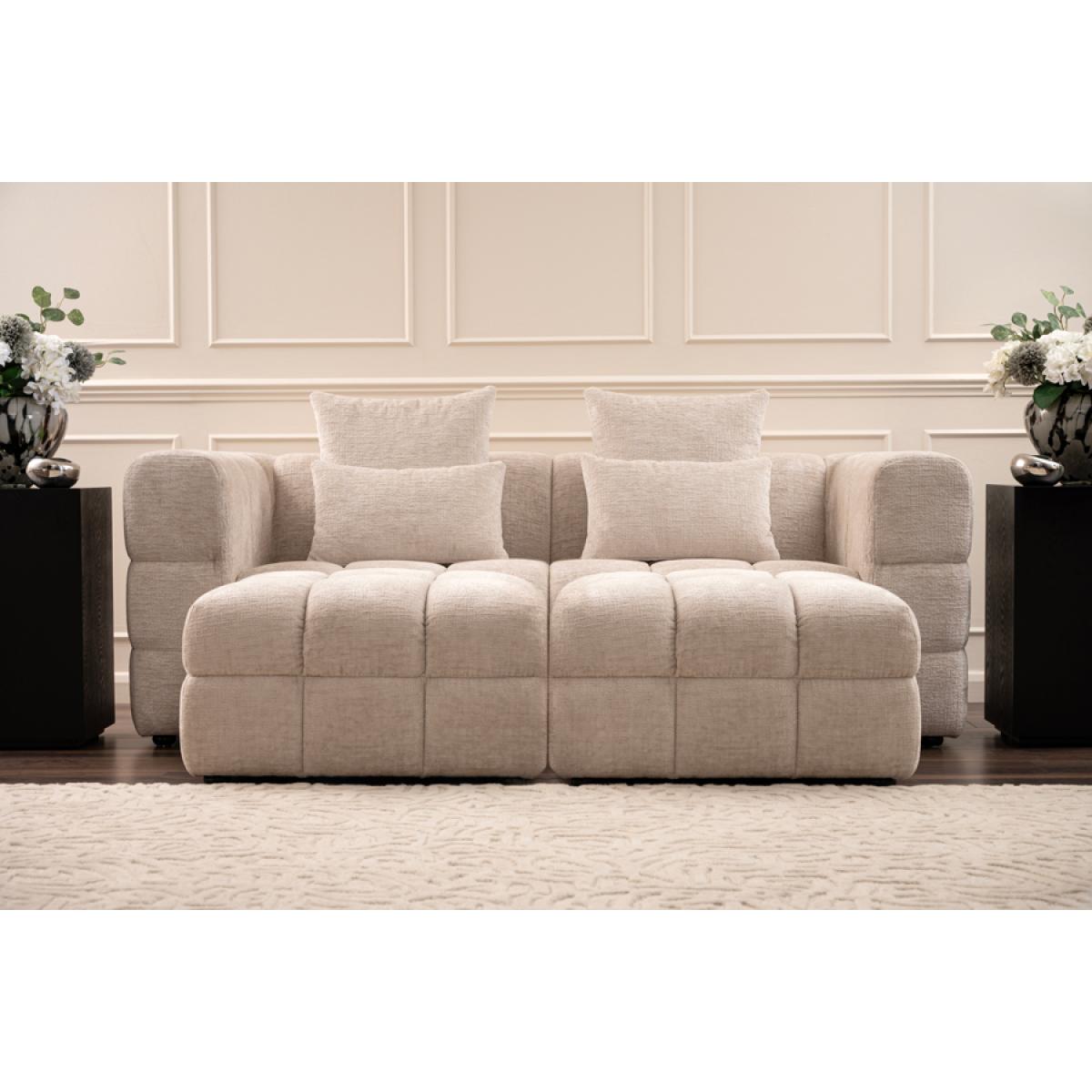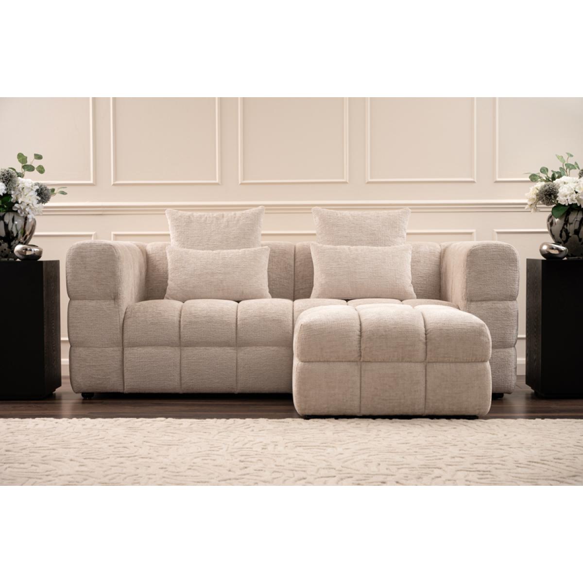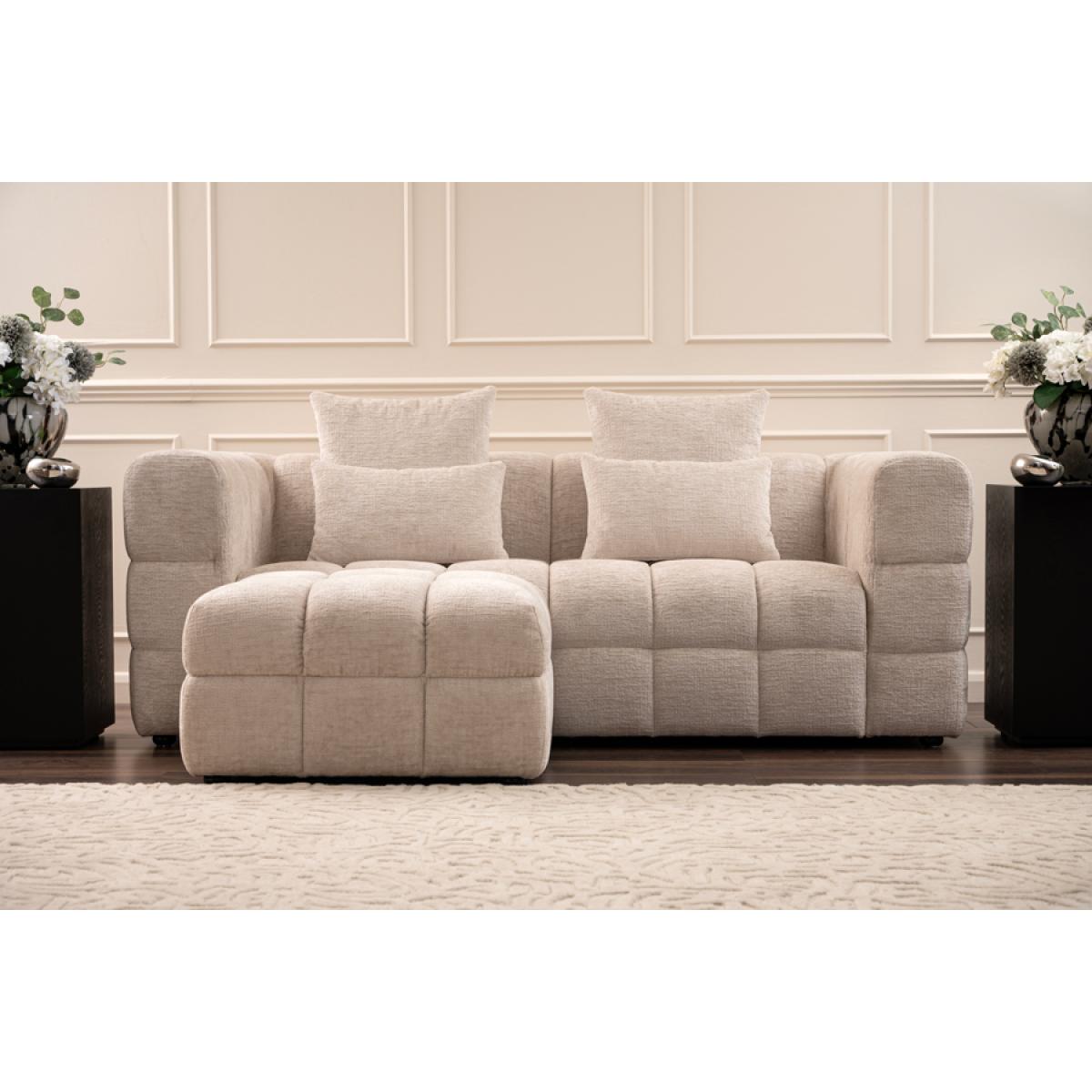 A plush contemporary sofa with an extra deep square tufting design. Comfortable sprung seat and back with generous deep foam and fibre filling. Upholstered in a soft, tactile, chenille fabric. Cushions filled with soft duck feathers. Pair with the Berlin Footstool (or two) to create a luxurious lounging zone. This listing is for one sofa only, the footstools are not included in the price. In the unlikely event that you are dissatisfied with your sofa let us know (within 7 days) and we will happily collect it and fully refund you, including the return shipping cost.