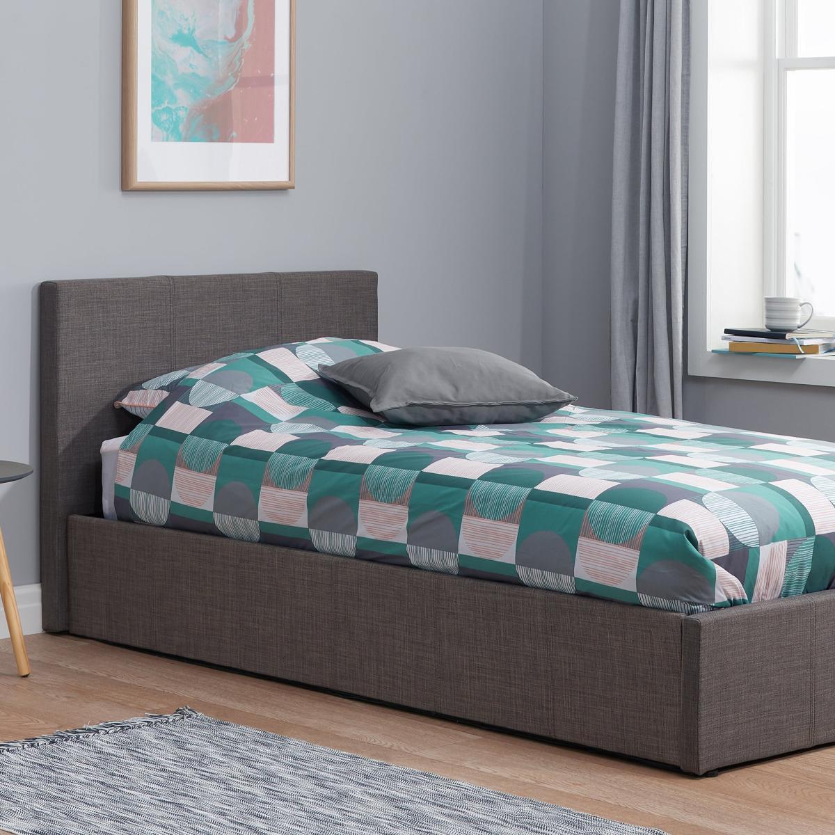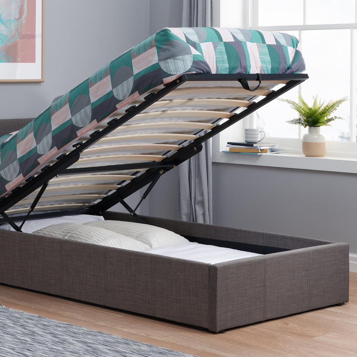 * Stylish and timeless linen fabric finish* Sprung slatted base- for added support and comfort* Cushioned classic headboard and low footboard* End opening ottoman that opens to reveal ample under bed storage The Berlin Upholstered Ottoman Bed is upholstered in grey fabric, adding both style and versatility to any bedroom. Strong gas lifts allow access to the generous storage space below and the bed includes a protective base sheet. Please note: Price is for bed frame only and does not include mattress. Please note, unfortunately we cannot deliver this item to Northern Ireland or the Channel Islands.
