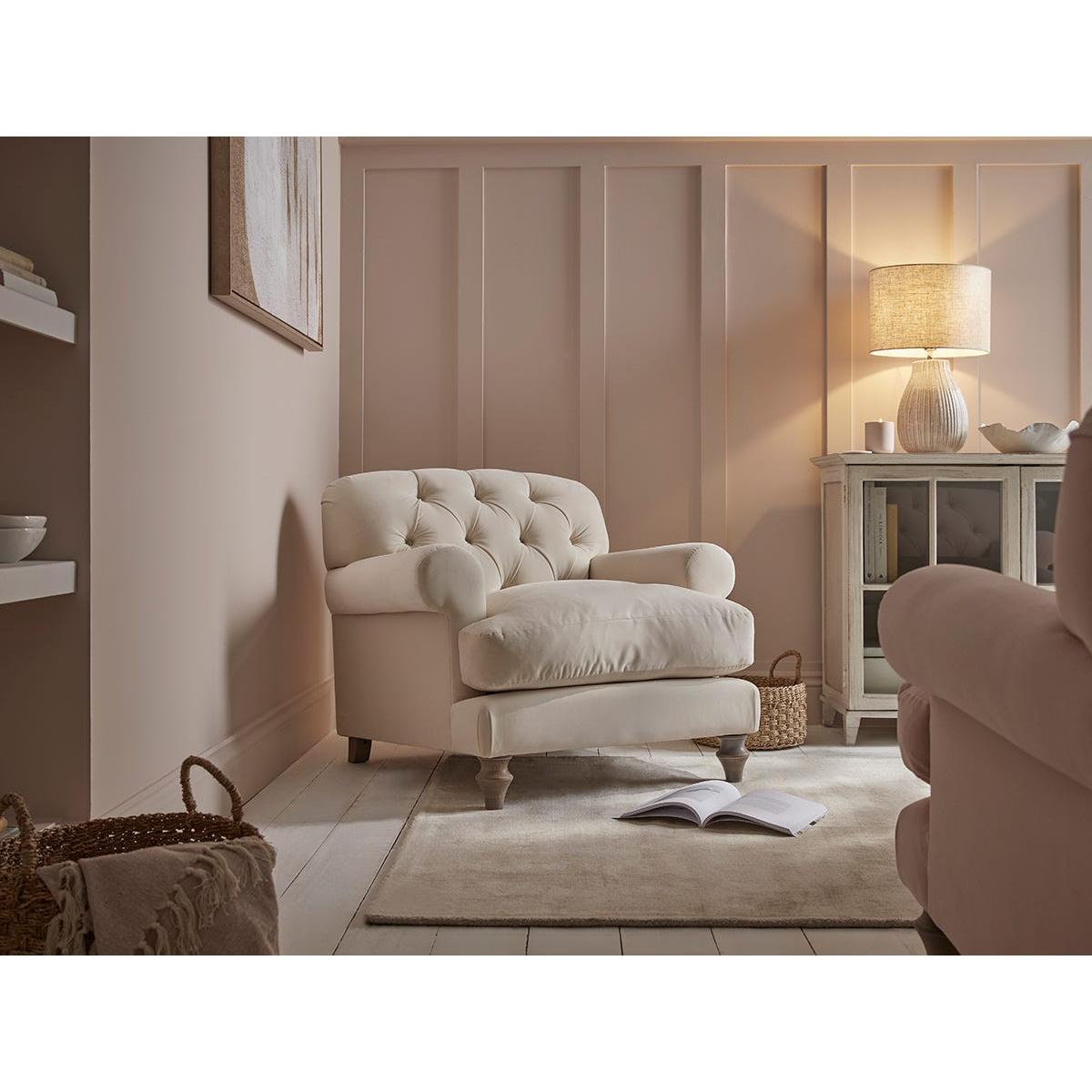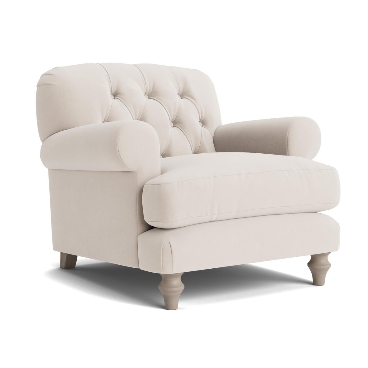 A pretty partner to our Bern sofa, the Bern armchair offers classic English lines updated with a smart buttoned back. Hand tufted by craftsmen here in the UK, the delightfully plump design features low recessed rolled arms and deep squishy seats. Smart hand turned wooden legs complete the look. The Bern range includes two seater and three seater sofas, an armchair and an ottoman. Our Bern collection can be upholstered in a choice of 33 distinctive shades and five fabrics to suit your style.