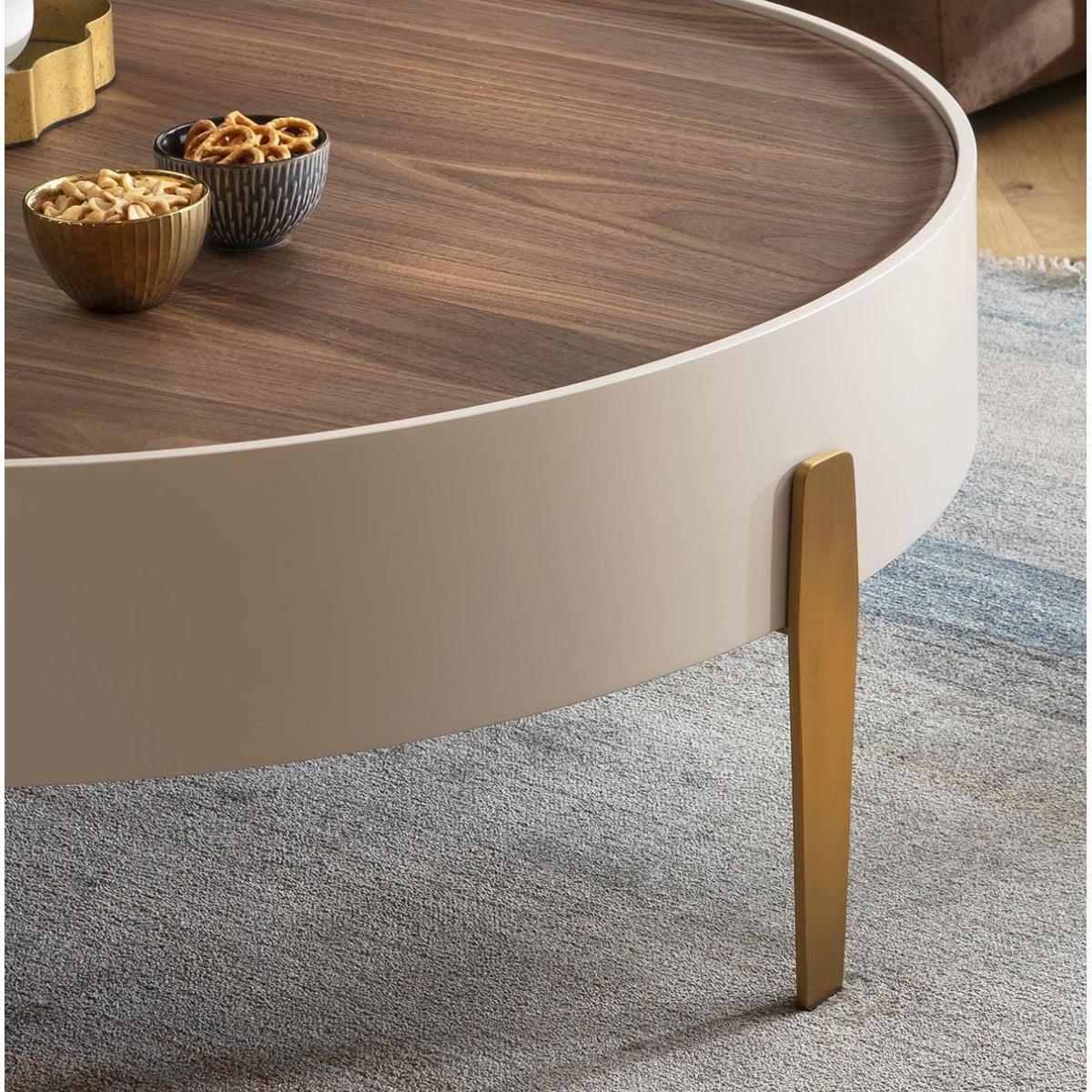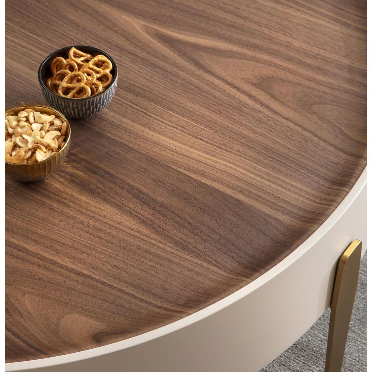 Revamp your space with our modern round coffee table, a perfect blend of luxury and functionality. This 92cm walnut wood veneer top side table features a matte chalk painted finish body and brushed gold stainless steel legs. An ideal coffee table for modern living rooms and keeping your essentials within reach. The Bernardi minimalist coffee table is a stunning addition to any living room or seating area. The clean lines and round shape exude modern elegance, while the premium materials create a timeless piece. The neutral yet chic colour palette ensures it complements various interiors, making it a versatile choice for any decor style. The coffee table's top is crafted from high-quality walnut wood veneer, providing a warm and rich texture. The body is finished in smooth matte chalk, giving it a soft, sophisticated look. Sturdy and stylish, the brushed gold stainless steel legs add a touch of luxury to this modern coffee table. Their sleek design enhances the table's overall aesthetic, ensuring durability while maintaining a light and airy feel. These legs perfectly balance the natural tones of the wood and matte finish. W92cm D92cm H33cm Durable Walnut Veneer Tabletop Contemporary Round Coffee Table