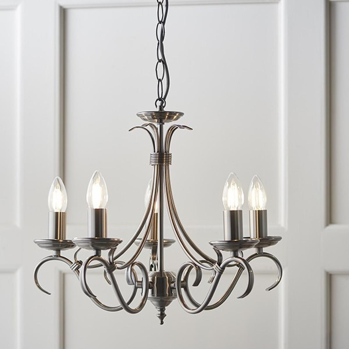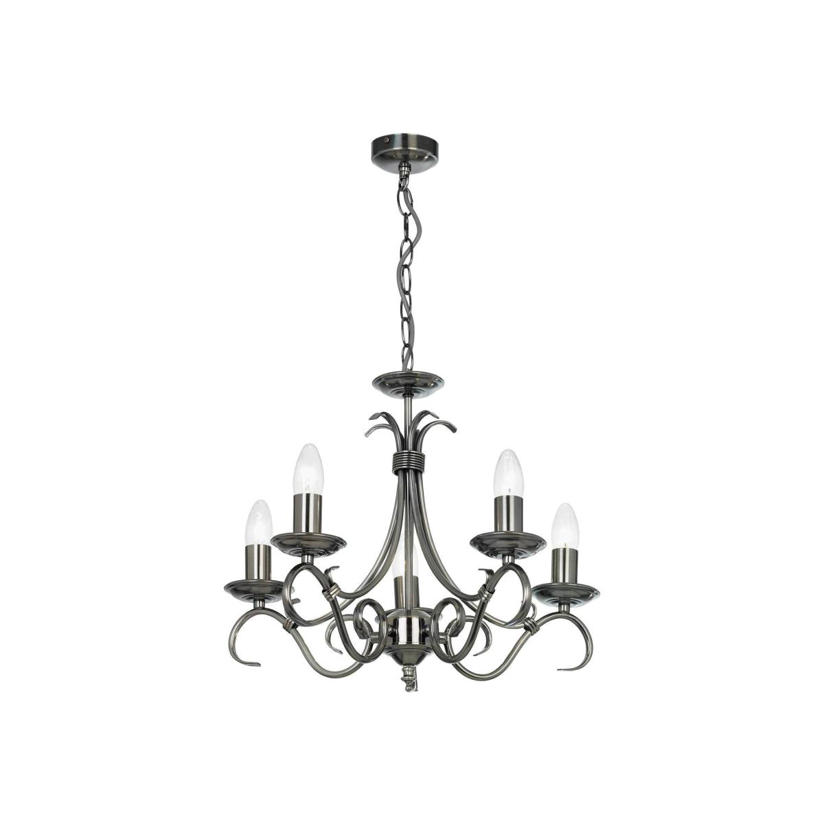 A 5 light ceiling fitting with scrolled arms in antique silver effect finish. suitable for use with LED lamps, height adjustable and dimmable. Matching items available and also comes in an antique brass finish