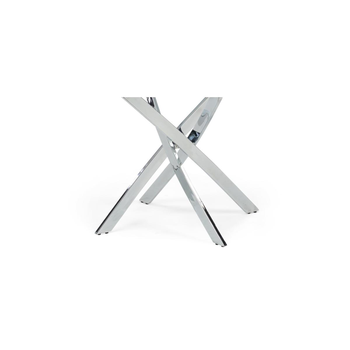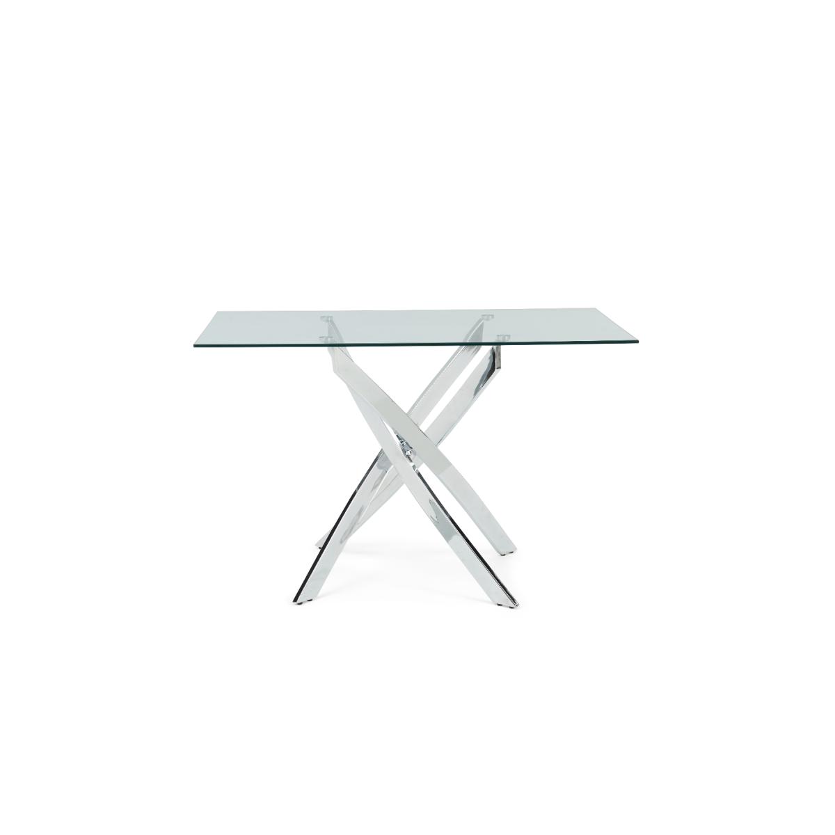 The Bernini dining table features a sleek design with a glass top and metal legs that provide a beautiful contrast to the table's surface.
