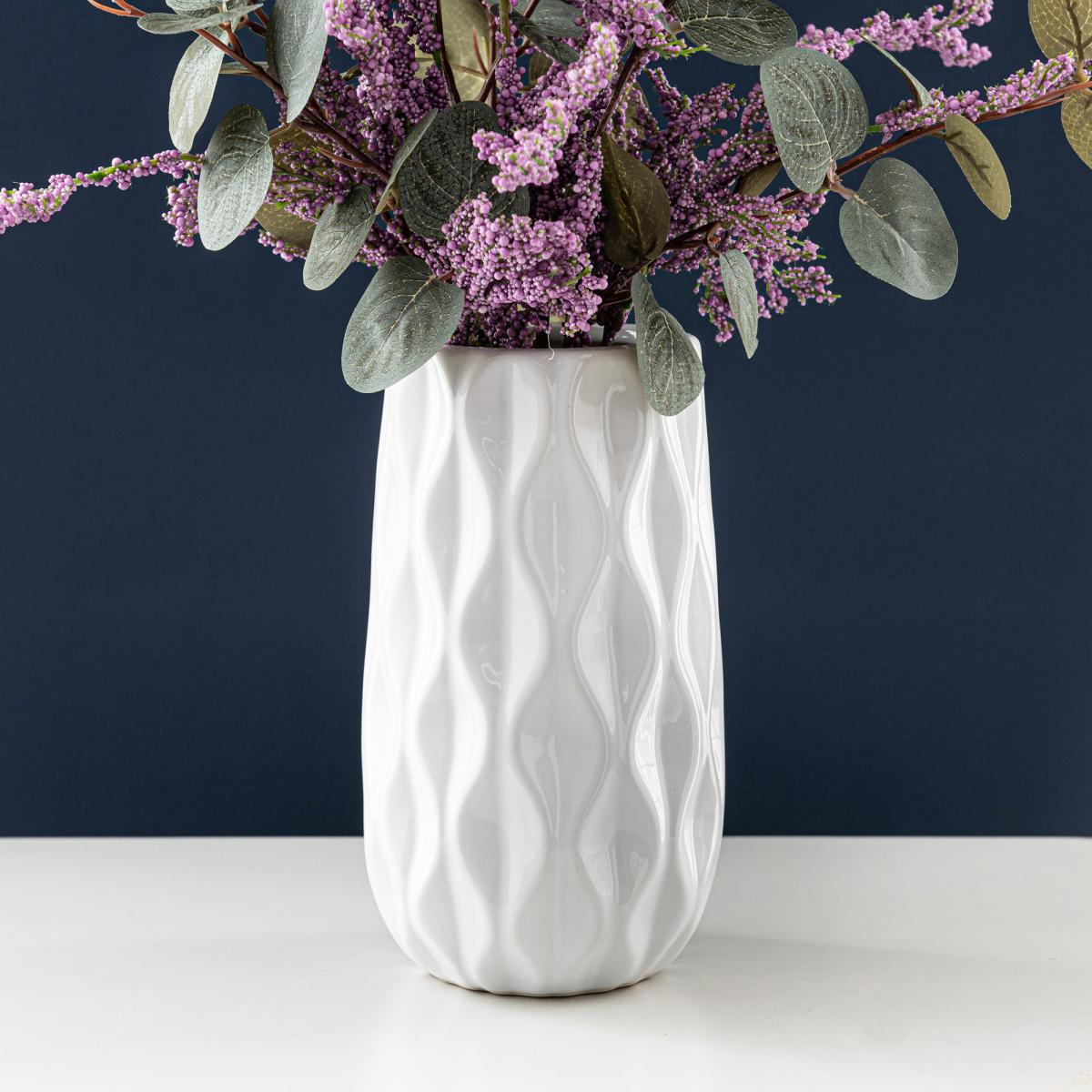 Based in a white ceramic vase with a ribbed textured design, this delicate mini berries and eucalyptus arrangement will add a vibrant purple pop of colour to your home. Ideal for displays on shelves, tables and sideboards, the low maintenance piece will look fabulous in any room of the house.