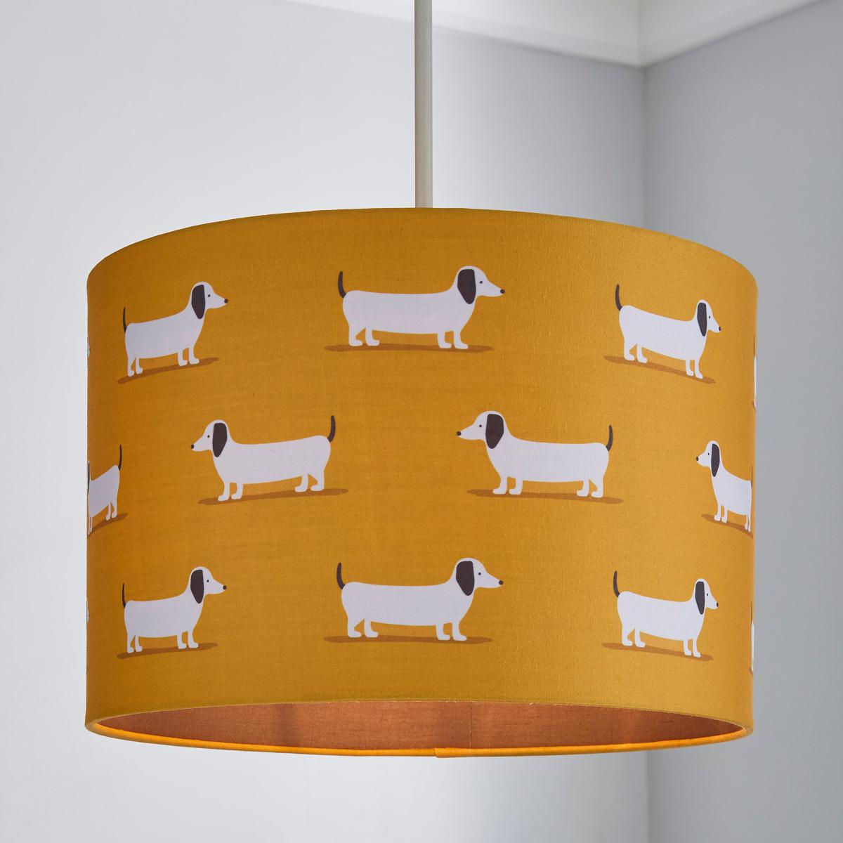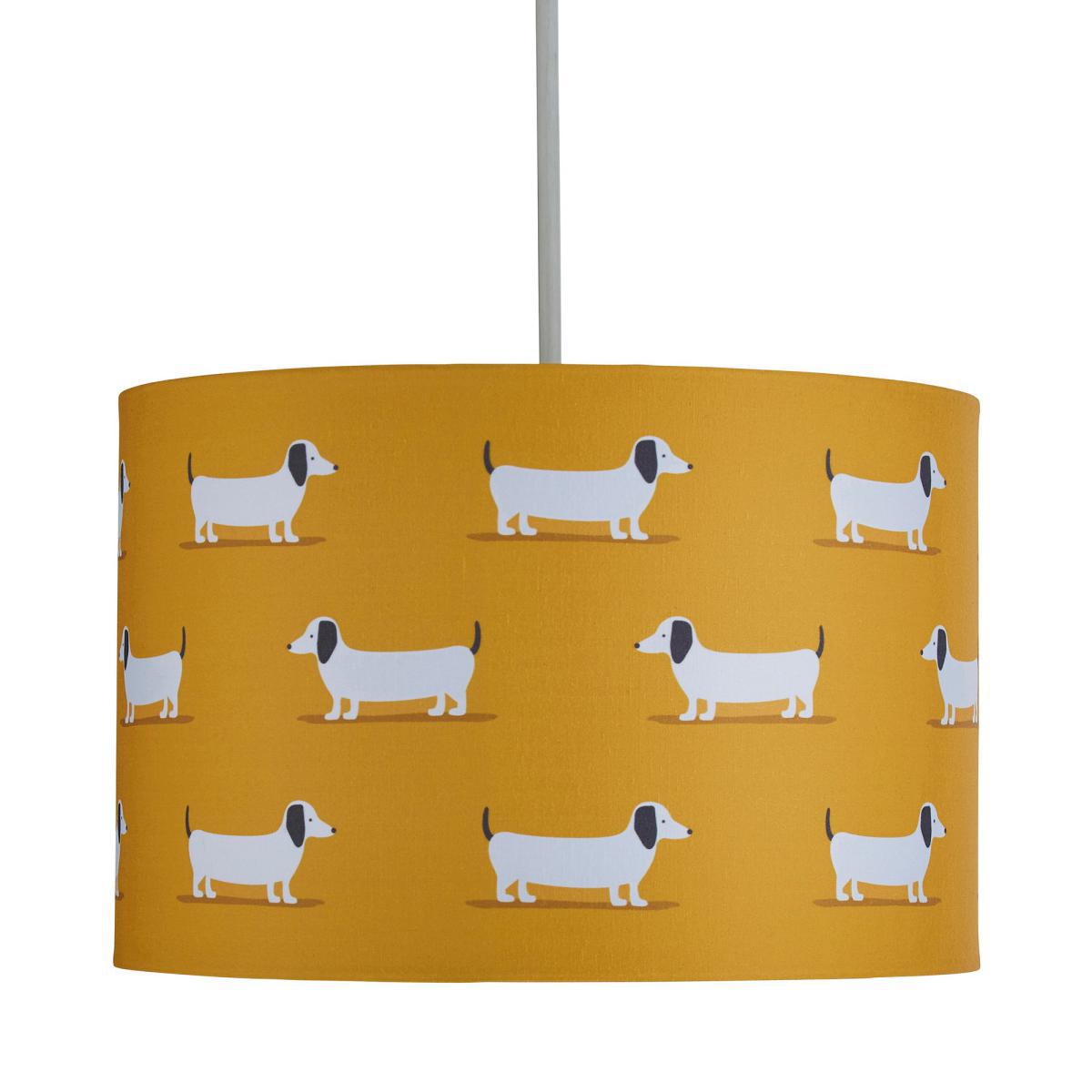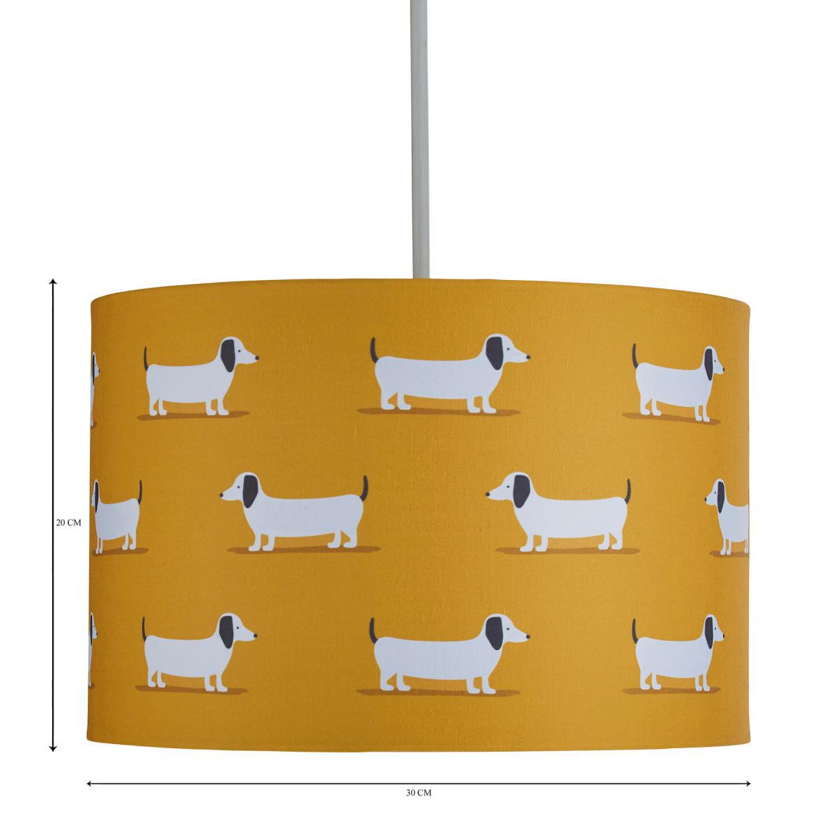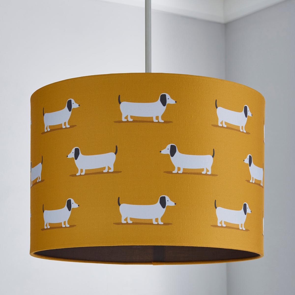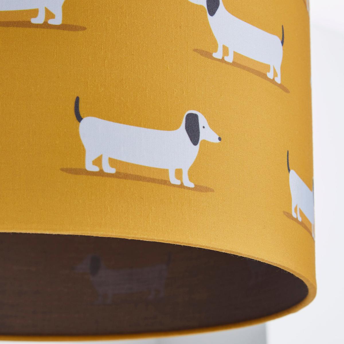 Emblazoned with the Bertie sausage dog motif, this vibrant drum shade is finished in an ochre, cotton-rich fabric, perfect for adding a characterful touch to any space.