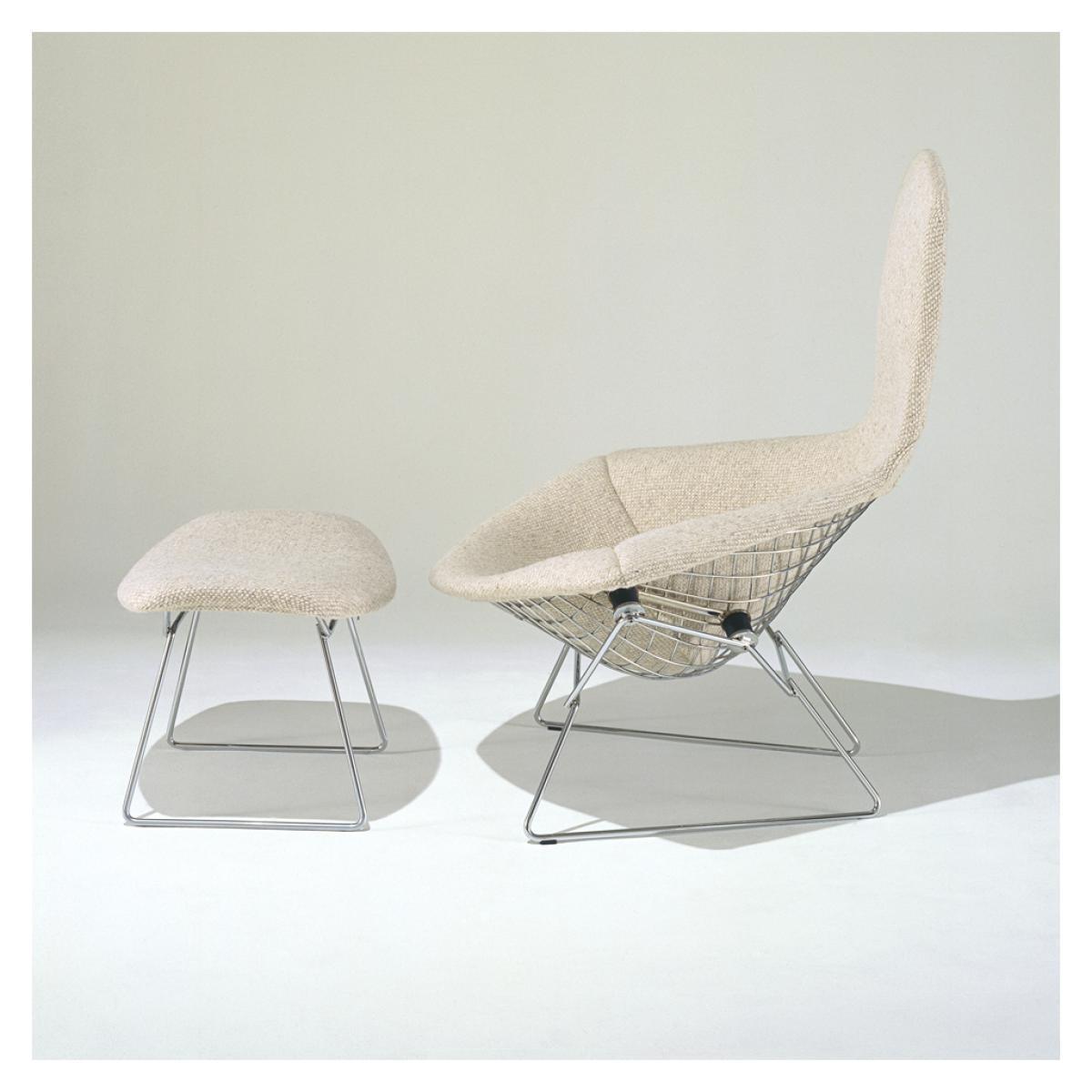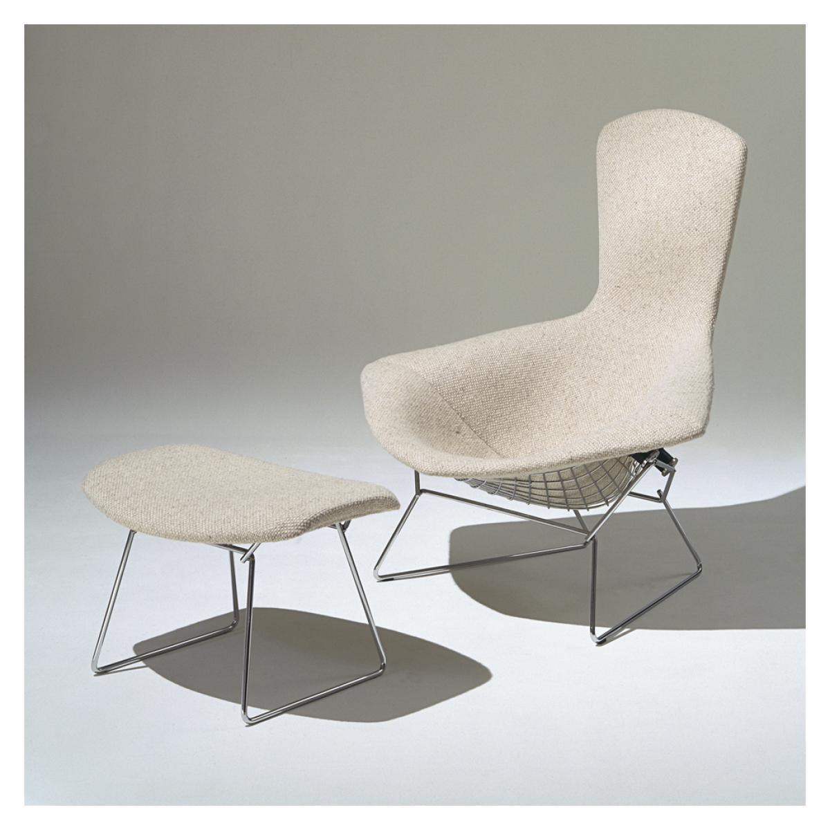 Described as a 'study in space, form and function', Harry Bertoia's 1952 Bird Armchair and Ottoman have become icons of 20th century furniture, and yet continue to feel as radical and modern today as they did when Knoll first produced the chairs over 60 years ago. Upholstered here in super soft, densely woven Capraia fabric in a variety of hues, the Bertoia Bird Chair is as much a sculpture as it is a piece of furniture. With a welded steel frame, comprised of polished steel rods, the Bird Armchair forms part of Bertoia's legendary wire seating collection. The Bird Armchair’s high back lends additional support and an almost hammock-like seating position for optimum comfort and relaxation, while the accompanying ottoman allows the sitter to fully recline. Rubber buffers incorporated into the seat provide further flexibility. The Bird Armchair and Ottoman are timeless 21. St. Century design classics and would enhance any space with their sculptural lines and sumptuous materials.