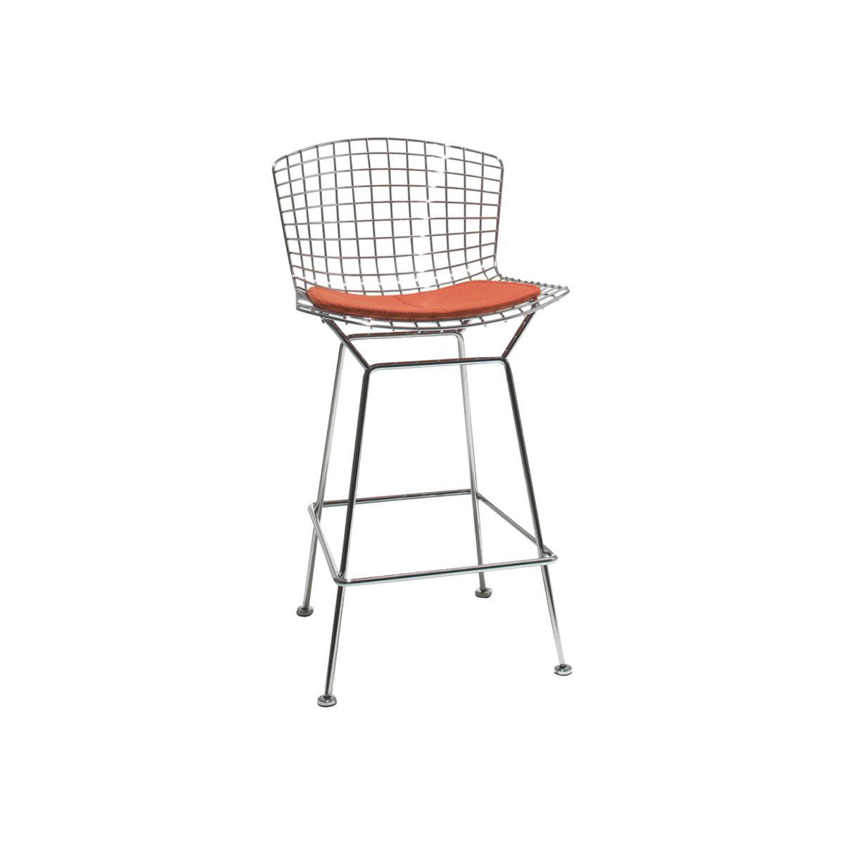 Part of Bertoia's 1952 Wire Chair Collection, this iconic Bertoia counter stool with Cato upholstery is a sculptural structure, with clean lines of chrome-finished steel rods constructing its mid-century modern form. Crafted from welded steel rods finished with polished chrome that make up the seat and base, the Bertoia stool's comfortable seat pad attaches with snap buttons and is upholstered in Cato fabric in an assortment of colours. Inspired by a hand-woven aesthetic, the Cato fabric that covers the seat pad was introduced in 1961 and is crafted from a wool-mix composition, with an exaggerated texture that creates the ultimate accent. With a Knoll stamp of authenticity on the back, this sculptural counter stool would lend a touch of artistry wherever you choose to place it, and is available with seat pads in fire red, brown, green, grey, ivory, natural and sand hues.