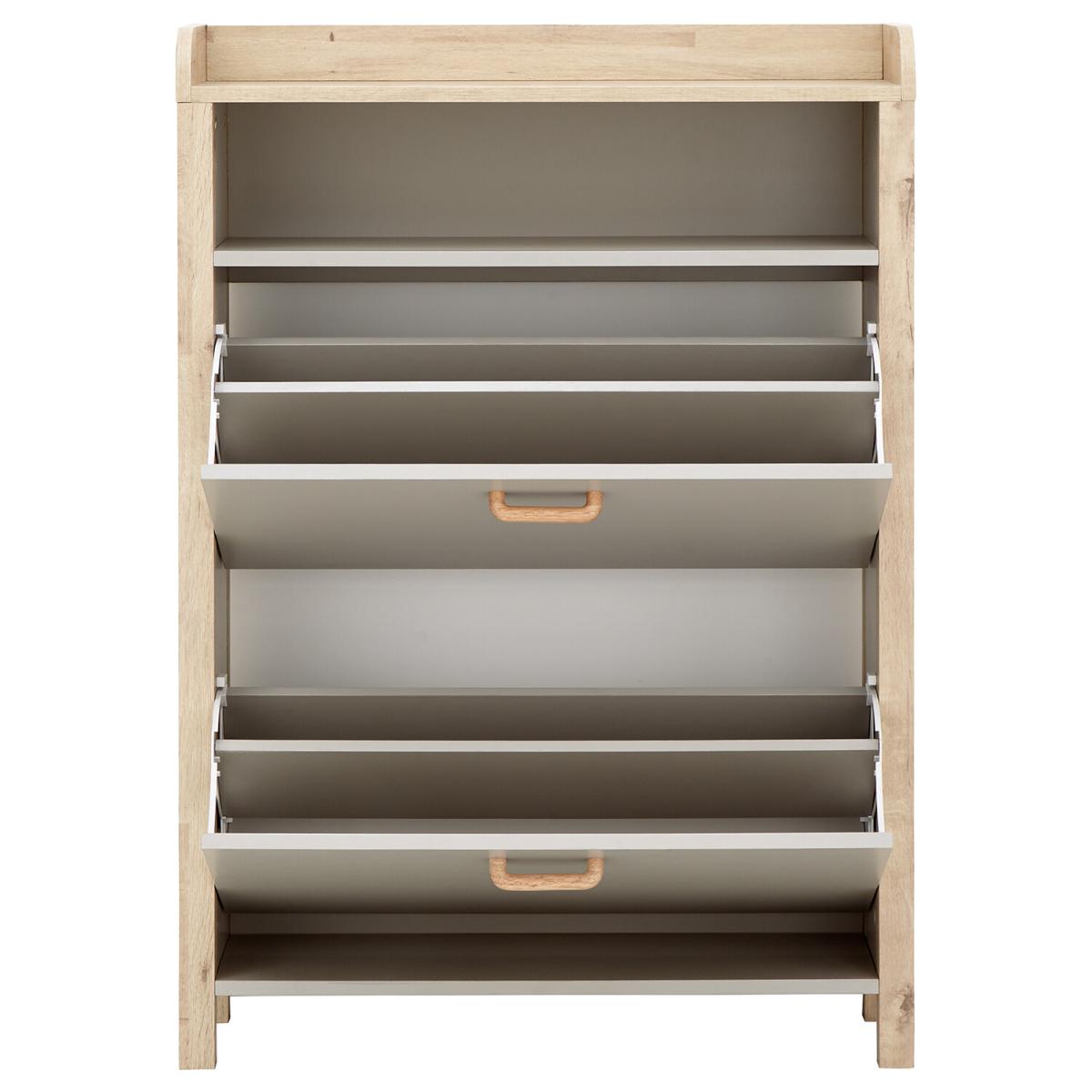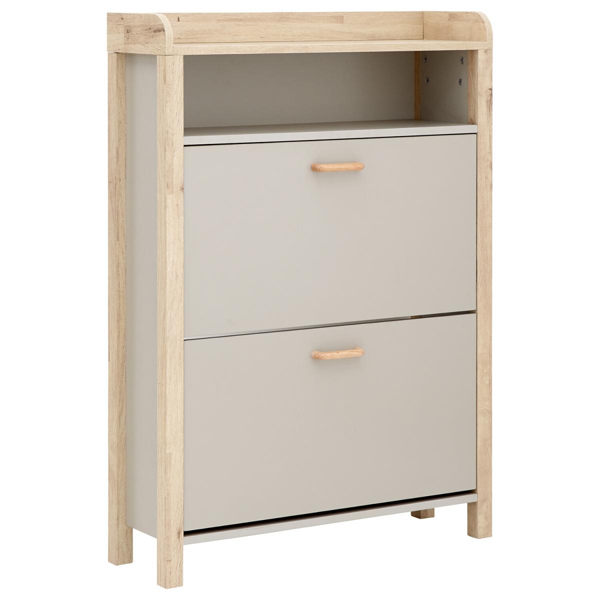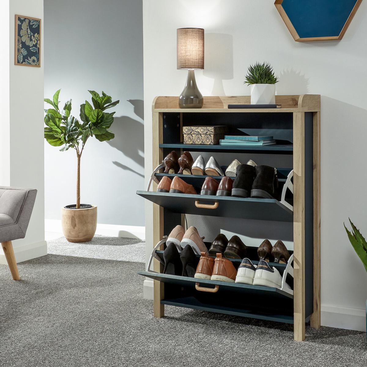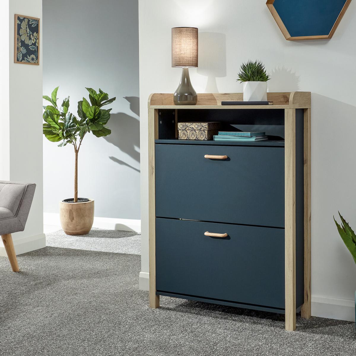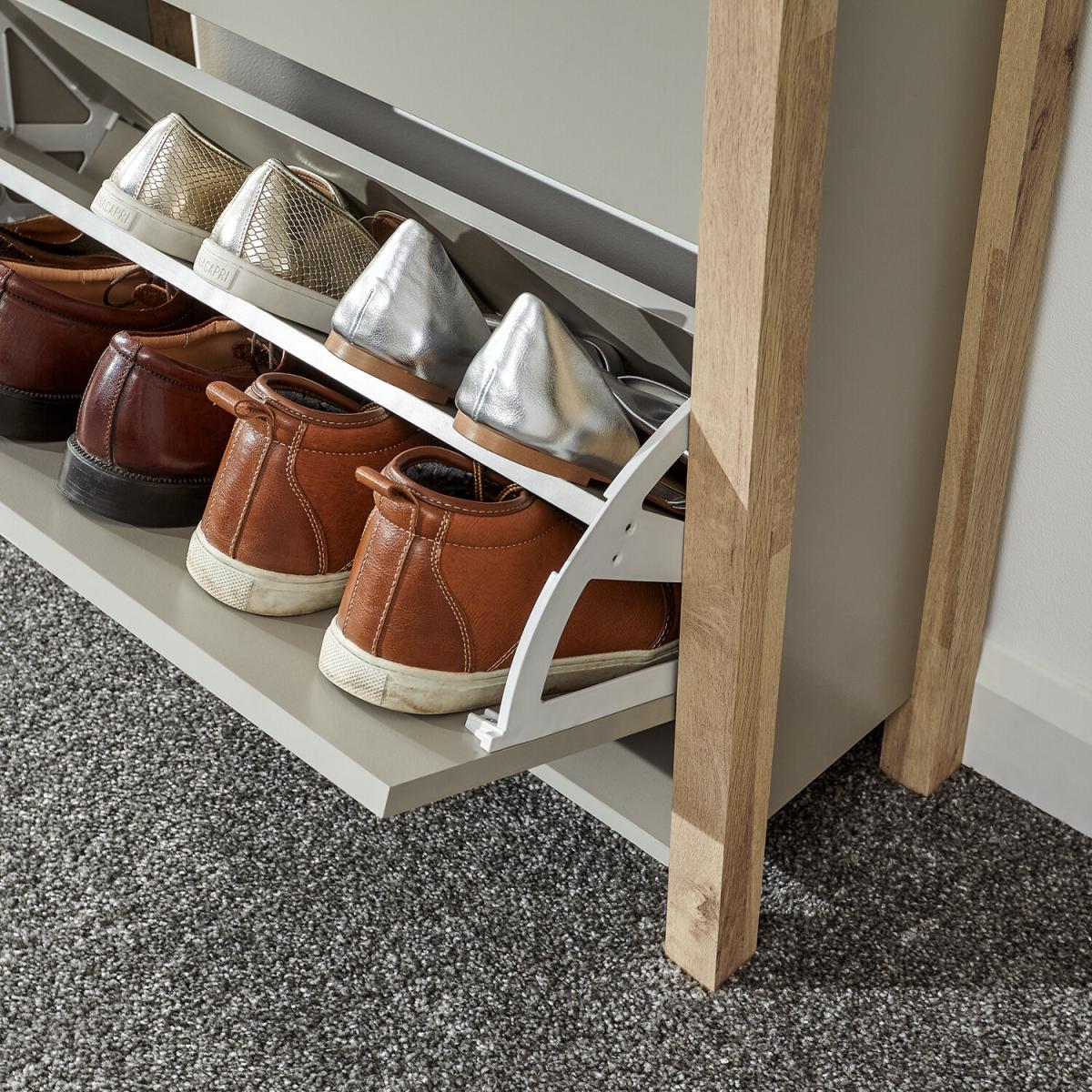 If you're looking for a hallway organisation solution that makes a stylish contemporary furnishing statement, the Berwich OT Shoe Cabinet is the smart choice. The cabinet's panels are finished in a choice of dark and light neutrals and completed by a light oak-effect frame, legs and solid wood handles that add warmth and character. The full-width open shelf is the ideal resting place for gloves, keys and outdoor accessories, while twin pull-down shoe compartments can each accommodate six pairs of standard size (UK10) Men's shoes - Twelve pairs in all. A well-designed furnishing piece with a practical purpose.