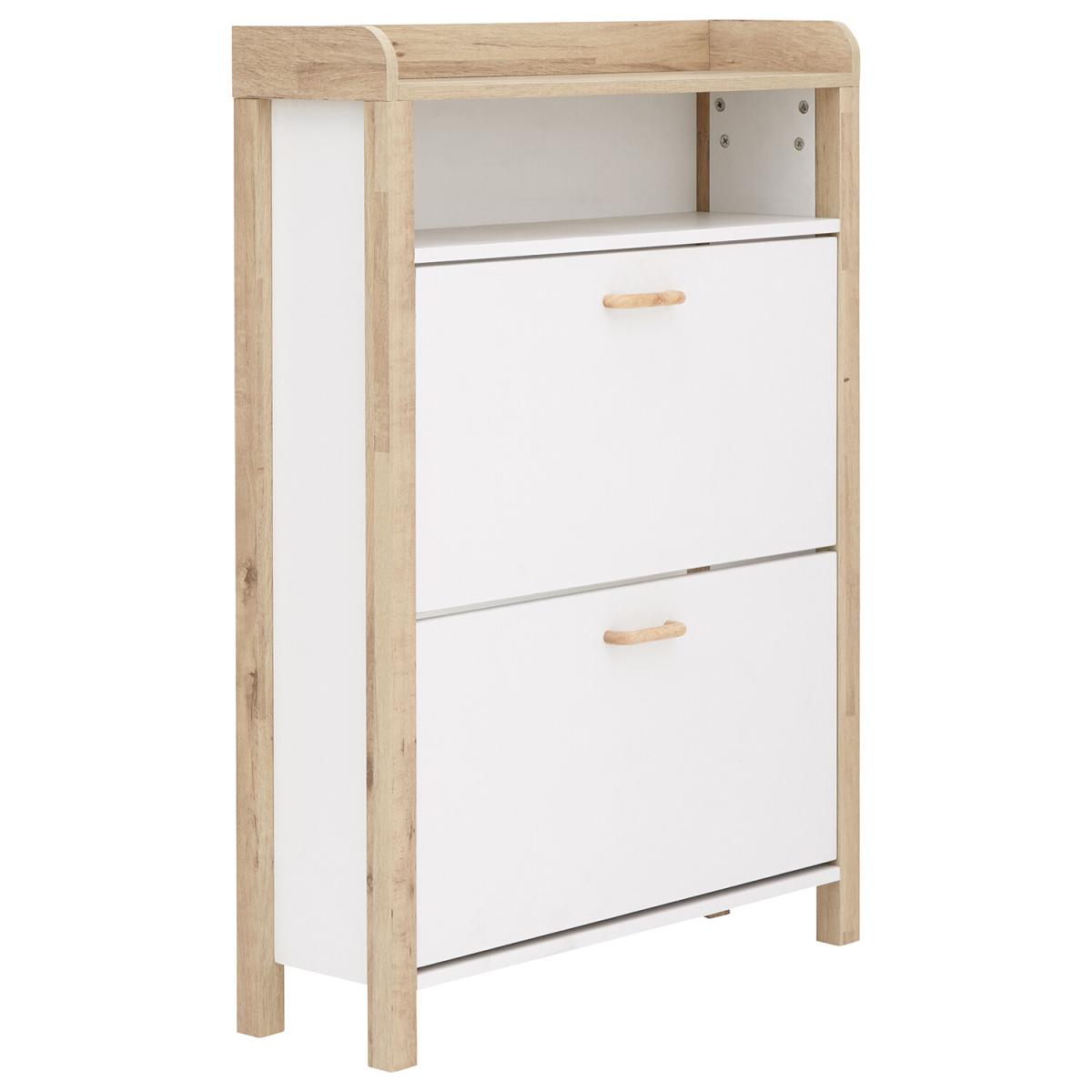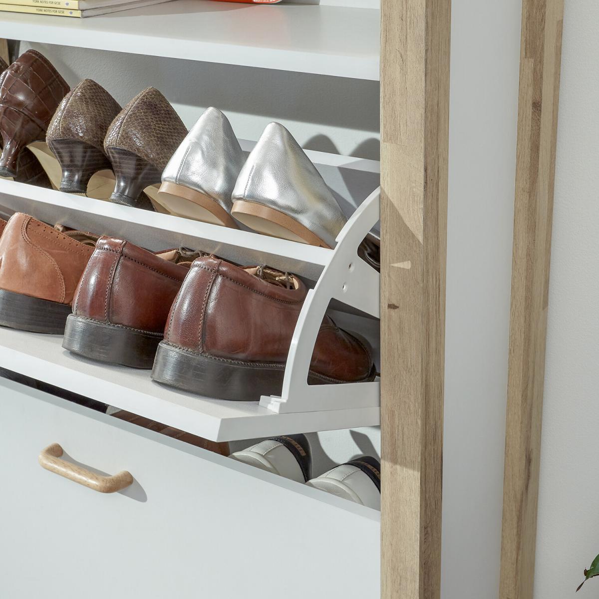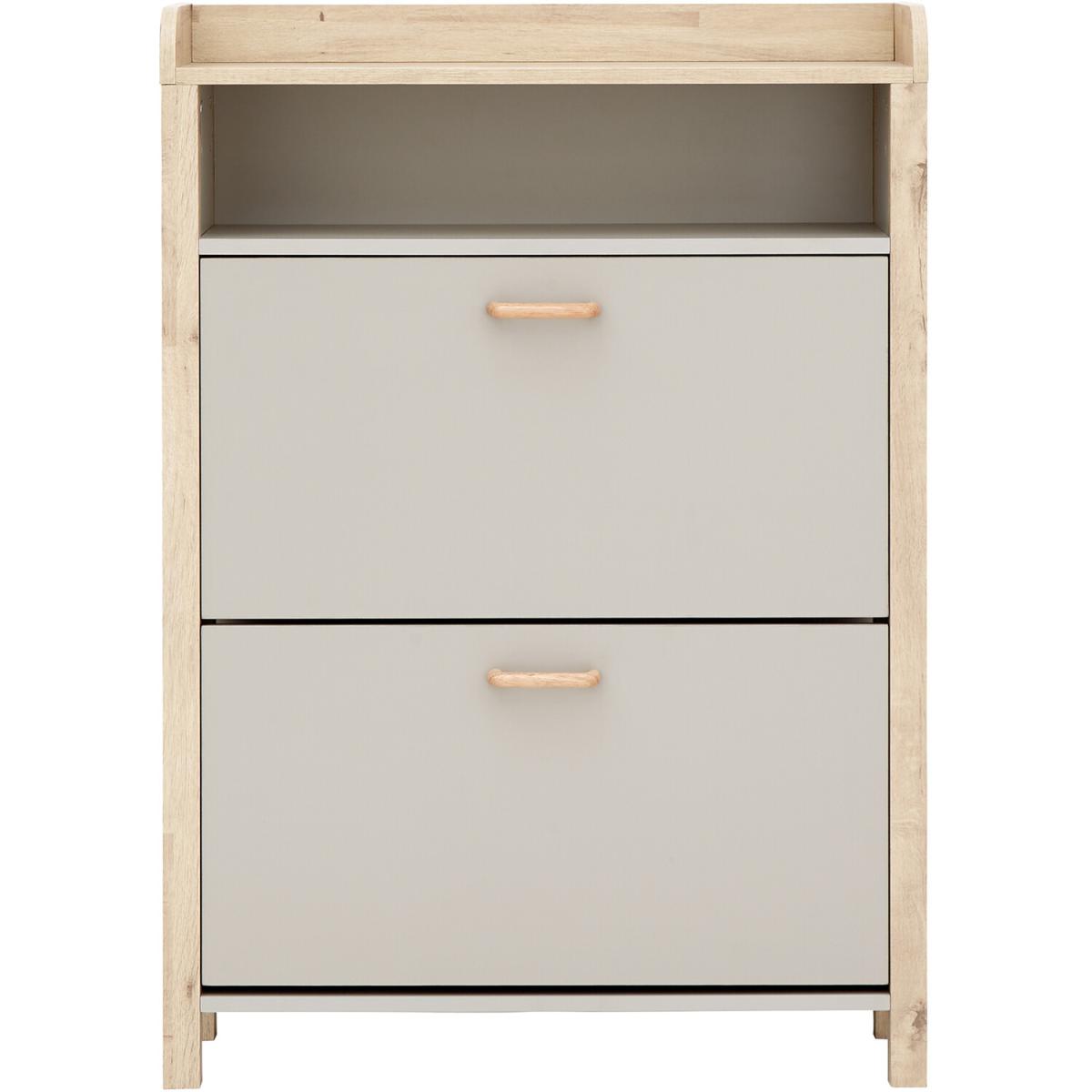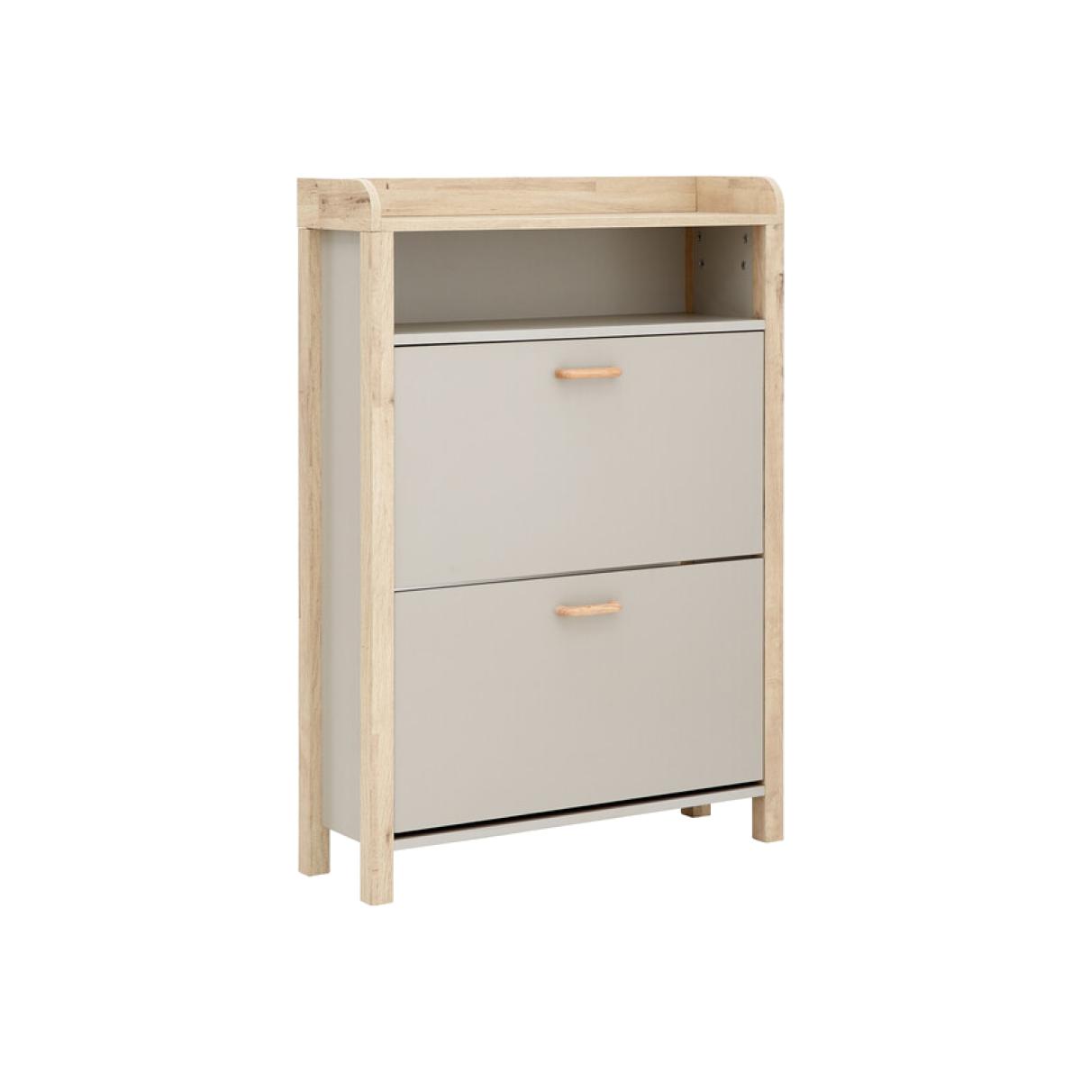 If you're looking for a hallway organisation solution that makes a stylish contemporary furnishing statement, the Berwich OT Shoe Cabinet is the smart choice. The cabinet's panels are finished in a choice of dark and light neutrals and completed by a light oak-effect frame, legs and solid wood handles that add warmth and character. The full-width open shelf is the ideal resting place for gloves, keys and outdoor accessories, while twin pull-down shoe compartments can each accommodate six pairs of standard size (UK10) Men's shoes - Twelve pairs in all. A well-designed furnishing piece with a practical purpose.