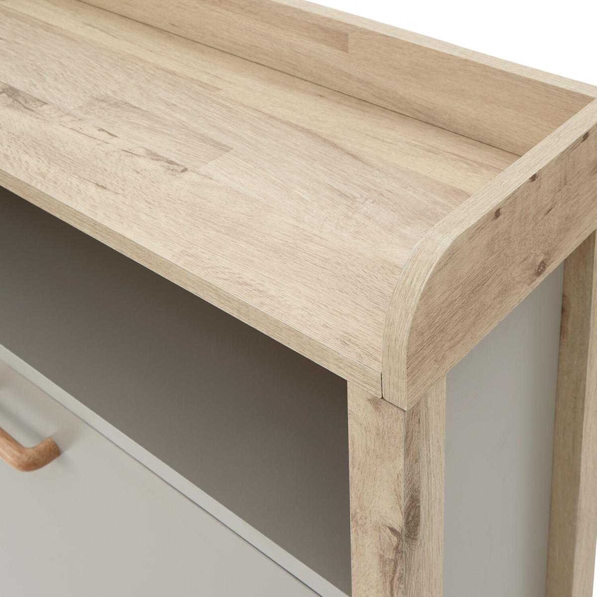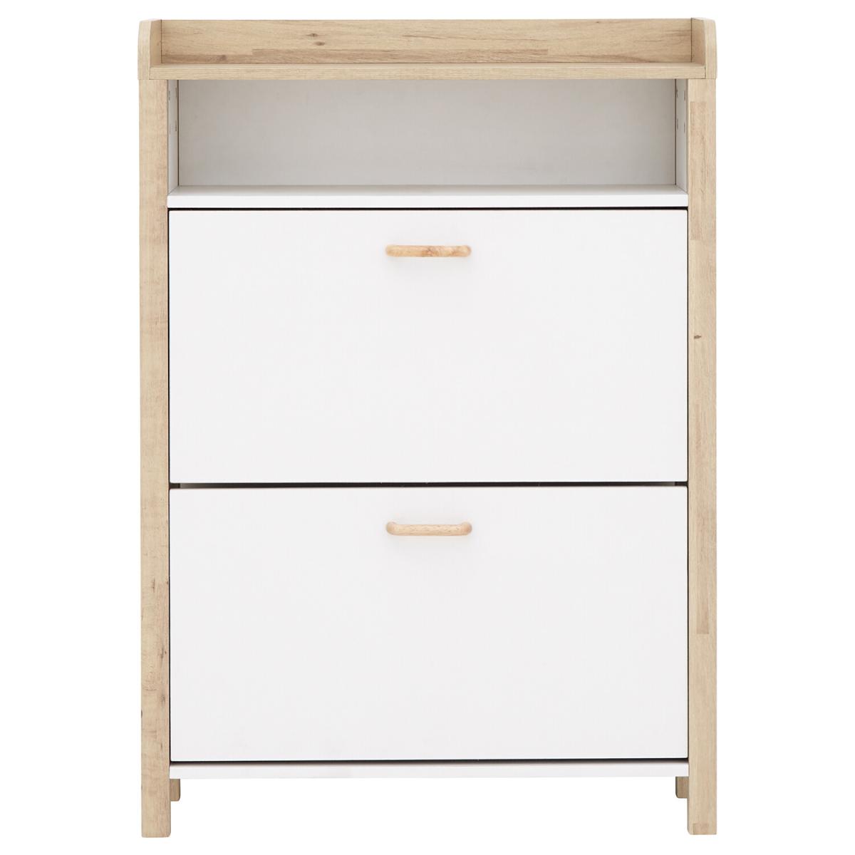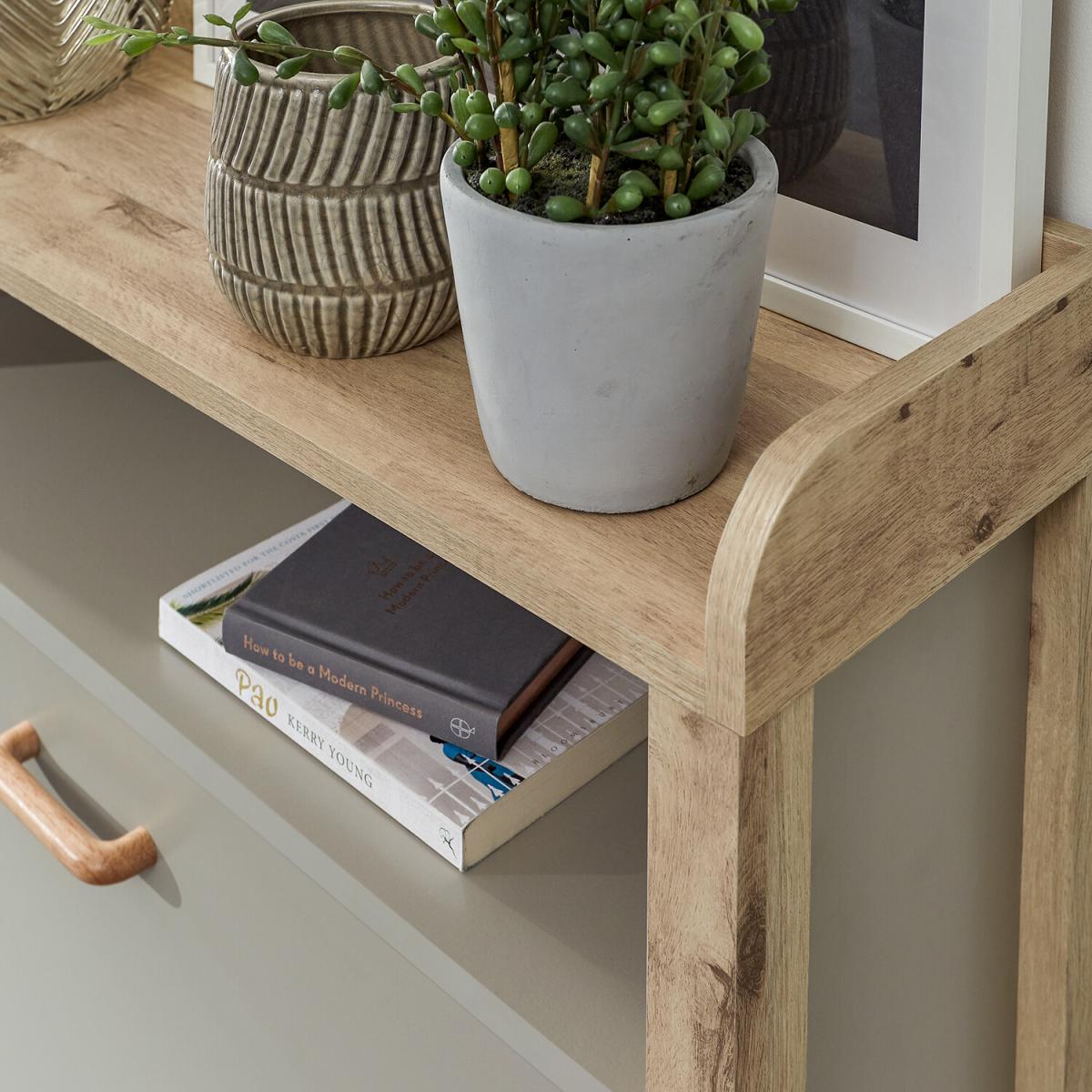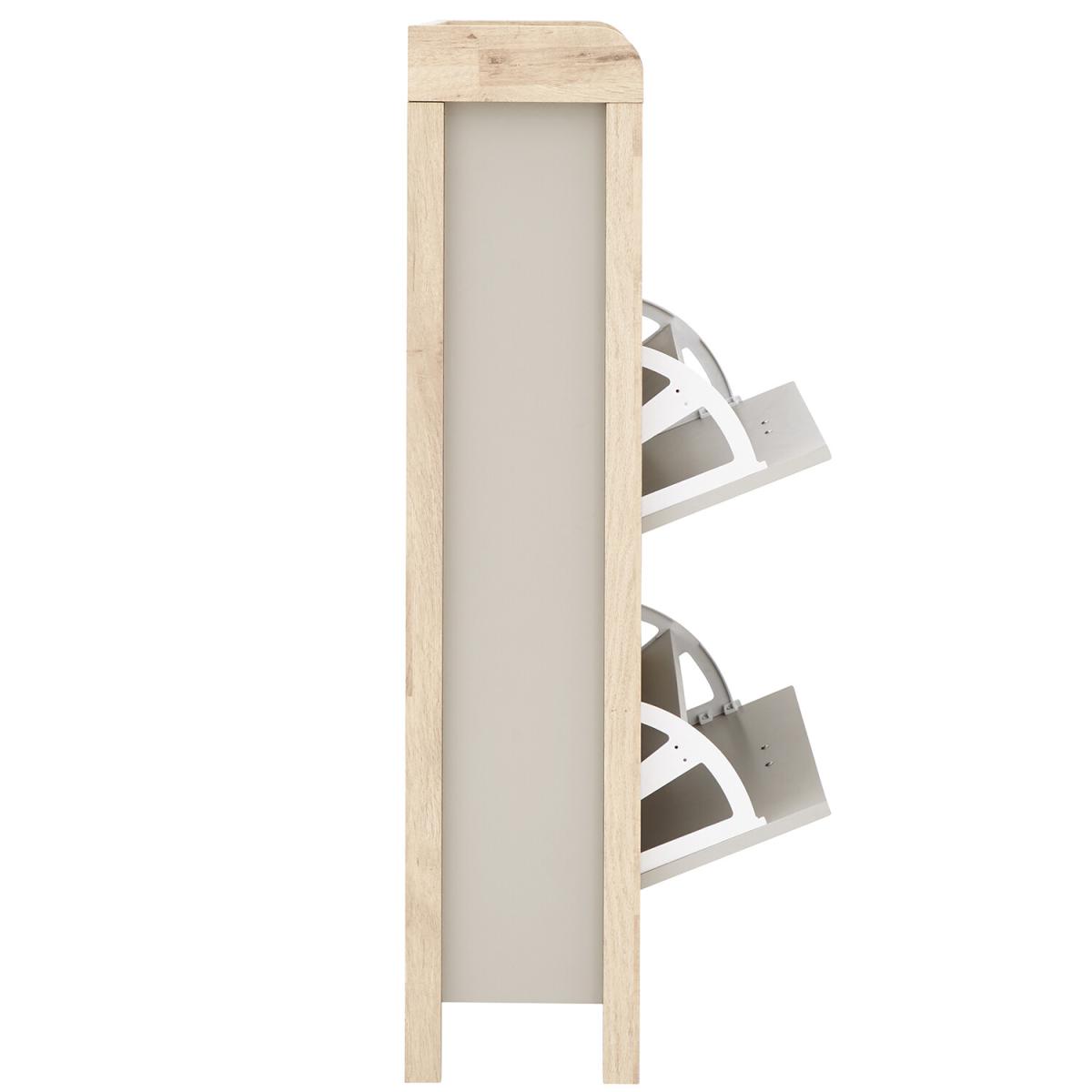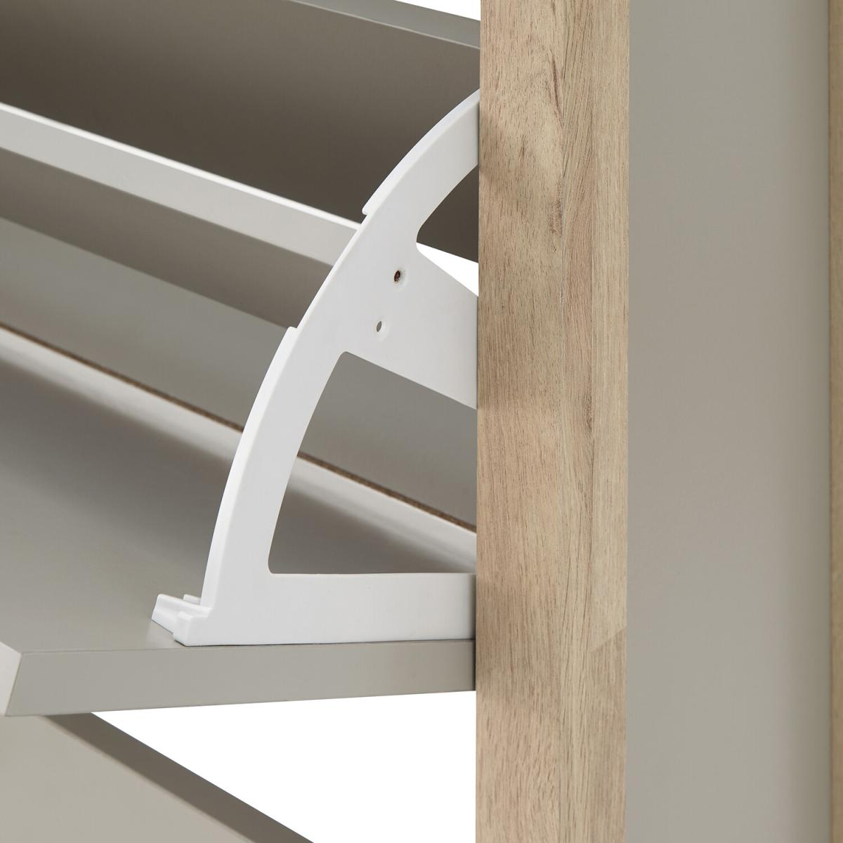 If you're looking for a hallway organisation solution that makes a stylish contemporary furnishing statement, the Berwich OT Shoe Cabinet is the smart choice. The cabinet's panels are finished in a choice of dark and light neutrals and completed by a light oak-effect frame, legs and solid wood handles that add warmth and character. The full-width open shelf is the ideal resting place for gloves, keys and outdoor accessories, while twin pull-down shoe compartments can each accommodate six pairs of standard size (UK10) Men's shoes - Twelve pairs in all. A well-designed furnishing piece with a practical purpose.