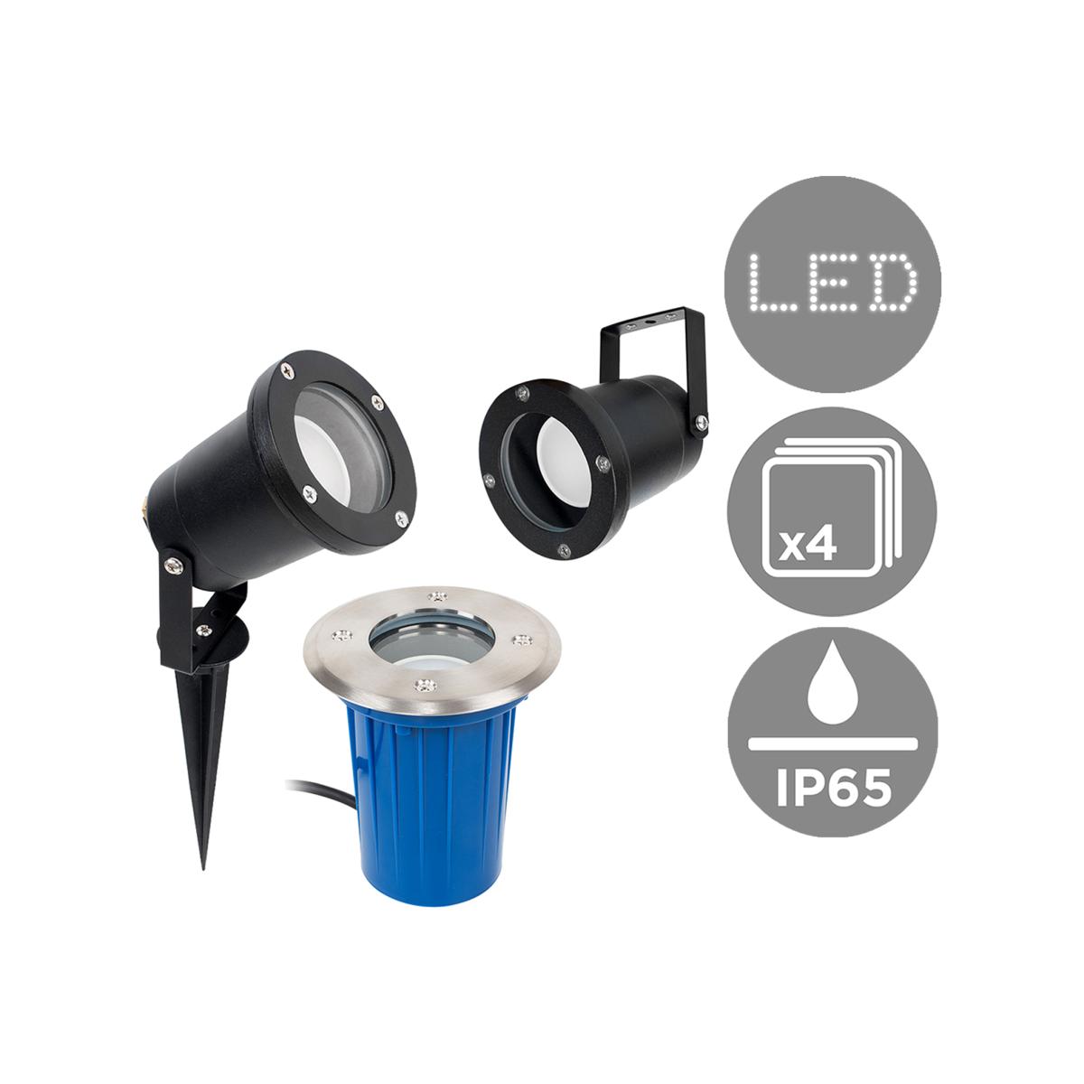 Pack of 4 - Modern 3 in 1 outdoor garden lights in a black finish with an approx. 1.5m of cable each. Lights can be used in the ground as a walk over light, on the wall as a spotlight, or in the ground as a spike light. An ideal product to help create a warm and inviting glow to your external walls, or a great way to add outdoor decorative lighting to your home. Please note this is one lighting unit that can be installed three separate ways. Comes supplied with an insulated case for in ground installation and a silver stainless steel cap to change the appearance of the lights.