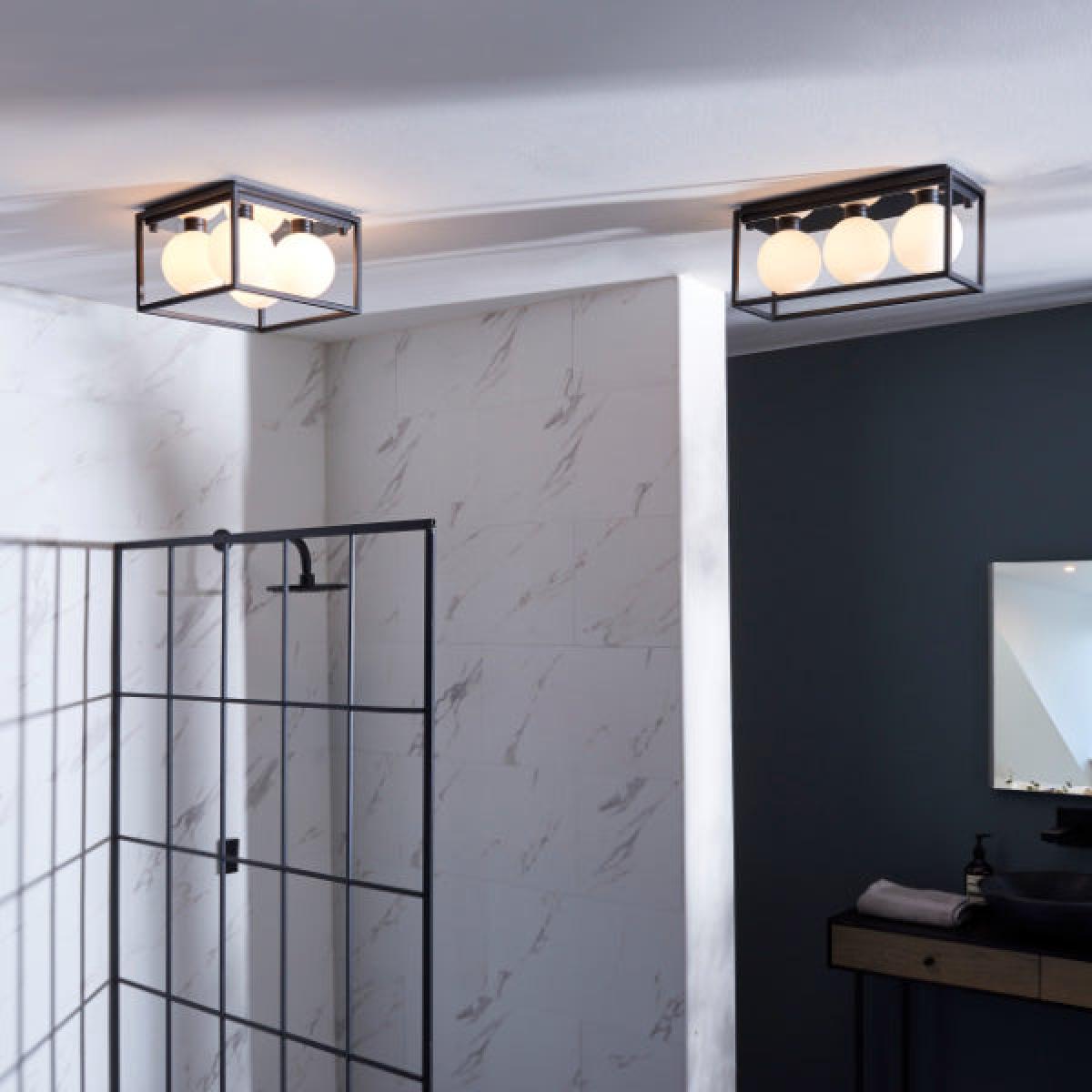 Modern IP44 matt black ceiling light Designed with lower ceilings in mind, create a statement in your home without compromising on space. The ceiling light features a matt black box and opal glass shades. The perfect light to complement any bathroom interior. Modern IP44 matt black ceiling light Designed with lower ceilings in mind, create a statement in your home without compromising on space. The ceiling light features a matt black box and opal glass shades. The perfect light to complement any bathroom interior.